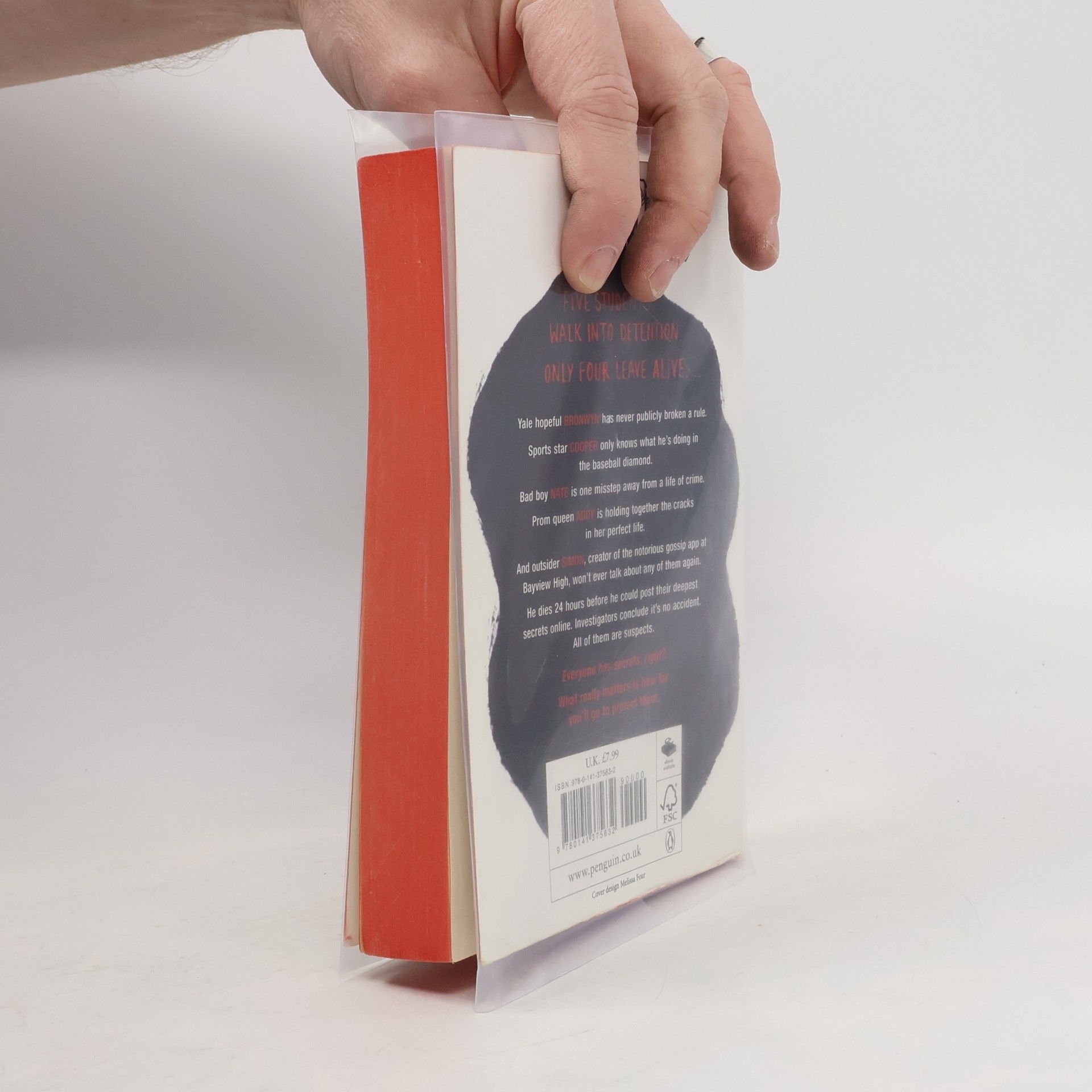 On Thursday afternoon, five students at Bayview High walk into detention. Bronwyn,the brain, is Yale-bound and never breaks a rule. Addy, the beauty, is the picture-perfect homecoming princess. Nate,the criminal,is already on probation for dealing. Cooper,the athlete,is the all-star baseball pitcher. And Simon,the outcast,is the creator of Bayview High's notorious gossip app. Only, Simon never makes it out of that classroom. Before the end of detention, Simon's dead. And according to investi-gators, his death wasn't an accident. On Thursday, he died. But on Friday, he'd planned to post juicy reveals about all four of his high-profile classmates, which makes all four of them suspects in his murder. Or are they just the perfect patsies for a killer who's still on the loose? Everyone has secrets, right? What really matters is how far you would go to protect them.