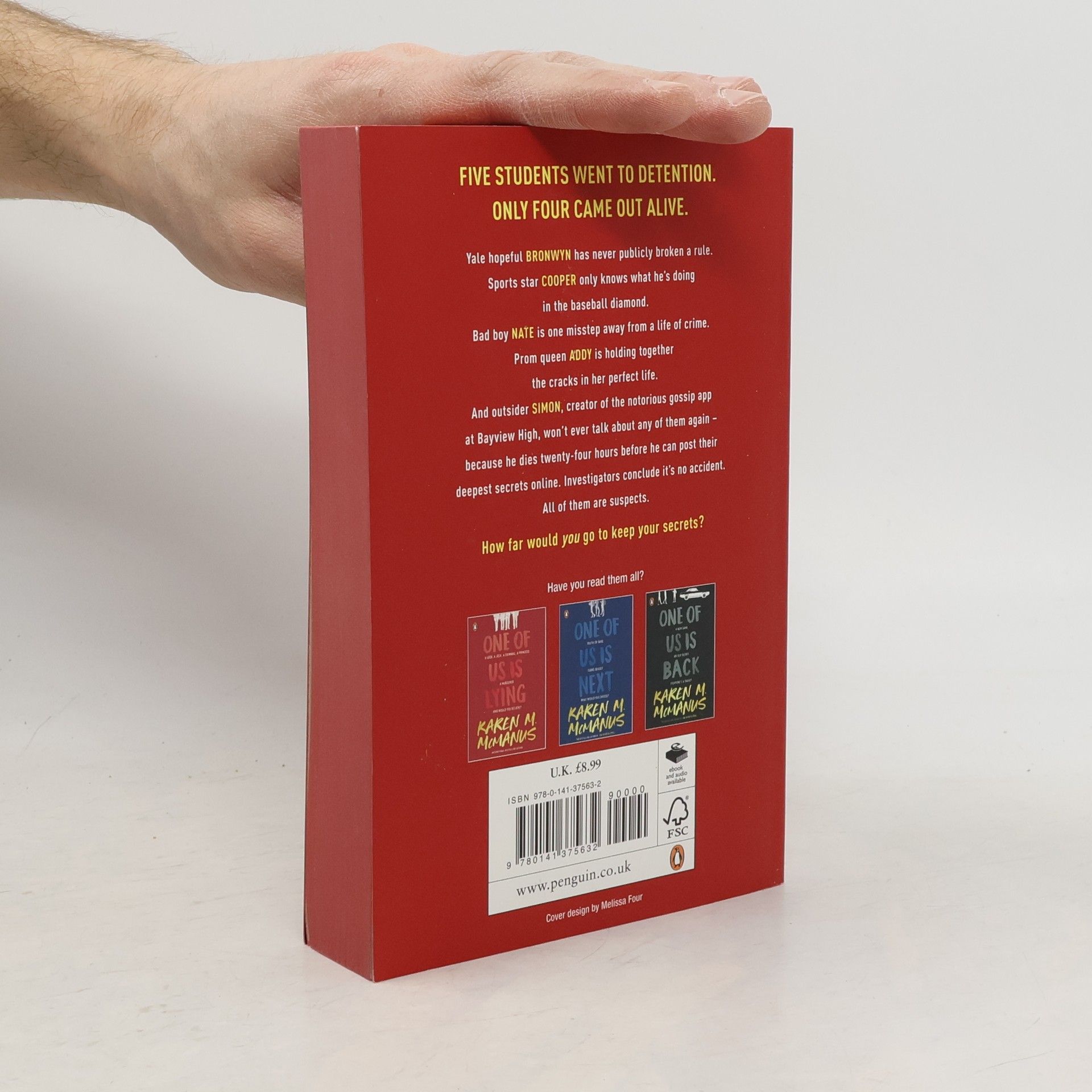On Thursday afternoon, five students at Bayview High walk into detention. Bronwyn,the brain, is Yale-bound and never breaks a rule. Addy, the beauty, is the picture-perfect homecoming princess. Nate,the criminal,is already on probation for dealing. Cooper,the athlete,is the all-star baseball pitcher. And Simon,the outcast,is the creator of Bayview High's notorious gossip app. Only, Simon never makes it out of that classroom. Before the end of detention, Simon's dead. And according to investi-gators, his death wasn't an accident. On Thursday, he died. But on Friday, he'd planned to post juicy reveals about all four of his high-profile classmates, which makes all four of them suspects in his murder. Or are they just the perfect patsies for a killer who's still on the loose? Everyone has secrets, right? What really matters is how far you would go to protect them.