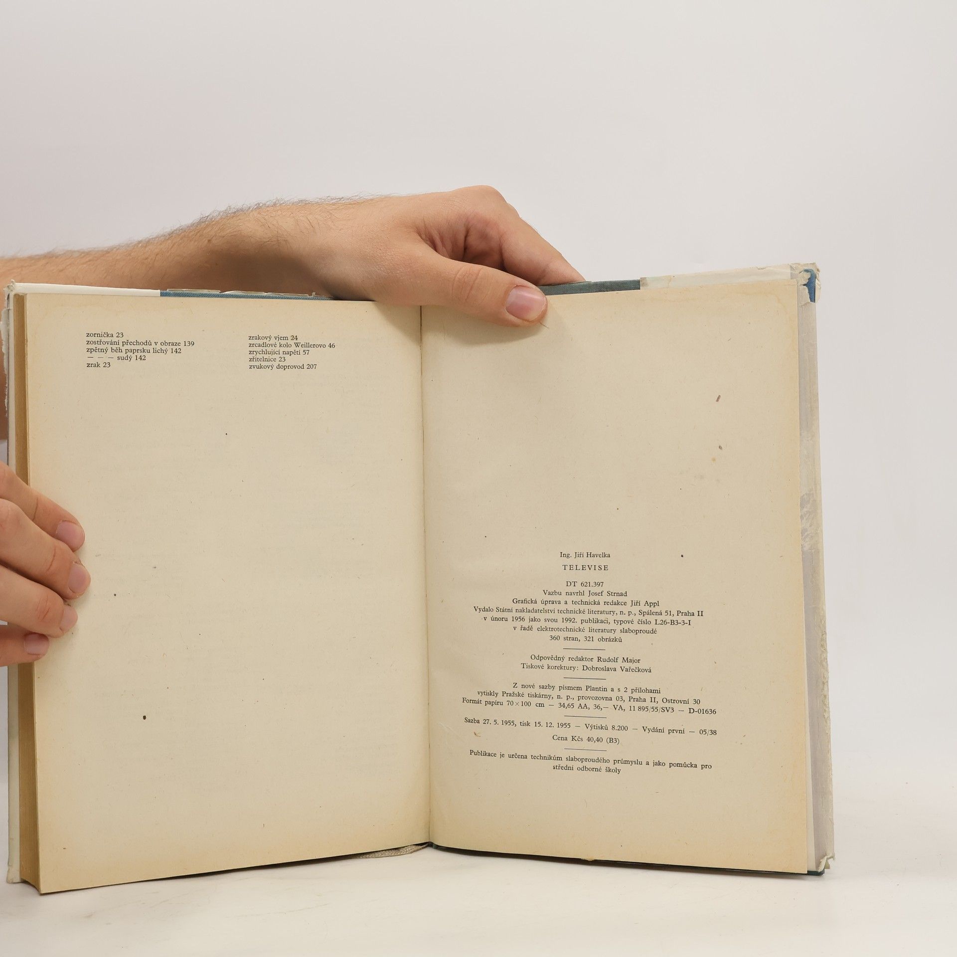 Asi rok od doby, kdy na 1. máje 1953 bylo u nás zahájeno televizní vysílání, vydal autor, známý odborník v slaboproudé technice, svůj populární výklad o televizi. Přítomná práce je však již obsáhlým, souborným dílem v této naší odborné literatuře, které pojednává zevrubně o televizní technice od podstaty, přenosu a příjmu až k možnostem dalšího vývoje v budoucnosti. Od přeměny světelných impulsů v elektrické, od obrazovek až k barevné a plastické televizi a využití televize v průmyslu a vědě, v knize je podán také popis prvního čs. televizního přijímače, který se počal u nás seriově vyrábět.