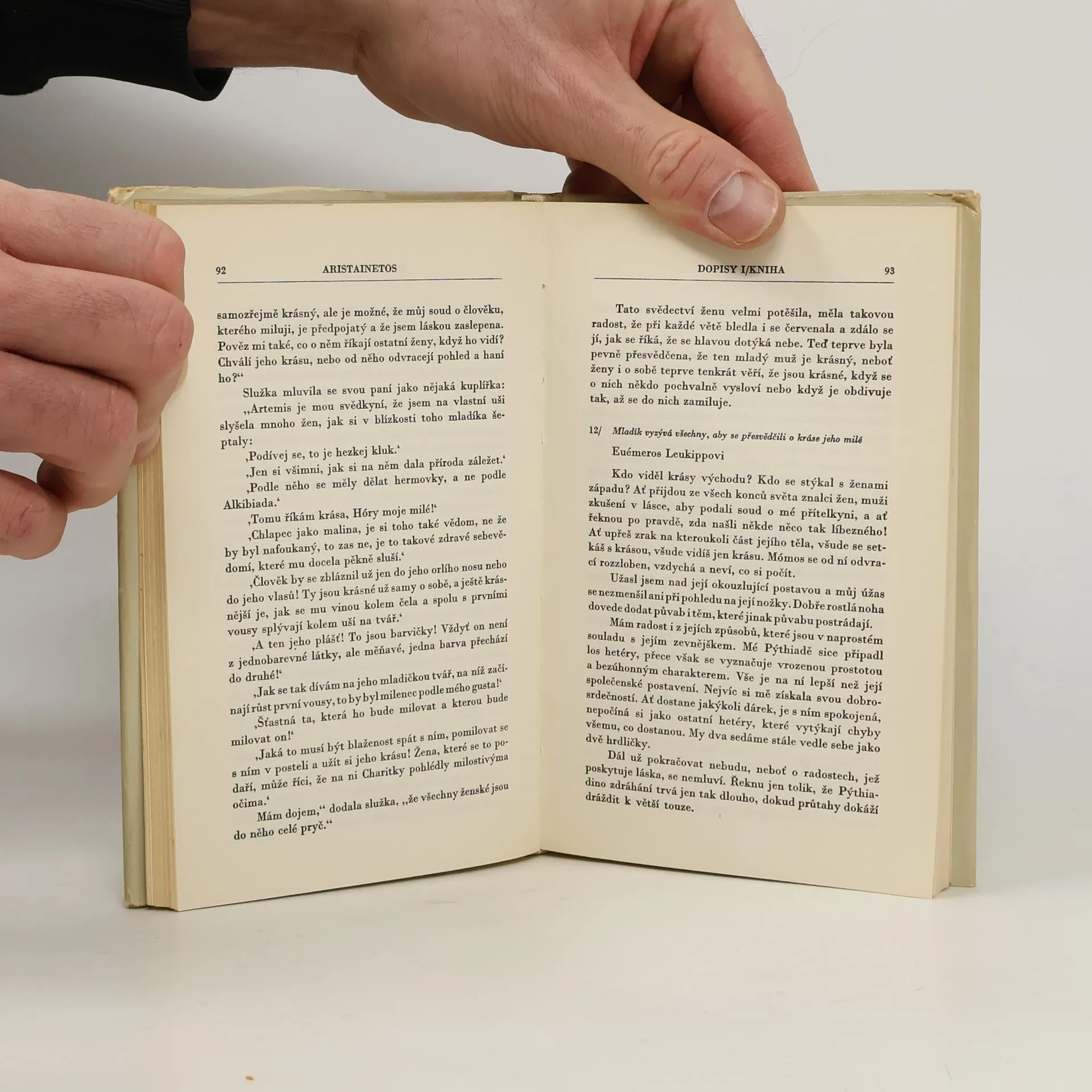 Ailiános: Z dopisů, Alkifrón: Dopisy rybářů, Dopisy vesničanů, Dopisy příživníků, Dopisy hetér, Aristainetos: Dopisy, Filostratos: Milostné dopisy, Lúkiános: Hovory hetér, Theofylaktos: Z dopisů. Milostné dopisy hetér patří k pozdním výtvorům řecké literatury. Jsou to elegantně a pikatně líčené scény řeckého života a představují nesmírně cenný kulturně historický pramen k poznání soukromého života řeckého člověka. Známe jména bezmála sto padesáti řeckých hetér – kněžen lásky –, jejichž milostné listy nic neztratily na svém půvabu dodnes. Vždyť kromě pouličních holek bylo mezi nimi mnoho mladých žen, které absolvovaly zvláštní školy pro hetéry, osvojily si bezvadné společenské chování, dovedly zpívat, tančit, hrát na různé nástroje, ale vyznaly se i v literatuře a ve filosofii. Není divu, že hetéry byly pro své estetické i etické hodnoty nezřídka i trvale milovány. Názor tehdejší společnosti na tyto umělkyně lásky, oddávající se mužům sice za peníze, ale většinou podle vlastního zalíbení, nebyl dotčen pokřivujícím vztahem soukromého vlastníka k bytosti hmotně i duchovně podřízené. V této rozkošné knížce milostné korespondence hetér se zvlášť zřetelně zrcadlí lidské vztahy ve světě antiky, vábící současného člověka, zmítaného rozpory moderní civilizace, svou kouzelnou bezprostředností a otevřeností.
