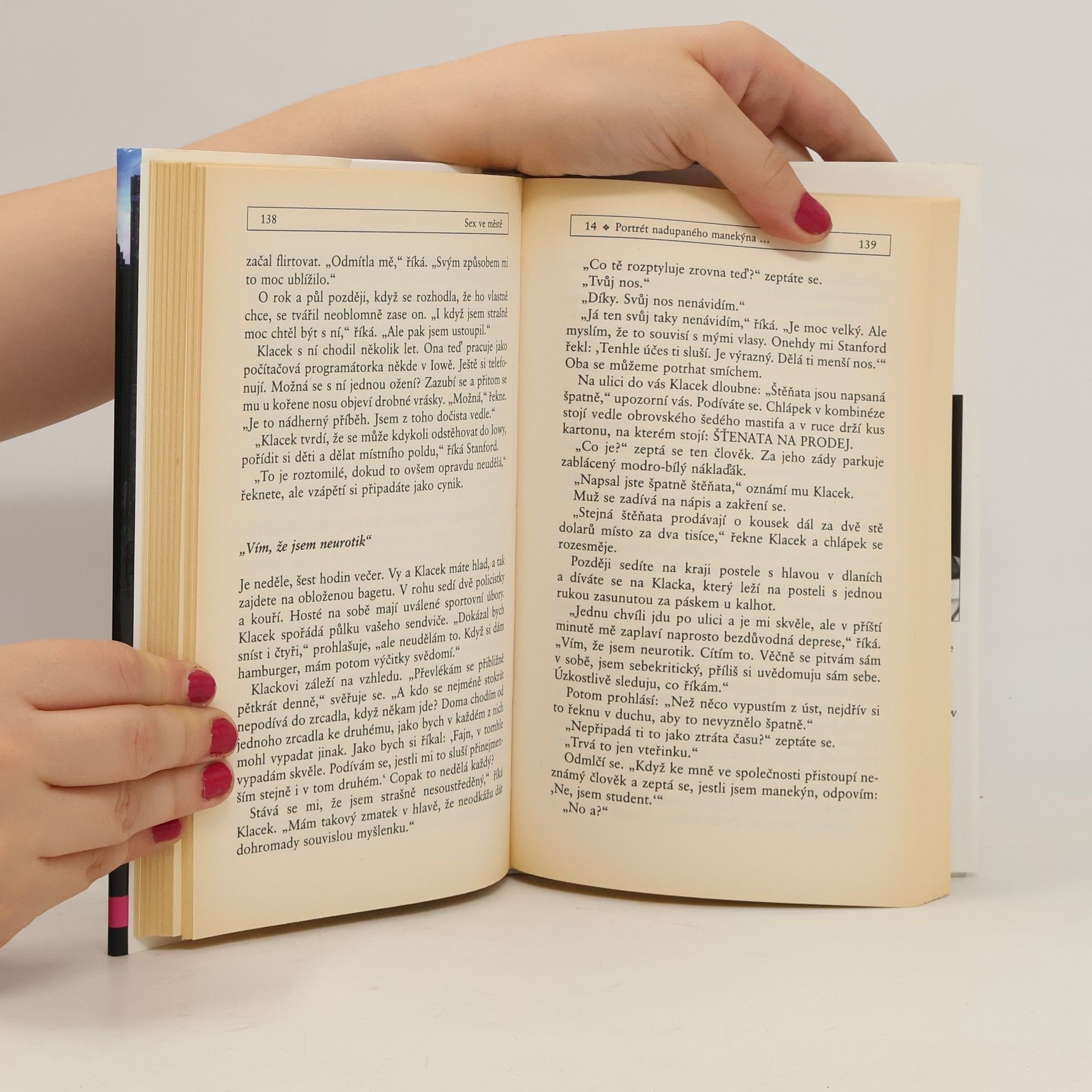 Kdo z nás by alespoň jednou nechtěl nahlédnout do světa bohatých a slavných, podívat se do jejich přepychových bungalovů a – jen si to přiznejme! – jedním okem nakouknout do ložnice. Copak se tam asi tak odehrává? Divoké, bujné milování jako z erotického časopisu, anebo snad stejná manželská nuda jako kdekoli jinde? Candace Bushnellová pro nás tu pomyslnou špehýrku otevírá a pohled na milostná kolbiště svých bližních ještě svým zábavným a ironickým způsobem komentuje. Se svým příznačným humorem nám představí „mladé a krásné“ lidi, kteří táhnou z večírků do barů a klubů, v létě jezdí do přepychových přímořských letovisek a v zimě na lyže. Carrie, prototyp ztrápené mladé spisovatelky, hledá lásku výhradně na nesprávných místech, a ne vždy vychází všechno podle jejích představ. Její přítelkyně Samantha, Miranda a Charlotte jsou také nadšenými lovkyněmi mužů a vždy jsou ochotny posloužit velice konkrétními radami. Fotogenické krasavice se slepičími mozečky balí kdekoho, neurotické maminy se vychloubají svými otřesnými dětmi a příkladnými manžílky, a všechny dohromady zajímá jen jedno jediné – sex.