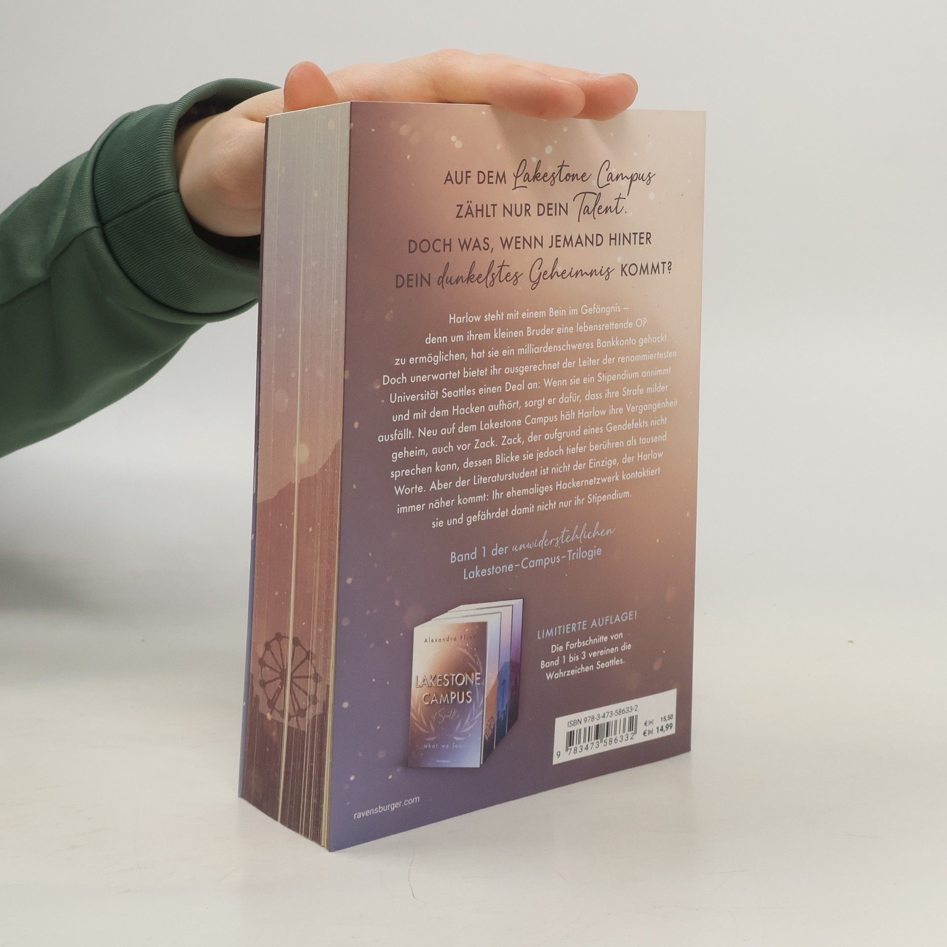***Limitierte Auflage mit farbigem Buchschnitt und Charakterkarte! Nur solange der Vorrat reicht!*** Harlow steht mit einem Bein im Gefängnis – denn um ihrem kleinen Bruder eine lebensrettende OP zu ermöglichen, hat sie ein milliardenschweres Bankkonto gehackt. Doch unerwartet bietet ihr der Leiter des Lakestone Campus in Seattle ein Stipendium und Sozialstunden an. Neu an der Uni hält Harlow ihre Vergangenheit geheim. Auch vor dem Literaturstudenten Zack, der aufgrund eines Gendefekts nicht sprechen kann. Aber nicht nur er kommt Harlow immer näher, sondern auch ihr ehemaliges Hackernetzwerk. Mitreißend. Knisternd. Unwiderstehlich. Band 1 der neuen New-Adult-Trilogie von SPIEGEL-Bestsellerautorin Alexandra Flint. Die Bücher der Lakestone-Campus-Reihe: Band 1: What We Fear Band 2: What We Lost (erscheint im Herbst 2024) Band 3: What We Hide (erscheint im Frühjahr 2025) Weitere knisternde New-Adult-Romance der Autorin bei Ravensburger: Maple-Creek-Dilogie Band 1: Meet Me in Maple Creek Band 2: Save Me in Maple Creek