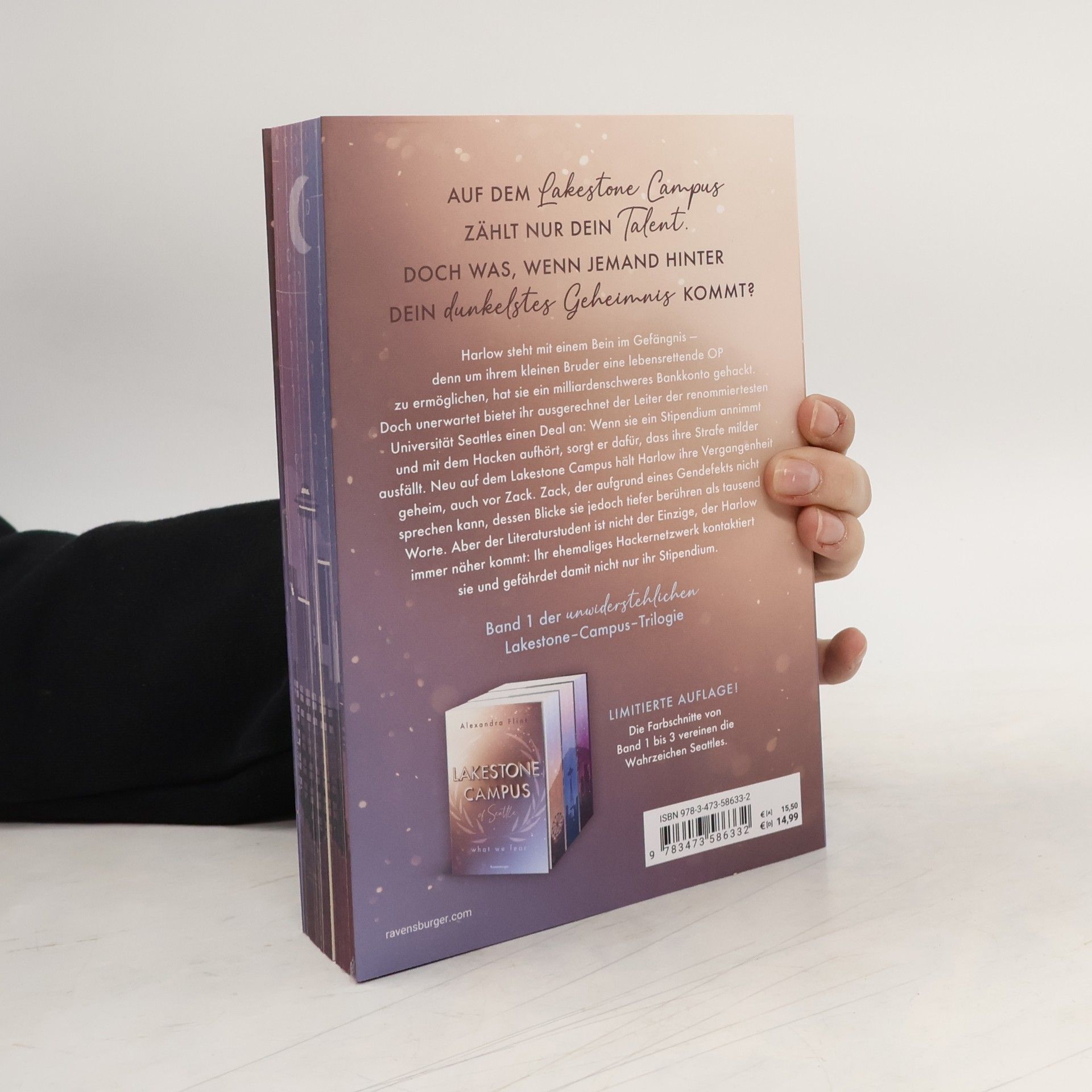 ***Limitierte Auflage mit farbigem Buchschnitt und Charakterkarte! Nur solange der Vorrat reicht!*** Harlow steht mit einem Bein im Gefängnis – denn um ihrem kleinen Bruder eine lebensrettende OP zu ermöglichen, hat sie ein milliardenschweres Bankkonto gehackt. Doch unerwartet bietet ihr der Leiter des Lakestone Campus in Seattle ein Stipendium und Sozialstunden an. Neu an der Uni hält Harlow ihre Vergangenheit geheim. Auch vor dem Literaturstudenten Zack, der aufgrund eines Gendefekts nicht sprechen kann. Aber nicht nur er kommt Harlow immer näher, sondern auch ihr ehemaliges Hackernetzwerk. Mitreißend. Knisternd. Unwiderstehlich. Band 1 der neuen New-Adult-Trilogie von SPIEGEL-Bestsellerautorin Alexandra Flint. Die Bücher der Lakestone-Campus-Reihe: Band 1: What We Fear Band 2: What We Lost (erscheint im Herbst 2024) Band 3: What We Hide (erscheint im Frühjahr 2025) Weitere knisternde New-Adult-Romance der Autorin bei Ravensburger: Maple-Creek-Dilogie Band 1: Meet Me in Maple Creek Band 2: Save Me in Maple Creek