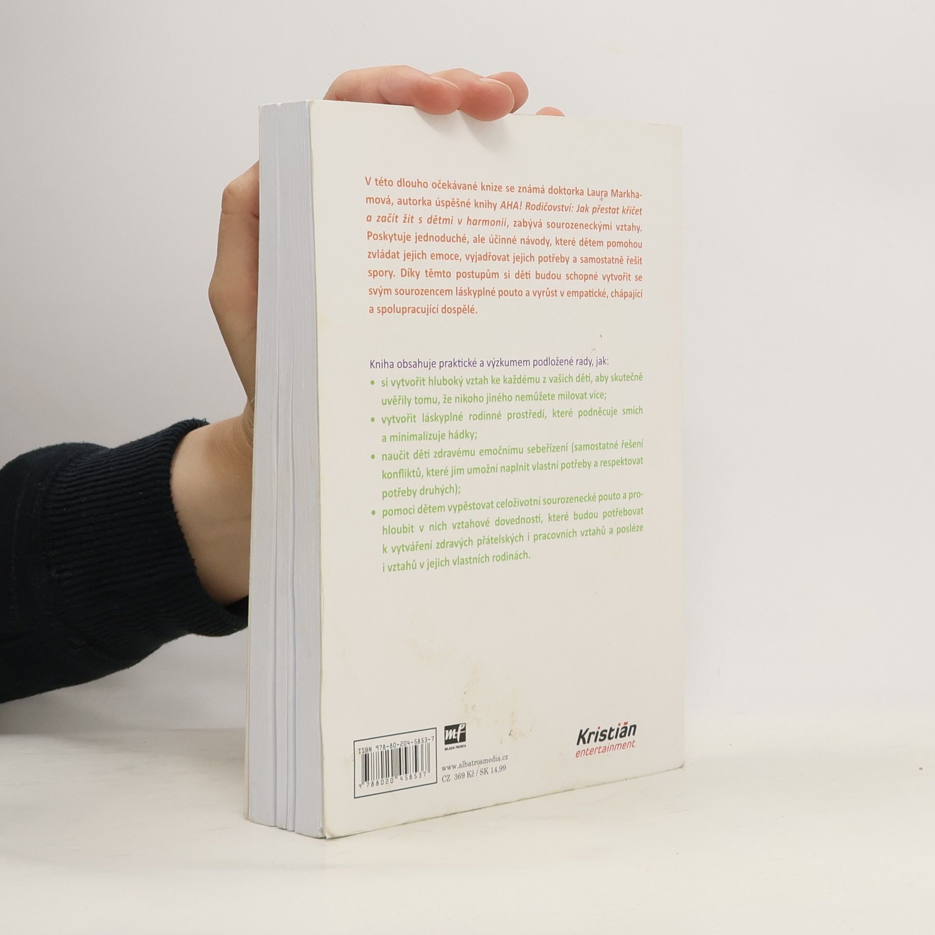 Jak zabránit sporům mezi sourozenci a vychovat z nich přátele na celý život. V této dlouho očekávané knize se známá doktorka Laura Markhamová, autorka úspěšné knihy AHA! Rodičovství: Jak přestat křičet a začít s dětmi žít v harmonii, zabývá sourozeneckými vztahy. Poskytuje jednoduché, ale účinné návody, které dětem pomohou zvládat jejich emoce, vyjadřovat jejich potřeby a samostatně řešit spory. Díky těmto postupům si děti budou schopné vytvořit se svým sourozencem láskyplné pouto a vyrůst v empatické, chápající a spolupracující dospělé. Kniha obsahuje praktické a výzkumem podložené rady, jak: - si vytvořit hluboký vztah ke každému z vašich dětí, aby skutečně uvěřily tomu, že nikoho jiného nemůžete milovat více; - vytvořit láskyplné rodinné prostředí, které podněcuje smích a minimalizuje hádky; - naučit děti zdravému emočnímu sebeřízení (samostatné řešení konfliktů, které jim umožní naplnit vlastní potřeby a respektovat potřeby druhých); - pomoci dětem vypěstovat celoživotní sourozenecké pouto a prohloubit v nich vztahové dovednosti, které budou potřebovat k vytváření zdravých přátelských i pracovních vztahů a posléze i vztahů v jejich vlastních rodinách.