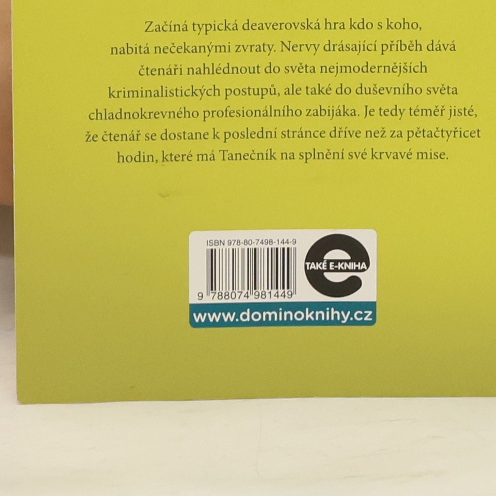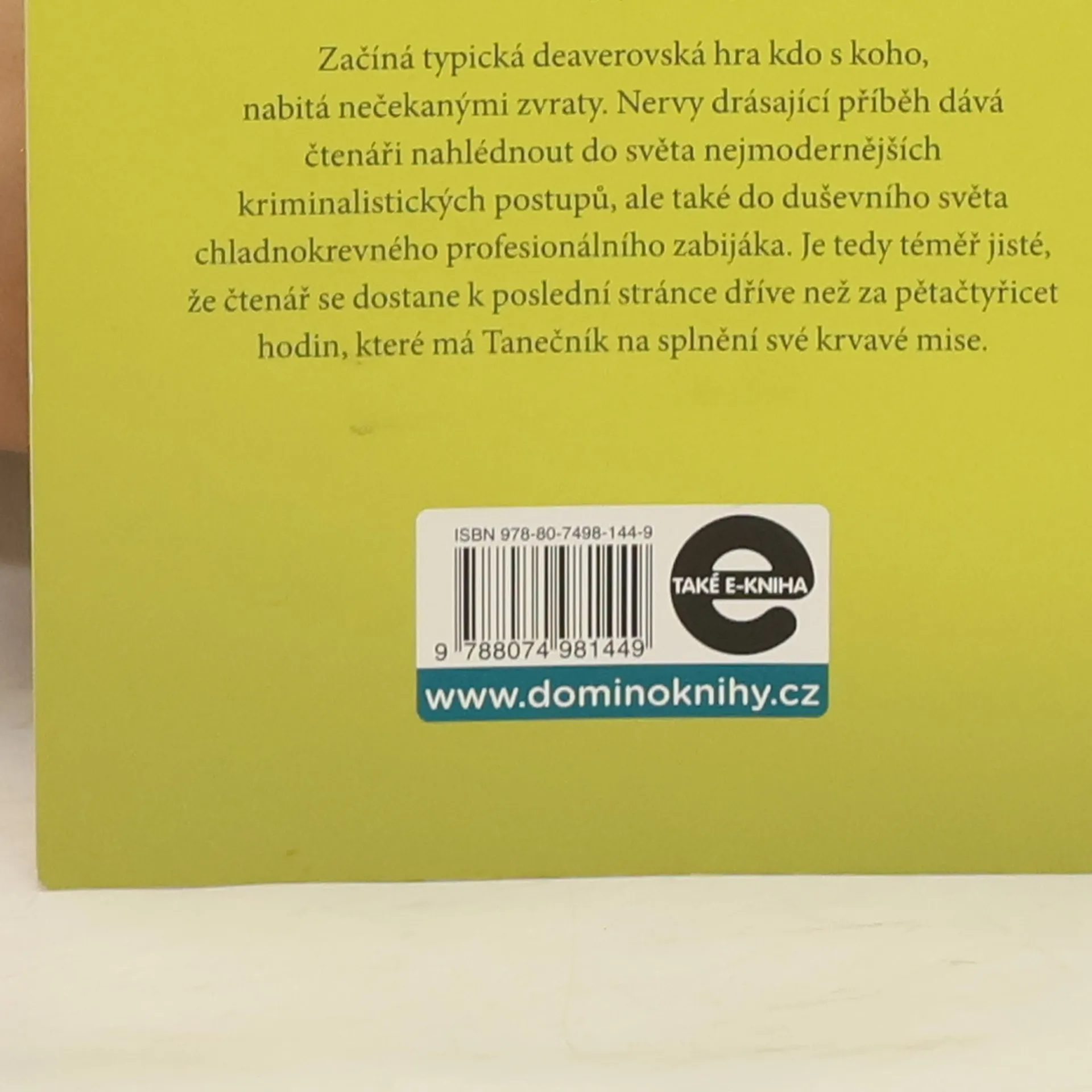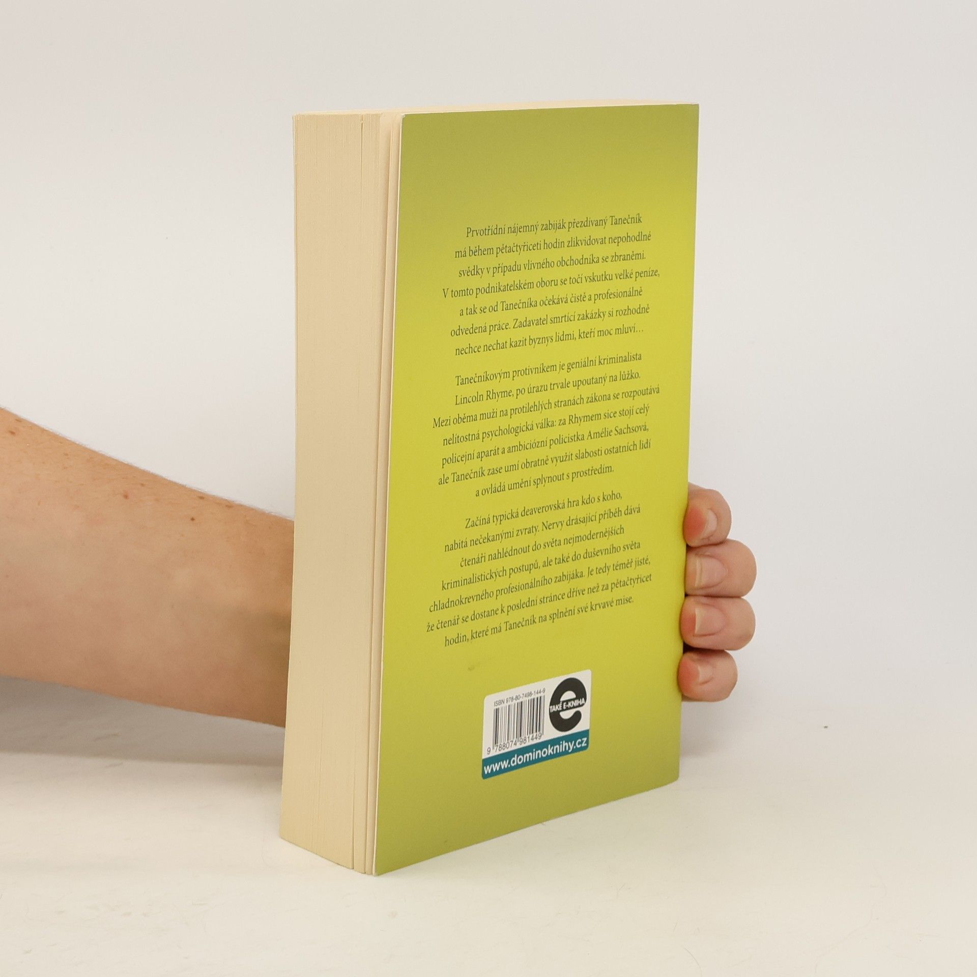 Geniální kriminalista Lincoln Rhyme a mladá policistka Amélie Sachsová, kteří se čtenářům poprvé představili v bestselleru Sběratel kostí, řeší další zapeklitý případ: během pětačtyřiceti hodin musejí vypátrat profesionálního vraha, přezdívaného Tanečník. Tanečník má v této lhůtě zlikvidovat tři nepohodlné svědky v případu vlivného obchodníka se zbraněmi a již od prvního okamžiku nenechává nikoho na pochybách, že si důvtipem a inteligencí nezadá s Rhymem. Mezi oběma muži se na dálku rozpoutá nelítostná psychologická válka, plná zvratů a úskoků, která se neobejde bez těžkých ztrát na životech. Nervy drásající příběh dává nahlédnout do zákulisí americké policejní praxe a zároveň je brilantní sondou do duševního světa chladnokrevného zabijáka. V publikaci uvedeno chybně vydání třetí, správně je: vydání čtvrté