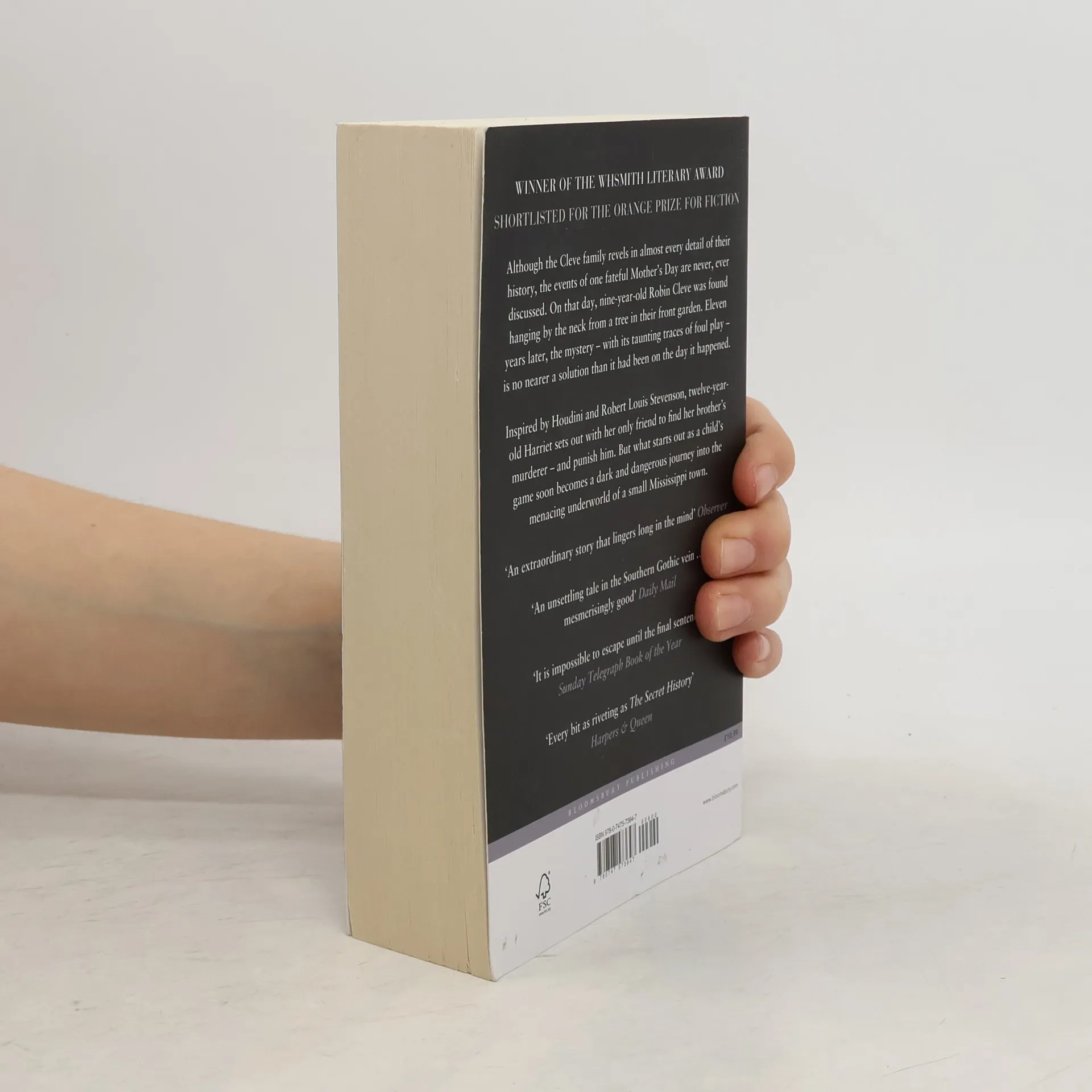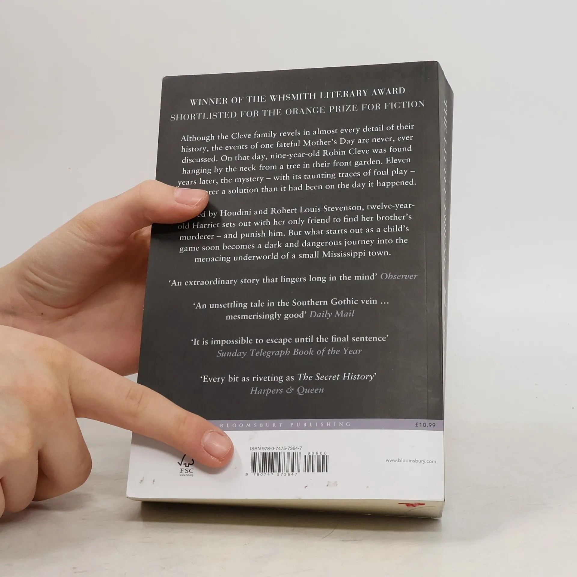 Twelve-year-old Harriet is doing her best to grow up, which is not easy as her mother is permanently on medication, her father has silently moved to another city, and her serene sister rarely notices anything. All of them are still suffering from the shocking and mysterious death of her brother Robin twelve years earlier, and it seems to Harriet that the family may never recover. So, inspired by Captain Scott, Houdini, and Robert Louis Stevenson, she sets out with her only friend Hely to find Robin's murderer and punish him. But what starts out as a child's game soon becomes a dark and dangerous journey into the menacing underworld of a small Mississippi town.