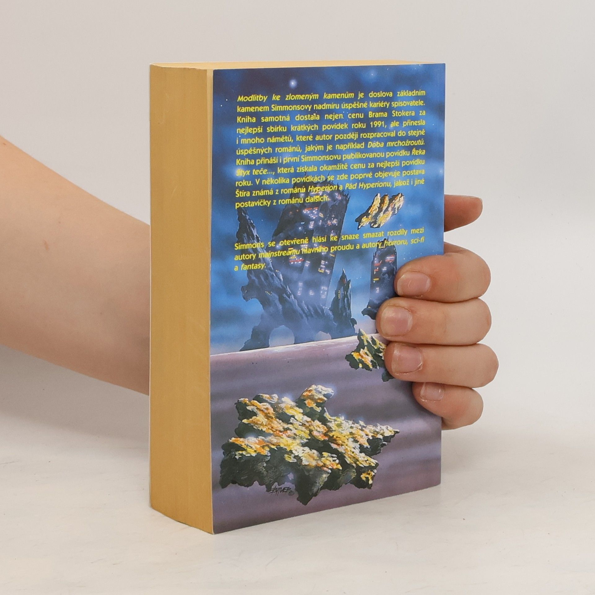 Modlitby ke zlomeným kamenům je doslova základním kamenem Simonsovy nadmíru úspěšné kariéry spisovatele. Kniha samotná dostala nejen cenu Brama Stokera za nejlepší sbírku krátkých povídek roku 1991, ale přinesla i mnoho námětů, které autor později rozpracoval do stejně úspěšných románů, jakým je například Doba mrchožroutů. Kniha přináší i první Simmonsovu publikovanou povídku Řeka Styx teče proti proudu, která získala okamžitě cenu za nejlepší povídku roku. V několika povídkách se zde poprvé objevuje postava Štíra známá z románů Hyperion a Pád Hyperionu, jakož i jiné postavičky z románů dalších.... celý text