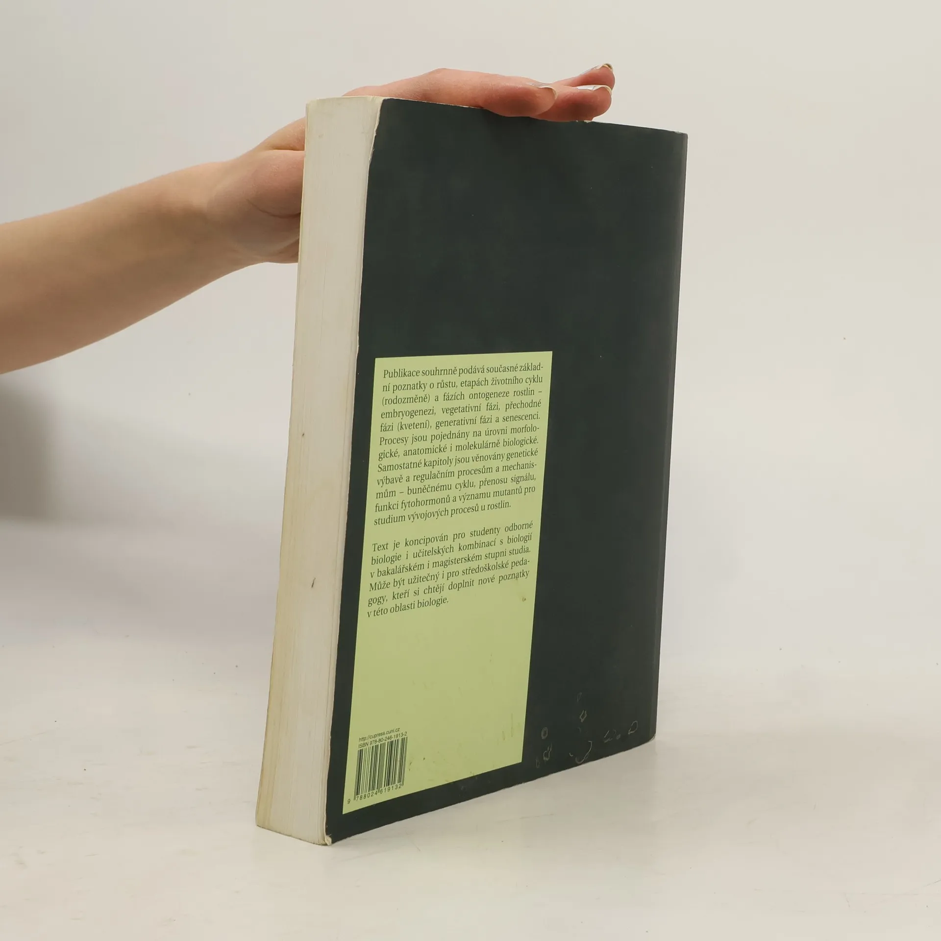Publikace souhrně podává současné základní poznatky o růstu, etapách životního cyklu (rodozměně) a fázích ontogeneze rostlin - embryogenezi, vegetativní fázi, přechodné fázi (kvetení), generativní fázi a senescenci. Procesy jsou pojednány na úrovni morfologické, anatomické i molekulárně biologické. Samostatné kapitoly jsou věnovány genetické výbavě a regulačním procesům a mechanismům - buněčnému cyklu, přenosu signálu, funkci fytohormonů a významu mutantů pro studium vývojových procesů u rostlin.