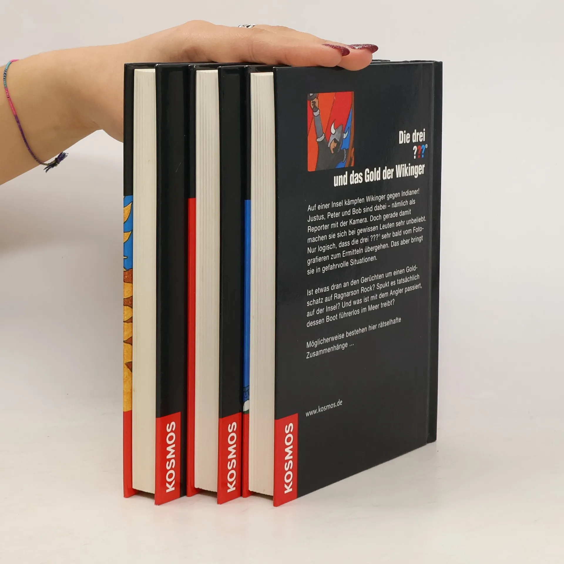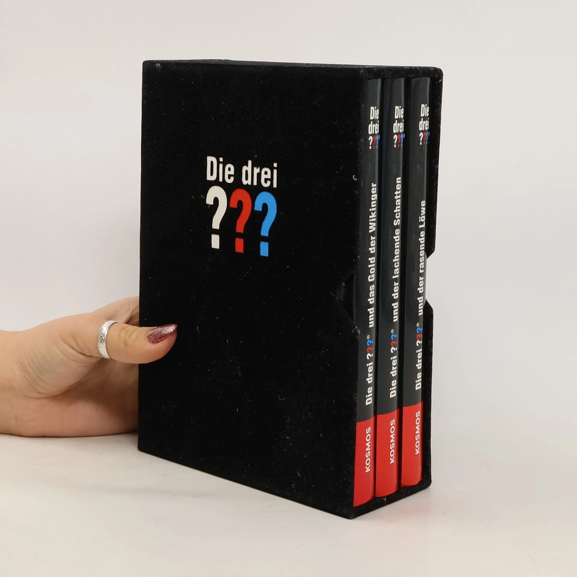 Die Herzen der ???-Fans dürfen höher schlagen: Drei lange nicht mehr lieferbare Bände der legendären Serie sind in einem edlen Samt-Schuber versammelt. Im ersten Abenteuer, „Der lachende Schatten“, treffen Justus, Peter und Bob auf einen unheimlichen Schatten, der lacht. Neben diesem rätselhaften Wesen müssen sie ein Amulett und einen verschwundenen Indianerschatz finden – an einem Ort, „wo ihn kein Mann finden kann“. Ihre Erfindungsgabe und ihr Mut sind gefragt, um die Herausforderungen zu meistern. Im zweiten Teil, „Das Gold der Wikinger“, sind die drei Detektive als Reporter auf einer Insel, wo Wikinger gegen Indianer kämpfen. Ihre fotografischen Ambitionen bringen sie in Schwierigkeiten, und bald sind sie auf der Spur eines Gerüchts über einen Goldschatz auf Ragnarson Rock. Zudem müssen sie klären, was mit einem Angler geschehen ist, dessen Boot führerlos im Meer treibt – möglicherweise gibt es hier geheimnisvolle Verbindungen. Im dritten Abenteuer, „Der rasende Löwe“, wird der sanfte Löwe George aus dem Tierpark unruhig. Plötzlich sind einige wilde Tiere frei und die Diamanten spielen eine mysteriöse Rolle. Justus, Peter und Bob stehen vor einem gefährlichen Auftrag, der ihre Fähigkeiten auf die Probe stellt.