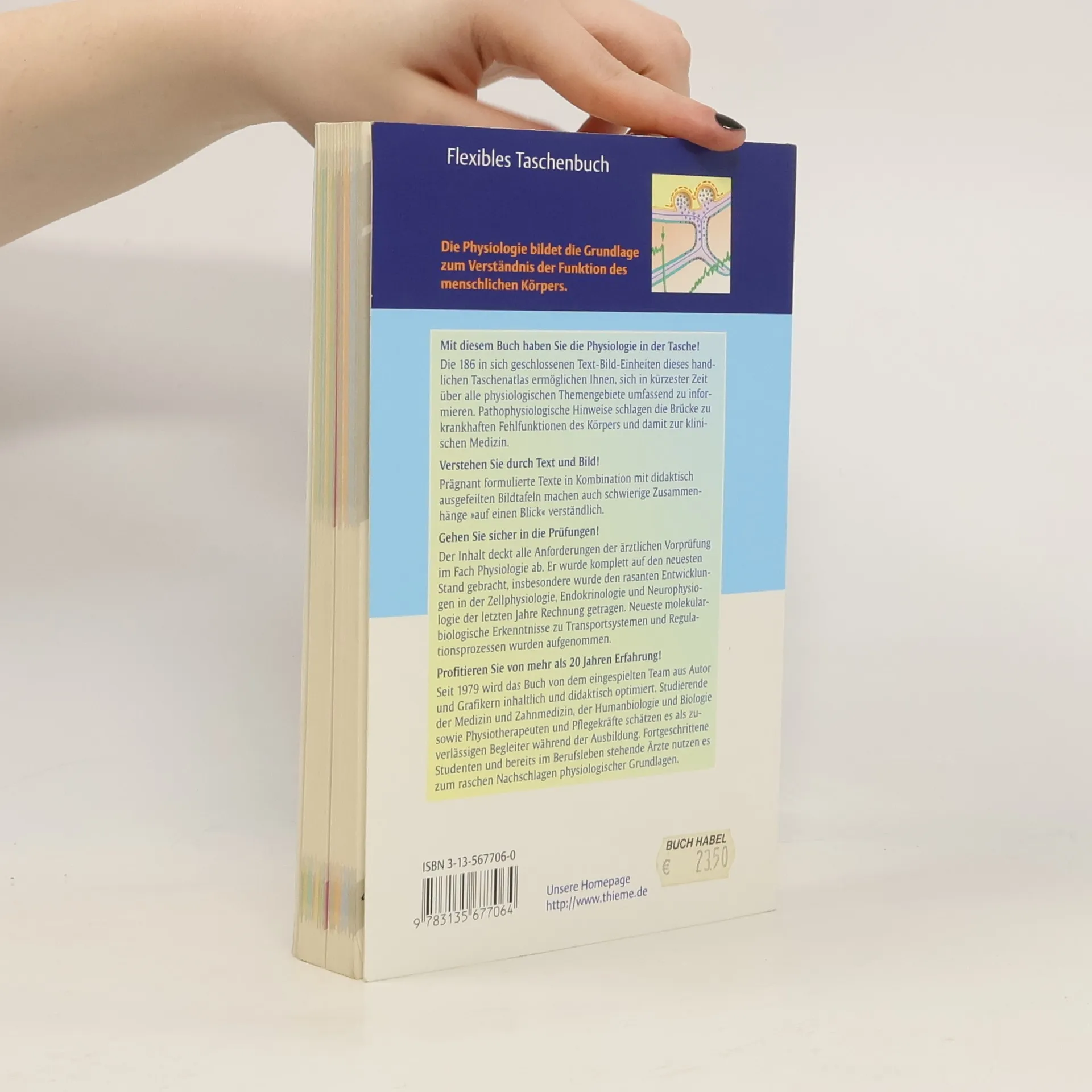Physiologie -so funktioniert der menschliche Körper! Der Taschenatlas Physiologie weiß auch in seiner 7. Auflage wieder zu überzeugen! Kompakt, verständlich und anschaulich aufbereitet finden Sie hier alles, was Sie über die menschlichen Körperfunktionen und für das Verständnis der pathologischen Abweichungen wissen müssen. Gehen Sie sicher durch die Prüfung! Der Taschenatlas deckt alle Anforderungen der ärztlichen Vorprüfung im Fach Physiologie ab. Alle Text-Bild-Einheiten wurden vollständig aktualisiert und entsprechend der rasanten Entwicklungen in der Forschung auf den neuesten Stand gebracht. Zahlreiche Text- und Bildverweise vernetzen die komplette Physiologie über alle Kapitel hinweg. Verknüpfen Sie die Physiologie mit der Klinik! Blaue Randbalken im Text markieren wichtige klinische und pathophysiologische Bezüge. Relevante pathophysiologische Stichpunkte sind jeweils unterhalb der Texteinheiten aufgeführt. So finden Sie alle wichtigen Bezüge auf einen Blick.