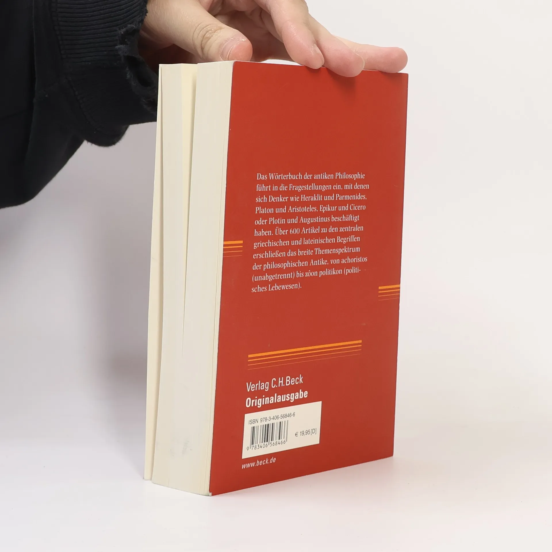 ?15?Das >I/I führt in die Fragestellungen ein, mit denen sich Denker wie Heraklit und Parmenides, Platon und Aristoteles, Epikur und Cicero oder Plotin und Augustinus beschäftigt haben. Über 600 Artikel zu den zentralen griechischen und lateinischen Begriffen erschließen das breite Themenspektrum der philosophischen Antike, von I/I (unabgetrennt) bis I/I (politisches Lebewesen). Kurzdarstellungen der wichtigsten Schulen und Philosophen, Register, ein ausführliches Quellenverzeichnis und Hinweise auf weiterführende Literatur machen das Wörterbuch zu einem zuverlässigen Hilfsmittel für jeden, der sich für die Philosophie der Antike interessiert. ?01? Christof Rapp, geb. 1964, Gastprofessur in Basel, Berkeley, Berlin, Weingarten. Veröffentlichungen (u.a.):Identität, Persistenz, Substantialität (1995); Aristoteles. Die Substanzbücher der Metaphysik (1996); Vorsokratiker (1997); Aristoteles. Rhetorik (2001); Zusammen mit Tim Wagner: Aristoteles. Topik (2002); Zusammen mit Christoph Horn: Wörterbuch der antiken Philosophie (2002); Schriftleitung der Zeitschrift für philosophische Forschung und Mitherausgeber der Seminartext-Reihe Sammlung Philosophie.