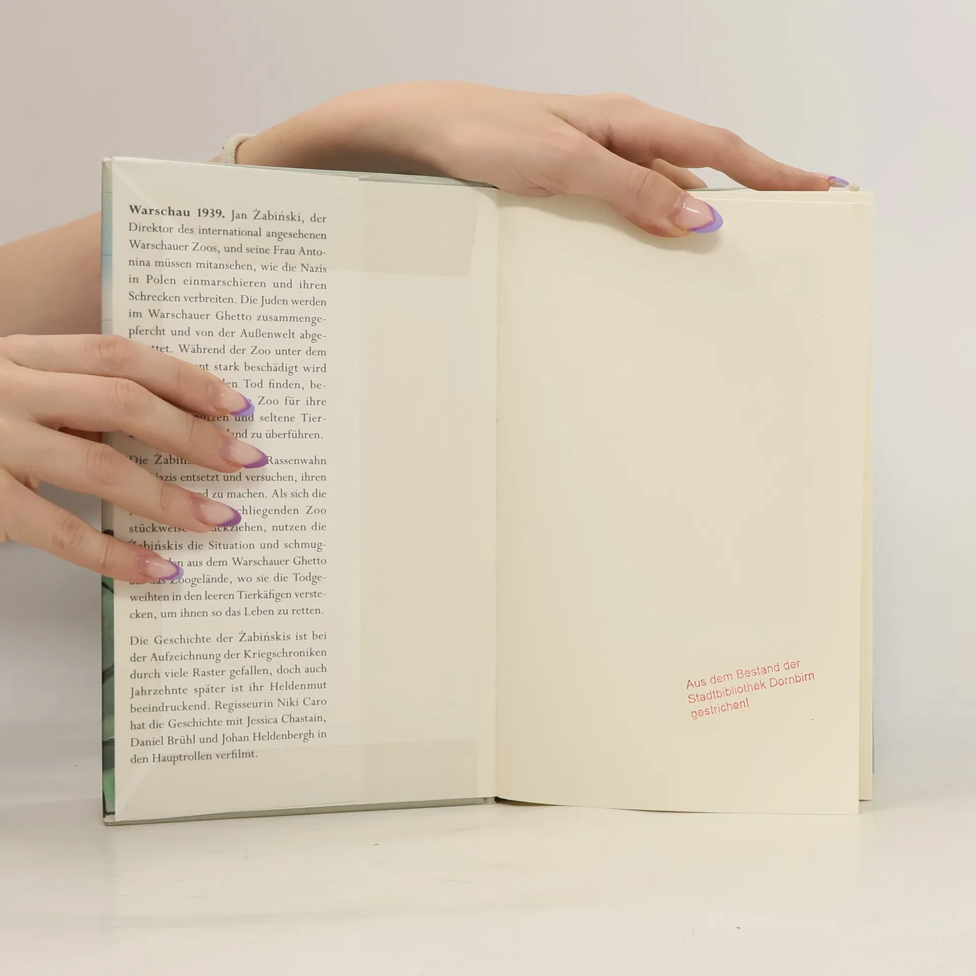 Eine wahre Geschichte aus dem Zweiten Weltkrieg Während der Zweite Weltkrieg tobt, wird der Warschauer Zoo Schauplatz einer dramatischen Rettungsaktion, die über 300 Juden vor dem sicheren Tod bewahrt. Als Jan und Antonina Żabiński, der Zoodirektor und seine Frau, mitansehen, wie die Nazis in Polen einmarschieren, ist ihr Entsetzen groß. Die jüdische Bevölkerung wird im Warschauer Ghetto zusammengepfercht. Zeitgleich beginnen die Nazis den Zoo für ihre Zwecke zu nutzen, um ausgestorbene Tierarten rückzuzüchten. Als die Nazis den brachliegenden Zoo verlassen, nutzen die Żabińskis die Situation und schmuggeln Juden aus dem Warschauer Ghetto auf das Zoogelände, wo sie die Todgeweihten in den leeren Tierkäfigen verstecken. Sie retten ihnen damit das Leben. Ausstattung: diverse s/w-Abbildungen