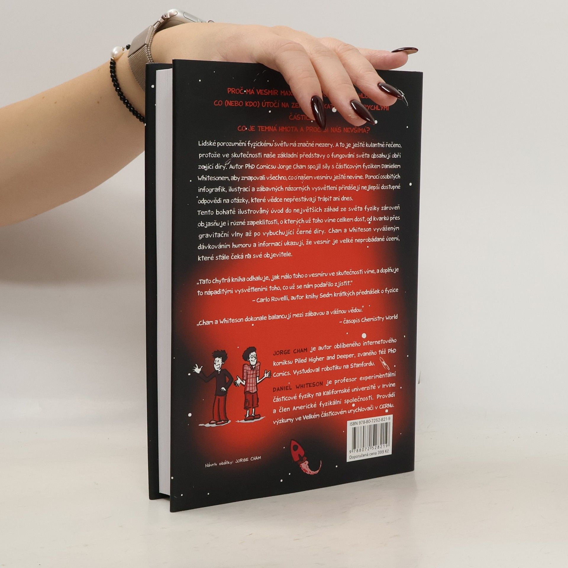 Proč má vesmír maximální povolenou rychlost? Co (nebo kdo) útočí na zemi malinkatými superrychlými částicemi? Co je temná hmota a proč si nás nevšímá? Lidské porozumění fyzickému světu má značné mezery. A to je ještě kulantně řečeno, protože ve skutečnosti naše základní představy o fungování světa obsahují obří zející díry. Autor PhD Comicsu Jorge Cham spojil síly s částicovým fyzikem Danielem Whitesonem, aby zmapovali všechno, co o našem vesmíru ještě nevíme. Pomocí osobitých infografik, ilustrací a zábavných názorných vysvětlení přinášejí nejlepší dostupné odpovědi na otázky, které vědce nepřestávají trápit ani dnes. Tento bohatě ilustrovaný úvod do největších záhad ze světa fyziky zároveň objasňuje i různé zapeklitosti, o kterých už toho víme celkem dost, od kvarků přes gravitační vlny až po vybuchující černé díry. Cham a Whiteson vyváženým dávkováním humoru a informací ukazují, že vesmír je velké neprobádané území, které stále čeká na své objevitele. „Tato chytrá kniha odhaluje, jak málo toho o vesmíru ve skutečnosti víme, a doplňuje to nápaditými vysvětleními toho, co už se nám podařilo zjistit.“ Carlo Rovelli, autor knihy Sedm krátkých přednášek o fyzice