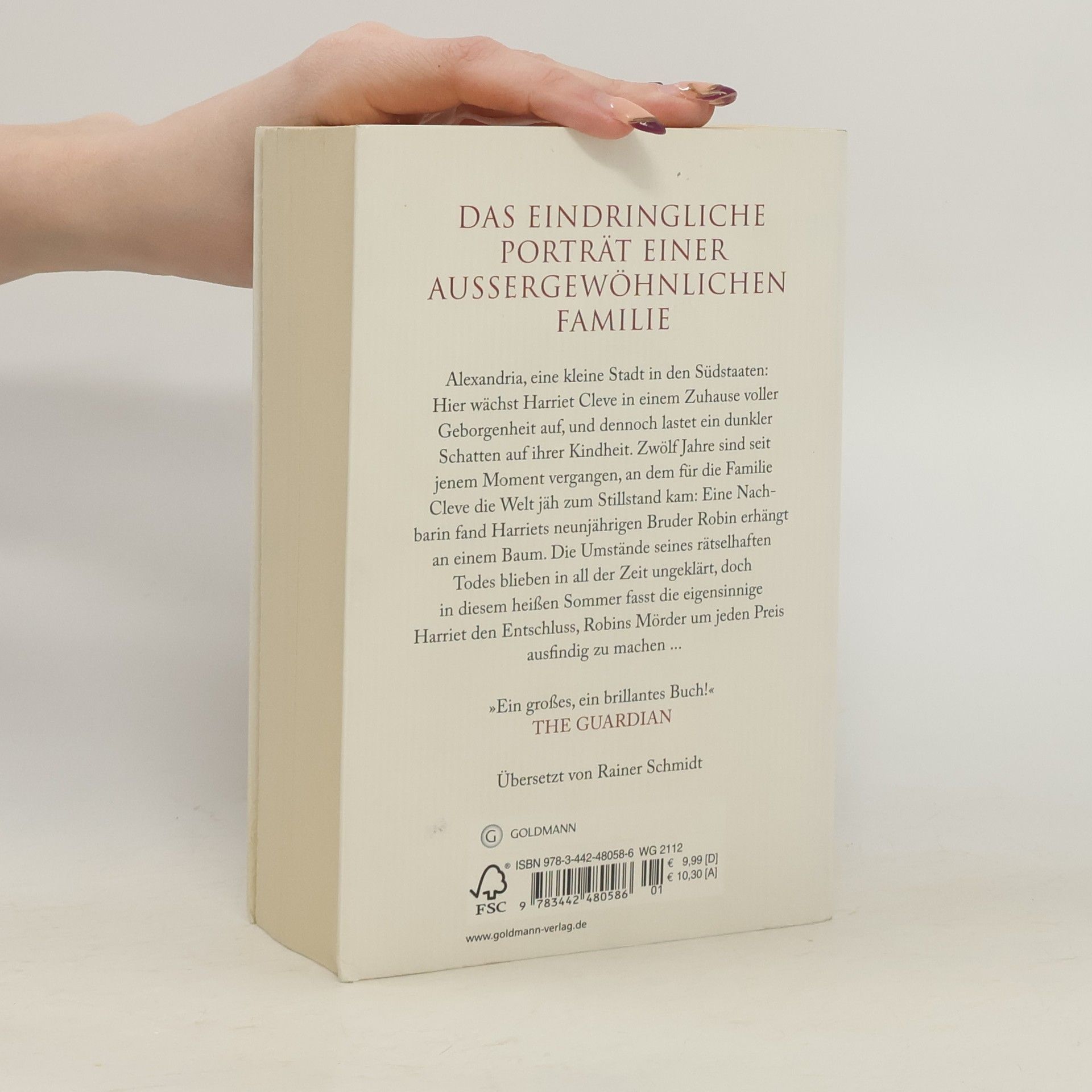 Alexandria, eine kleine Stadt in den Südstaaten in den 60er Jahren. Hier wächst Harriet Cleve als Tochter einer alteingesessenen Familie heran. Sie ist umgeben von Geborgenheit und Liebe, und doch lastet ein dunkler Schatten über ihrer Kindheit. Denn zwölf Jahre zuvor wurde Harriets neunjähriger Bruder Robin erhängt an einem Baum im Garten aufgefunden. Die Umstände von Robins rätselhaftem Tod blieben für immer ungeklärt, und in all den Jahren hat die Familie das entsetzliche Ereignis nie überwunden. Doch dann entschliesst sich die zwölfjährige Harriet, den Schrecken der Vergangenheit auf die Spur zu kommen - und endlich Robins Mörder ausfindig zu machen ... Donna Tartt wurde 1963 in Greenwood, Mississippi, geboren. Mit fünf Jahren schrieb sie ihr erstes Gedicht. 1981 begann sie an der Universität von Mississippi zu studieren und wechselte dann auf das Bennington College in Vermont, wo sie 1986 auch ihren Abschluss machte. Während des Studiums begann sie mit der Arbeit an ihrem Debütroman 'Die geheime Geschichte'. Heute lebt Donna Tartt mit ihrem Boston Terrier und zwei Möpsen abwechselnd in Charlottesville, Virginia, und Manhattan.