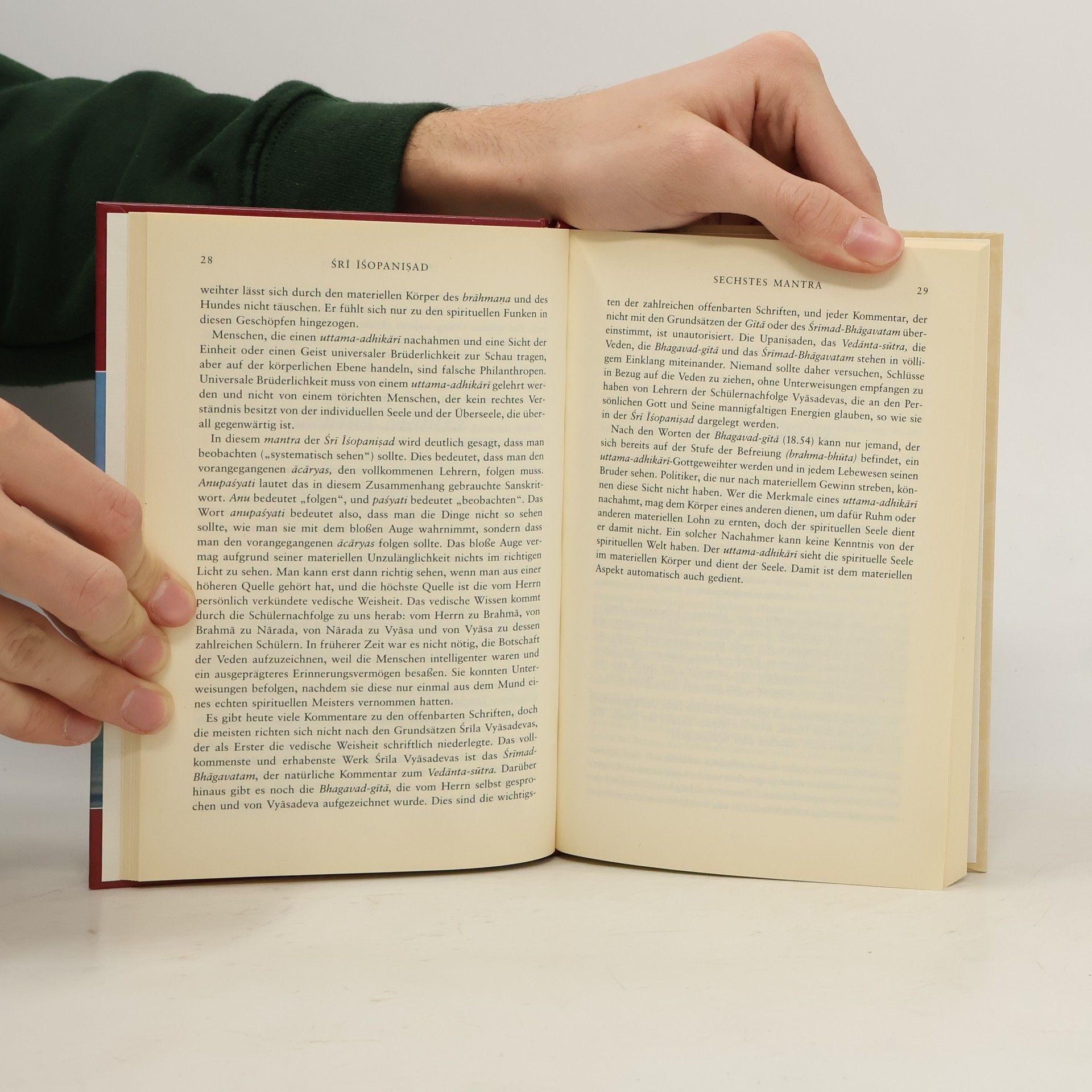 In den letzten Jahren ist es immer deutlicher geworden, dass Frieden in der menschlichen Gesellschaft nur dann möglich ist, wenn wir in uns selbst Frieden finden. In der heutigen Zeit jedoch, die durch Umweltverschmutzung, Kriminalität, Geldknappheit und zerrüttete Familienverhältnisse gekennzeichnet ist, ist dies nicht immer ein leichtes Unterfangen. Mantra bedeutet «das, was den Geist befreit», und vor Tausenden von Jahren haben die achtzehn Mantras der Sri Isopanisad den Menschen als Pfade zum Frieden gedient. Die Übersetzung von His Divine Grace A.C. Bhaktivedanta Swami Prabhupada aus dem Original-Sanskrit hat diese Pfade zu innerem Frieden und Erfüllung jedem zugänglich gemacht.