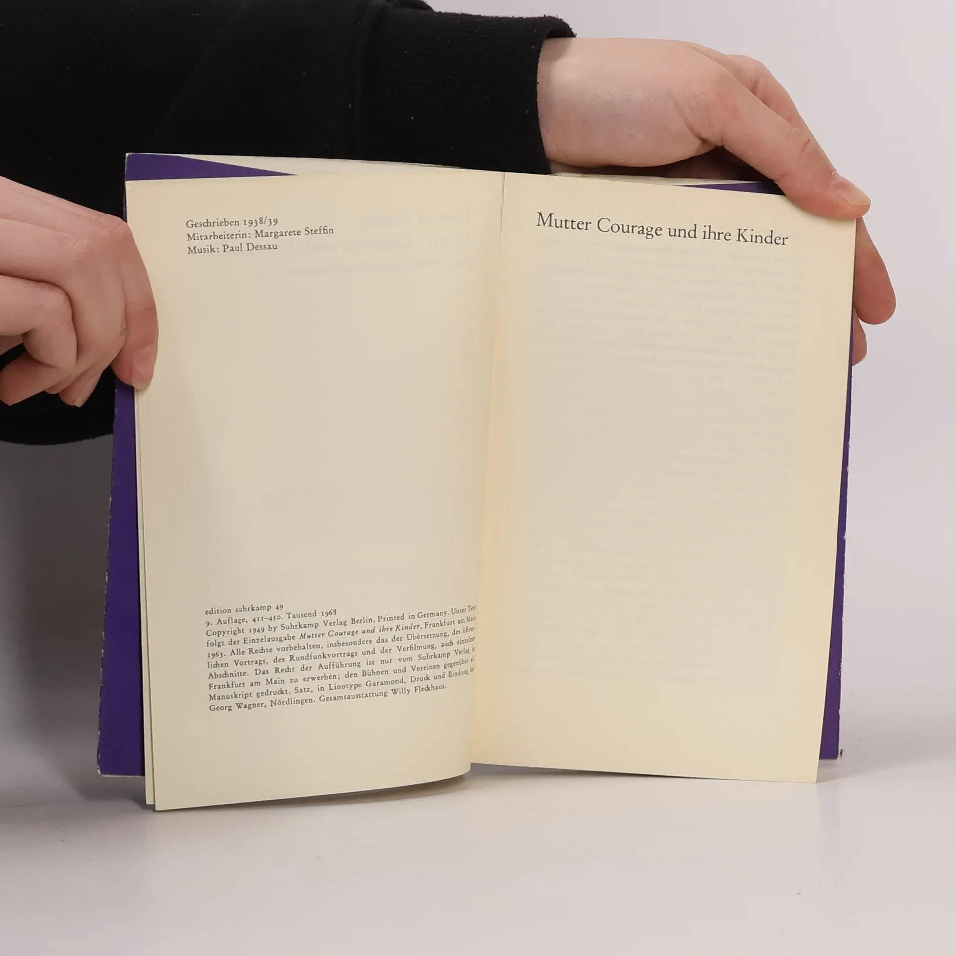 Mutter Courage und ihre Kinder, eine Chronik aus dem Dreißigjährigen Krieg. »Was eine Aufführung von Mutter Courage«, schrieb Brecht einmal, »hauptsächlich zeigen soll: Daß die großen Geschäfte in den Kriegen nicht von den kleinen Leuten gemacht werden. Daß der Krieg, der eine Fortführung der Geschäfte mit anderen Mitteln ist, die menschlichen Tugenden tödlich macht, auch für ihre Besitzer. Daß er darum bekämpft werden muß.«