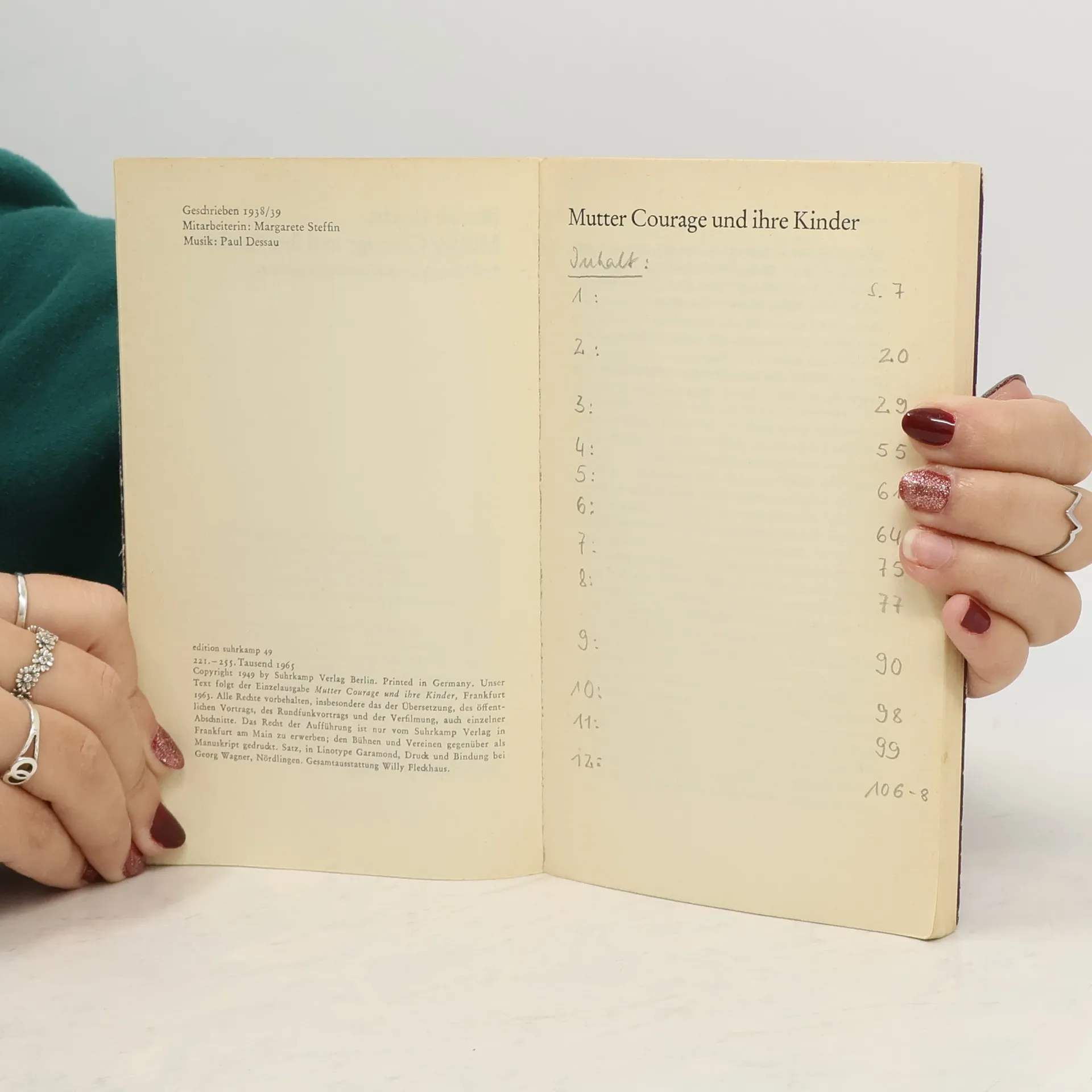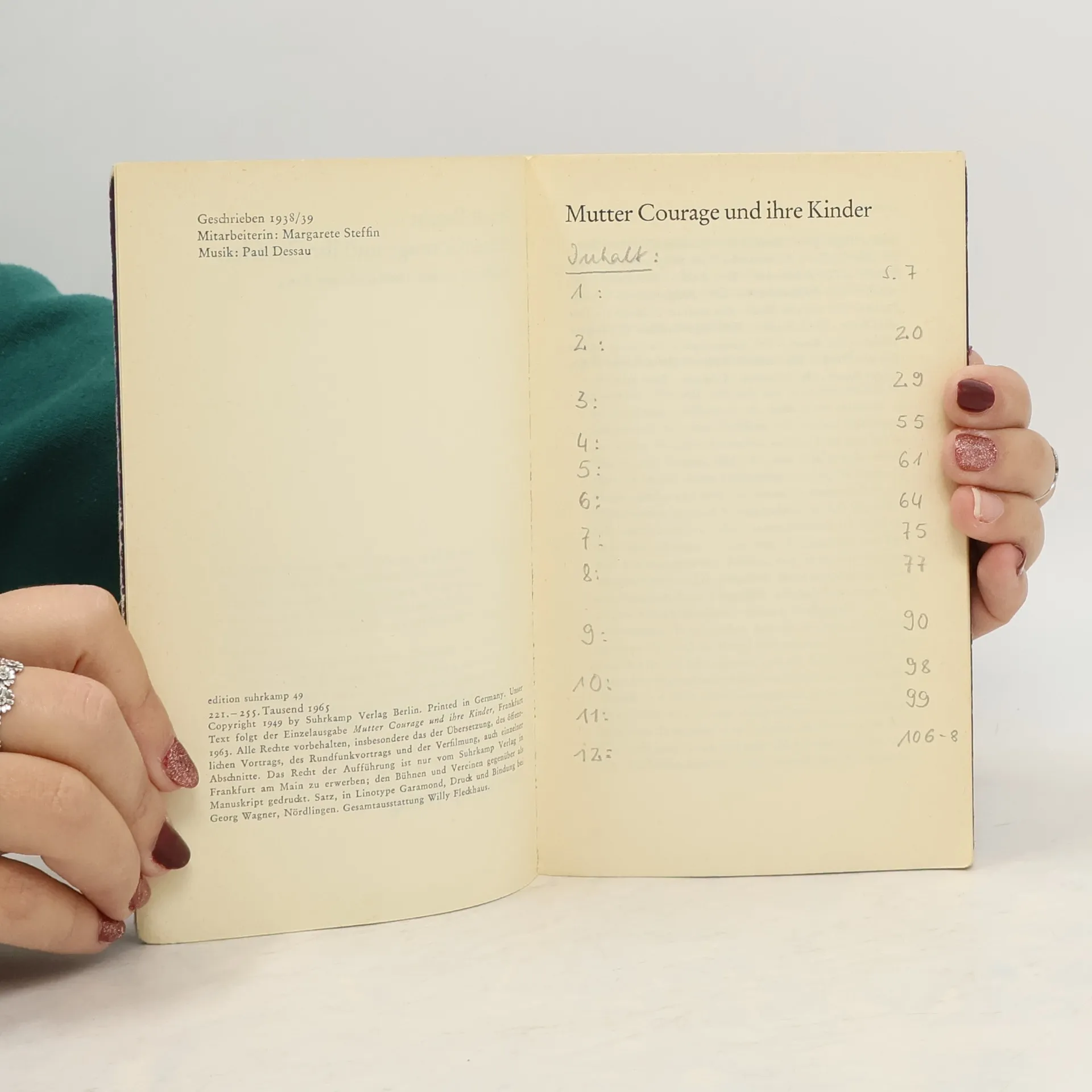 Mutter Courage und ihre Kinder, eine Chronik aus dem Dreißigjährigen Krieg. »Was eine Aufführung von Mutter Courage«, schrieb Brecht einmal, »hauptsächlich zeigen soll: Daß die großen Geschäfte in den Kriegen nicht von den kleinen Leuten gemacht werden. Daß der Krieg, der eine Fortführung der Geschäfte mit anderen Mitteln ist, die menschlichen Tugenden tödlich macht, auch für ihre Besitzer. Daß er darum bekämpft werden muß.«