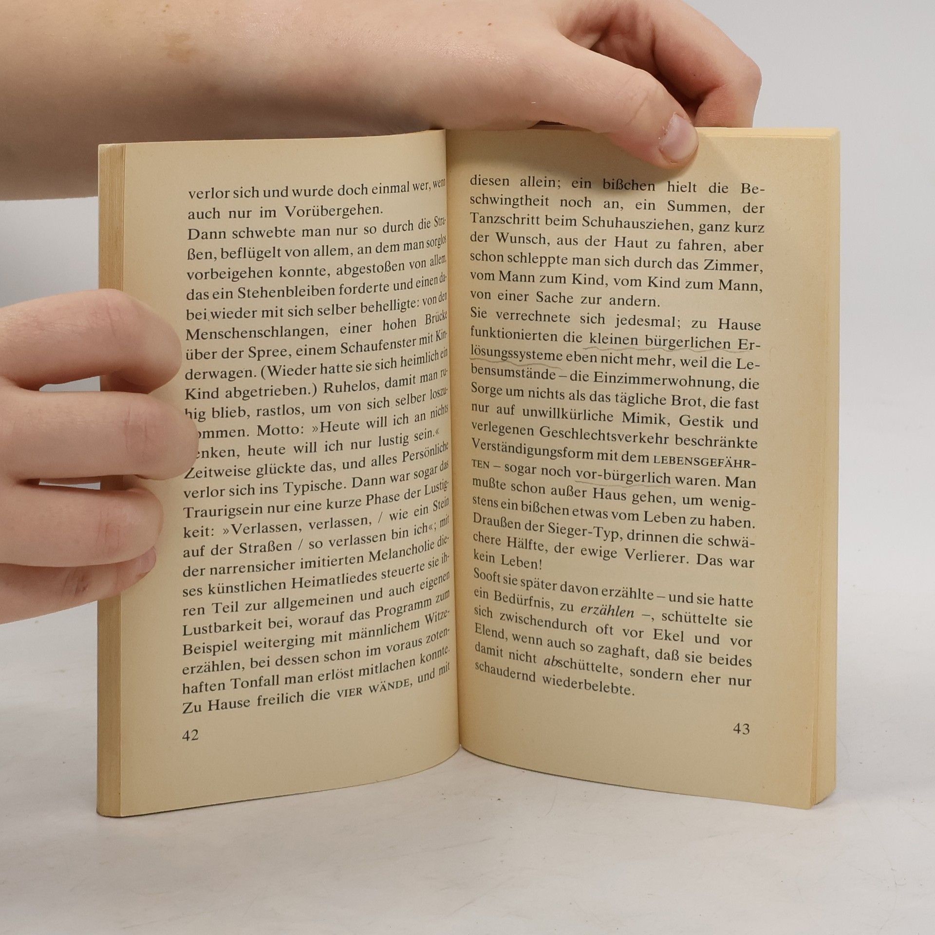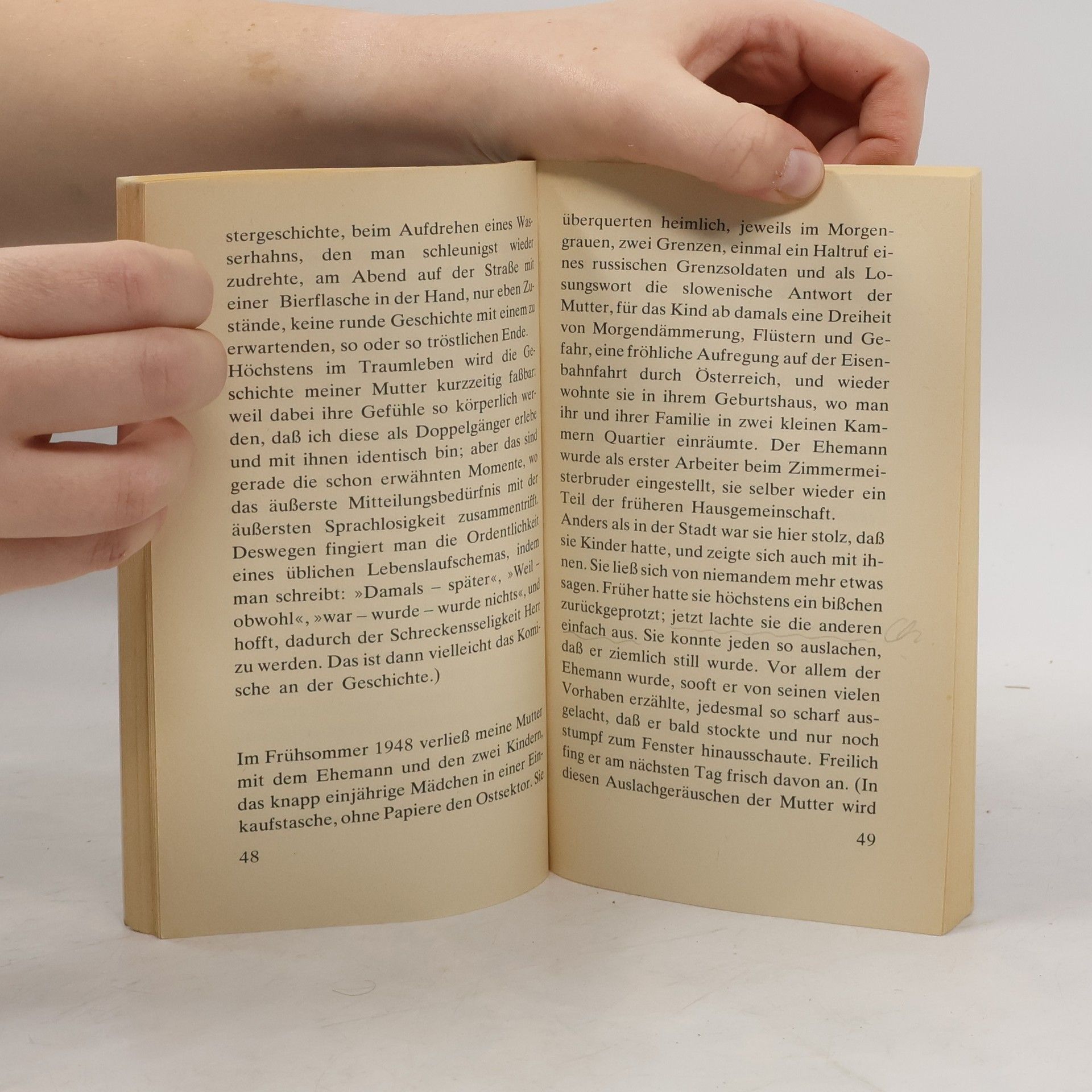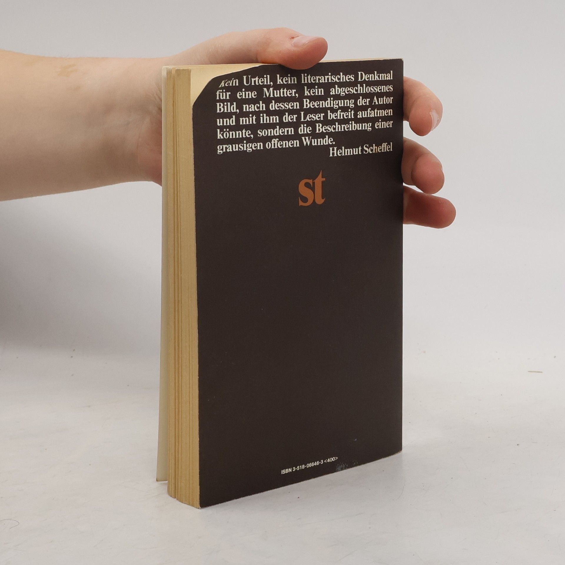 Ausgabe in großer Schrift „Unter der Rubrik VERMISCHTES stand in der Sonntagsausgabe der Kärntner ‚Volkszeitung’ folgendes: ‚In der Nacht zum Samstag verübte eine 51jährige Hausfrau aus A. (Gemeinde G.) Selbstmord durch Einnehmen einer Überdosis von Schlaftabletten.’ Es ist inzwischen fast sieben Wochen her, seit meine Mutter tot ist, und ich möchte mich an die Arbeit machen, bevor das Bedürfnis, über sie zu schreiben, das bei der Beerdigung so stark war, sich in die stumpfsinnige Sprachlosigkeit zurückverwandelt, mit der ich auf die Nachricht von dem Selbstmord reagierte.“ Peter Handke, geboren 1942 in Griffen (Kärnten), lebt heute in Paris.