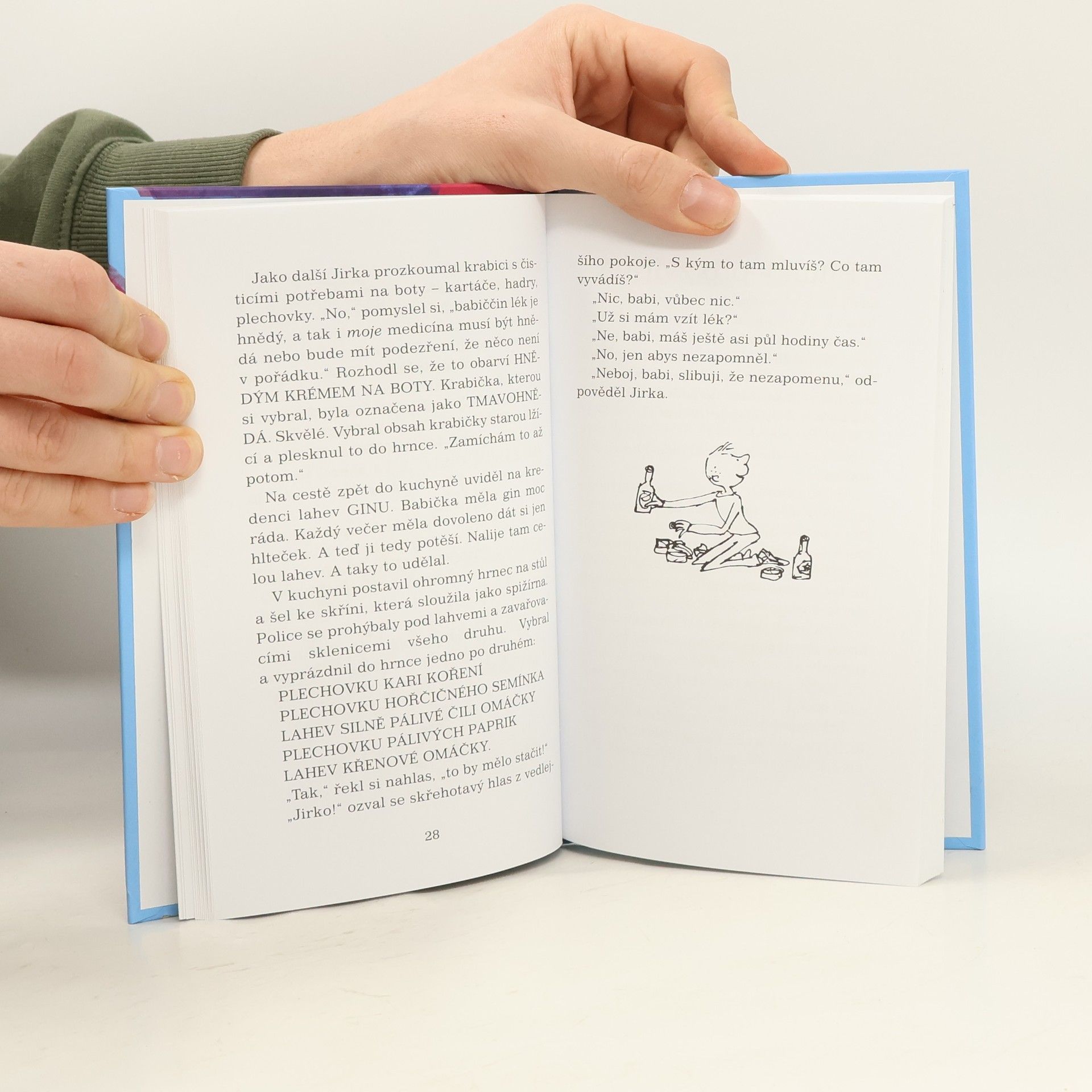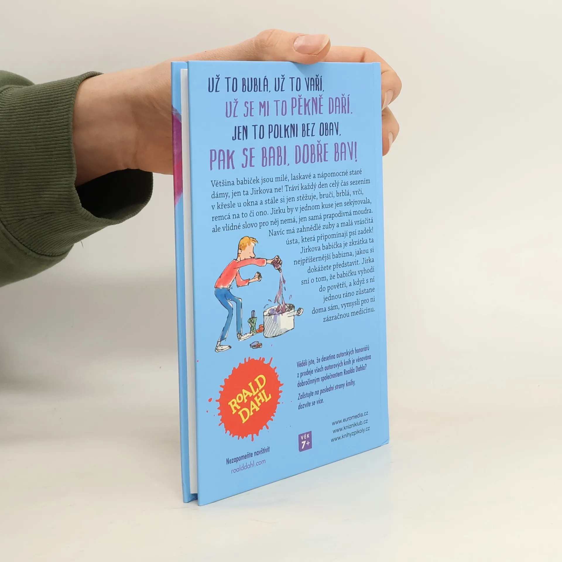 Většina babiček jsou milé, laskavé a nápomocné staré dámy, jen ta Jirkova ne! Tráví každý den celý čas sezením v křesle u okna a stále si jen stěžuje, bručí, brblá, vrčí, remcá na to či ono. Jirku by v jednom kuse jen sekýrovala, ale vlídné slovo pro něj nemá, jen samá prapodivná moudra. Navíc má zahnědlé zuby a malá vrásčitá ústa, která připomínají psí zadek! Jirkova babička je zkrátka ta nejpříšernější babizna, jakou si dokážete představit. Jirka sní o tom, že babičku vyhodí do povětří, a když s ní jednou ráno zůstane doma sám, vymyslí pro ni zázračnou medicínu. Kniha je určena pro děti od 7 let.
