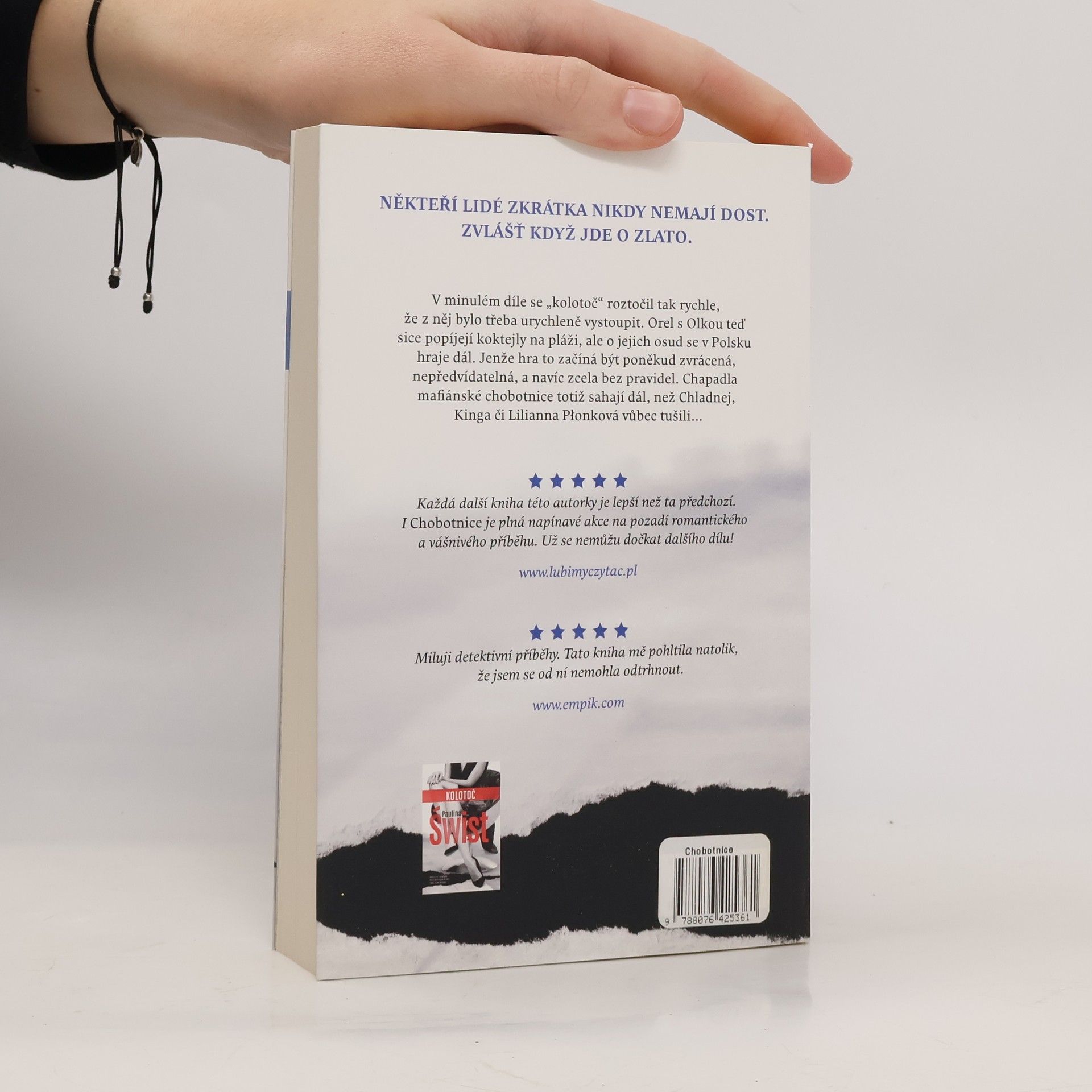 Román Chobotnice od Pauliny Świst je další silná kniha od nejpopulárnější polské debutantky posledních několika let. Po bestselleru s názvem Kolotoč nastal čas na pokračování, kde už nepřichází na scénu jen finanční machinace a plamenná vášeň, ale také pašování zlata a aféra katolické církve. Policista z ústřední vyšetřovací kanceláře Michał Grosicki jede na služební misi do Horního Slezska. Do zločinecké organizace se mu podaří proniknout natolik dobře, že jej nechá zatknout tamní prokurátor Zimnicki. Ale to je teprve začátek nového obřího spiknutí, do něhož jsou zapojení i nám dobře známí hrdinové z prvního dílu – Orel a Olka. Vše nasvědčuje tomu, že příběh finančních podvodů zdaleka neskončil útěkem z Polska… Četba Chobotnice je nefalšovaná jízda bez řídítek. Aféra střídá aféru a ve hře je toho stále víc. To všechno se přitom – jak už jsme zvyklí – odehrává v atmosféře žhavé vášně. Paulina Świst dokáže jako žádná jiná autorka brilantně spojovat bravurní líčení děje s odvážnou erotikou a tajemstvími právnického světa. Spisovatelka pracuje zároveň jako advokátka specializující se na trestní právo a důkladně díky tomu zná temné stránky polského trestního systému. Na základě vlastních zkušeností vystavěla další detektivní příběh, který by se klidně mohl odehrát i ve skutečnosti. Ostatně kdo ví, jestli se skutečně nestal…