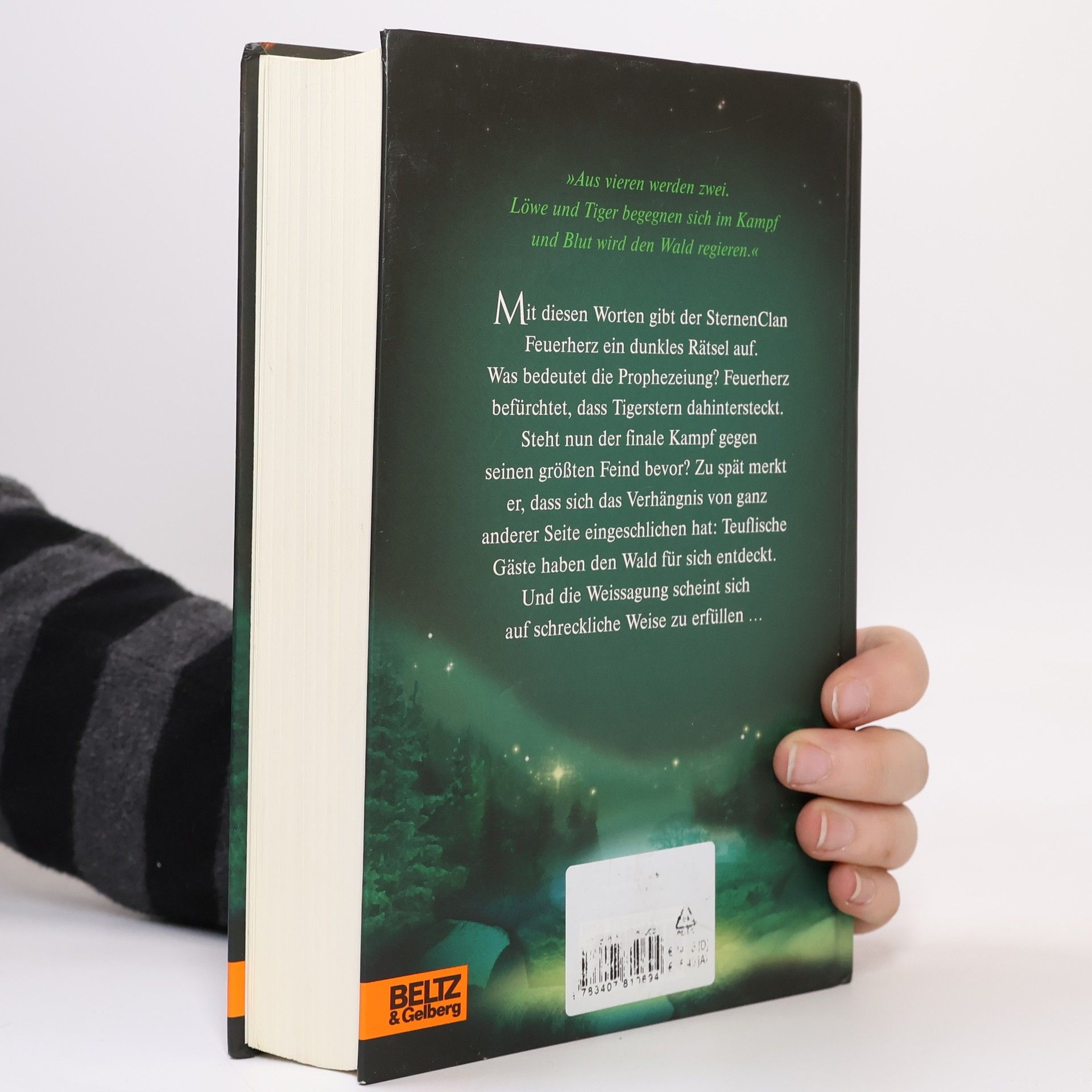 'Aus vieren werden zwei. Löwe und Tiger begegnen sich im Kampf und Blut wird den Wald regieren.' Mit diesen Worten gibt der SternenClan Feuerherz ein dunkles Rätsel auf. Was bedeutet die Prophezeiung? Feuerherz befürchtet, dass Tigerstern dahintersteckt. Steht nun der finale Kampf gegen seinen größten Feind bevor? Zu spät merkt er, dass sich das Verhängnis von ganz anderer Seite eingeschlichen hat: Teuflische Gäste haben den Wald für sich entdeckt. Und die Weissagung scheint sich auf schreckliche Weise zu erfüllen …