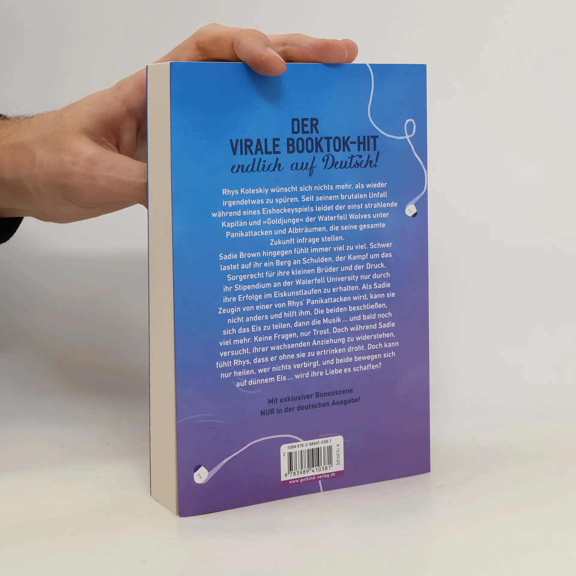 DIE unvergessliche TikTok-Sensation: In dieser Sports Romance sprühen die Funken, als sich Eishockey-Kapitän Rhys und Eiskunstläuferin Sadie unfreiwillig auf dem Eis treffen. Rhys Koteskiy wünscht sich, endlich wieder irgendetwas zu spüren. Etwas, was er verloren zu haben scheint nach einem brutalen Schlag auf den Kopf während eines Eishockeyspiels. Der einst strahlende Kapitän und »Golden Boy« wird nun von Panikattacken und Albträumen heimgesucht, die seine Zukunft infrage stellen. Sadie Brown hingegen fühlt immer viel zu viel. Mit einem Berg an Schulden, dem Kampf um das Sorgerecht für ihre kleinen Brüder und dem Druck, ihr Stipendium durch ihr Eiskunstlauftraining zu erhalten, steht sie vor einer enormen emotionalen Belastungsprobe. Als Sadie unerwartet Zeugin einer Panikattacke von Rhys' wird, nähern sie sich einander an. Keine Fragen, nur Trost. Doch während Sadie versucht, der wachsenden Anziehung zu widerstehen, fühlt Rhys, dass er ohne sie zu ertrinken droht. Doch kann nur heilen, wer nichts verbirgt, und beide bewegen sich auf dünnem Eis ... wird ihre Liebe es schaffen? Der lang erwartete TikTok-Hit nun endlich auf Deutsch! Mit exklusiver Bonusszene nur für die deutsche Ausgabe! Bei Fragen zur Produktsicherheit, wenden Sie sich bitte an: info@gutkind-verlag.de