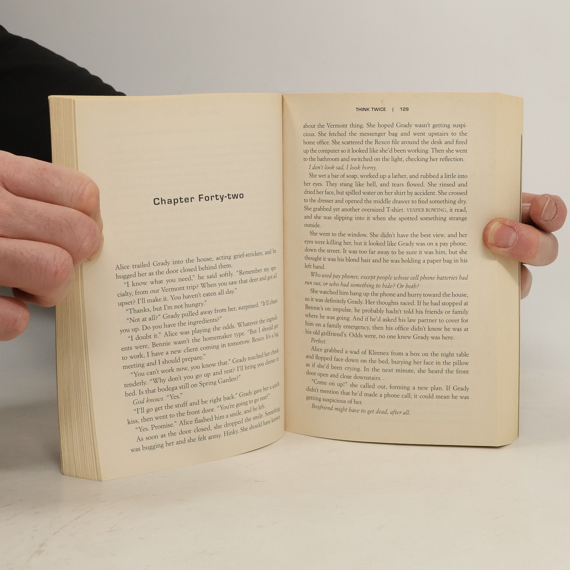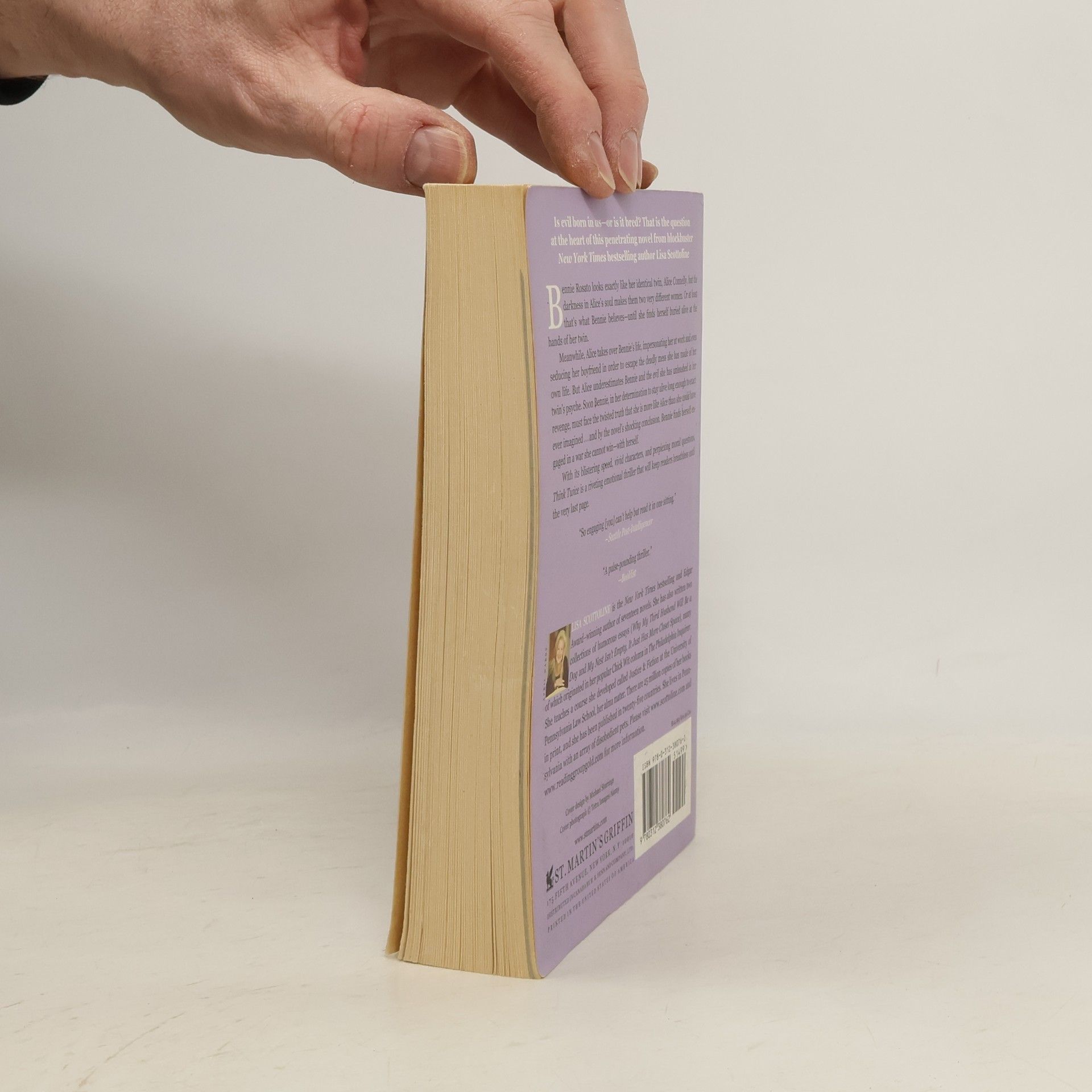 Is evil born in us—or is it bred? That is the question at the heart of this penetrating novel from blockbuster New York Times bestselling author Lisa Scottoline Bennie Rosato looks exactly like her identical twin, Alice Connelly, but the darkness in Alice's soul makes them two very different women. Or at least that's what Bennie believes—until she finds herself buried alive at the hands of her twin. Meanwhile, Alice takes over Bennie's life, impersonating her at work and even seducing her boyfriend in order to escape the deadly mess she has made of her own life. But Alice underestimates Bennie and the evil she has unleashed in her twin's psyche. Soon Bennie, in her determination to stay alive long enough to exact revenge, must face the twisted truth that she is more like Alice than she could have ever imagined . . . and by the novel's shocking conclusion, Bennie finds herself engaged in a war she cannot win—with herself. With its blistering speed, vivid characters, and perplexing moral questions, Think Twice is a riveting emotional thriller that will keep readers breathless until the very last page.