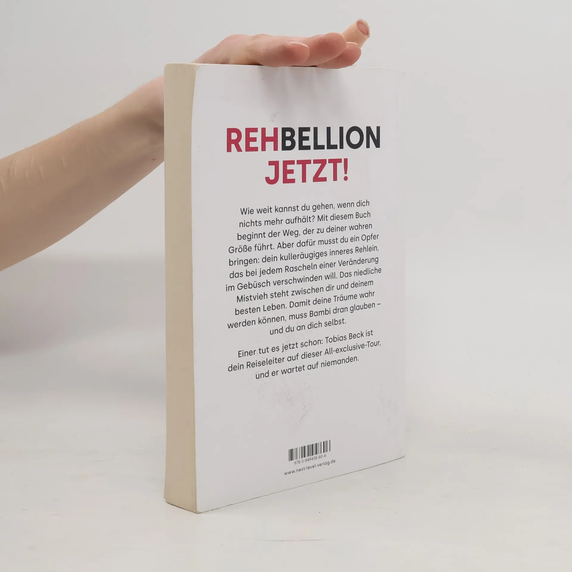 Rehbellion jetzt! Wie weit kannst du gehen, wenn dich nichts mehr aufhält? Mit diesem Buch beginnt der Weg, der zu deiner wahren Größe führt. Aber dafür musst du ein Opfer bringen: dein kulleräugiges inneres Rehlein, das bei jedem Rascheln einer Veränderung im Gebüsch verschwinden will. Das niedliche Mistvieh steht zwischen dir und deinem besten Leben. Damit deine Träume wahr werden können, muss Bambi dran glauben – und du an dich selbst. Einer tut es jetzt schon: Tobias Beck ist dein Reiseleiter auf dieser all exclusive-Tour, und er wartet auf niemanden.