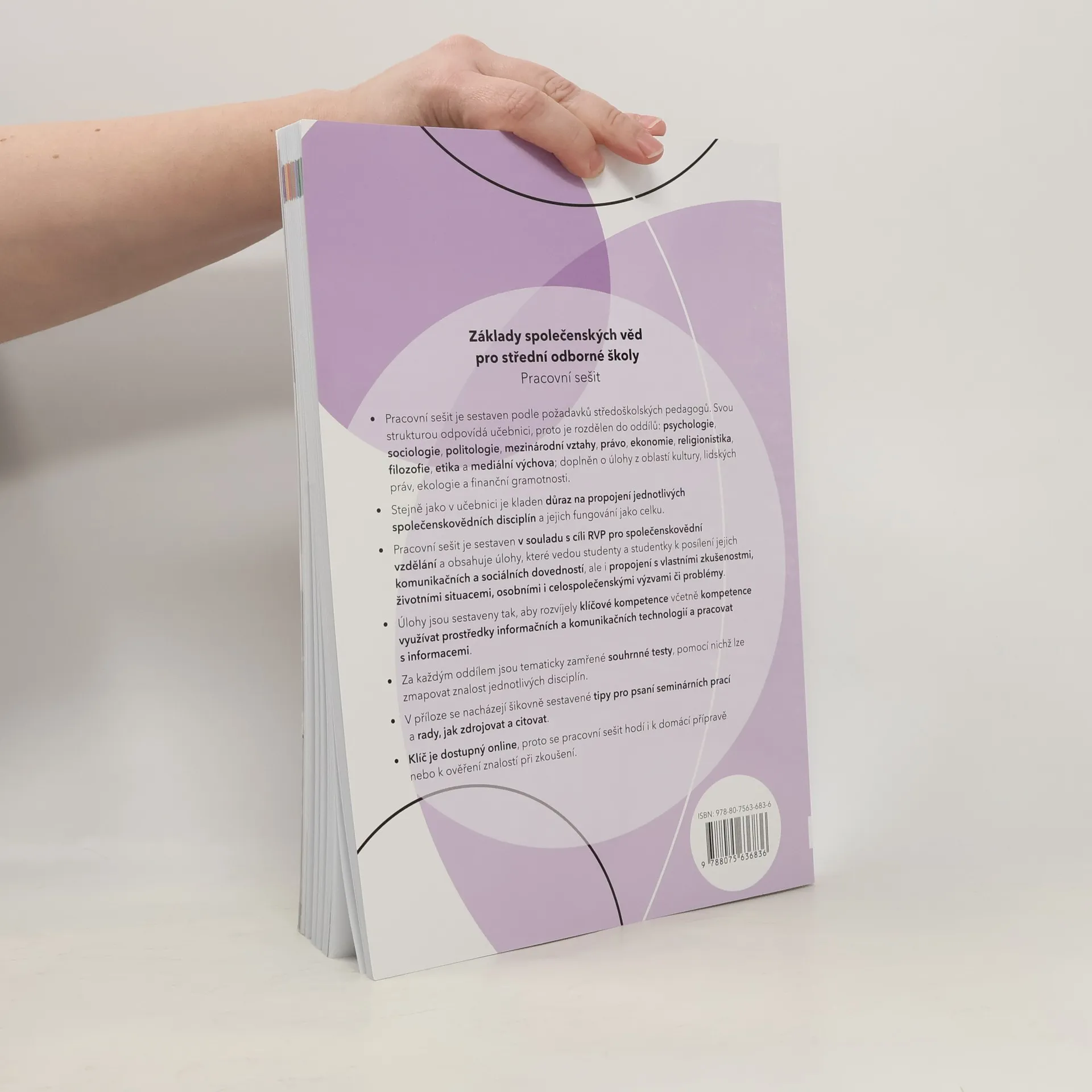 Učebnice a pracovní sešit základů společenských věd pro střední odborné školy jsou jednodílné souhrnné publikace, které reflektují požadavky většiny středoškolských pedagogů. Učivo je strukturováno, proloženo myšlenkovými mapami, schématy, zajímavostmi ze života, kontrolními úlohami a koncipováno tak, aby inspirovalo k otázkám či námětům k diskuzi. Úlohy a otázky podporují zájem o učivo, samostatné myšlení a rozvoj sociálních i občanských kompetencí. Součástí jsou QR kódy s odkazy na videa, rozšiřující učivo, grafy a aktuální zdroje informací. Pracovní sešit obsahuje kreativní úlohy zaměřené na procvičení získaných dovedností, propojení s potřebami studenta, posílení komunikačních i sociálních dovedností a také na to, aby uměl řešit životní situace či problémy. Každá kapitola obsahuje testy na procvičení daného učiva. Klíč k jejich řešení je dostupný on-line, proto je sešit vhodný k domácí přípravě nebo k ověření znalostí při zkoušení. Příloha obsahuje rady, jak správně zdrojovat a citovat, formální zásady pro psaní seminárních prací a slovníček cizích slov.