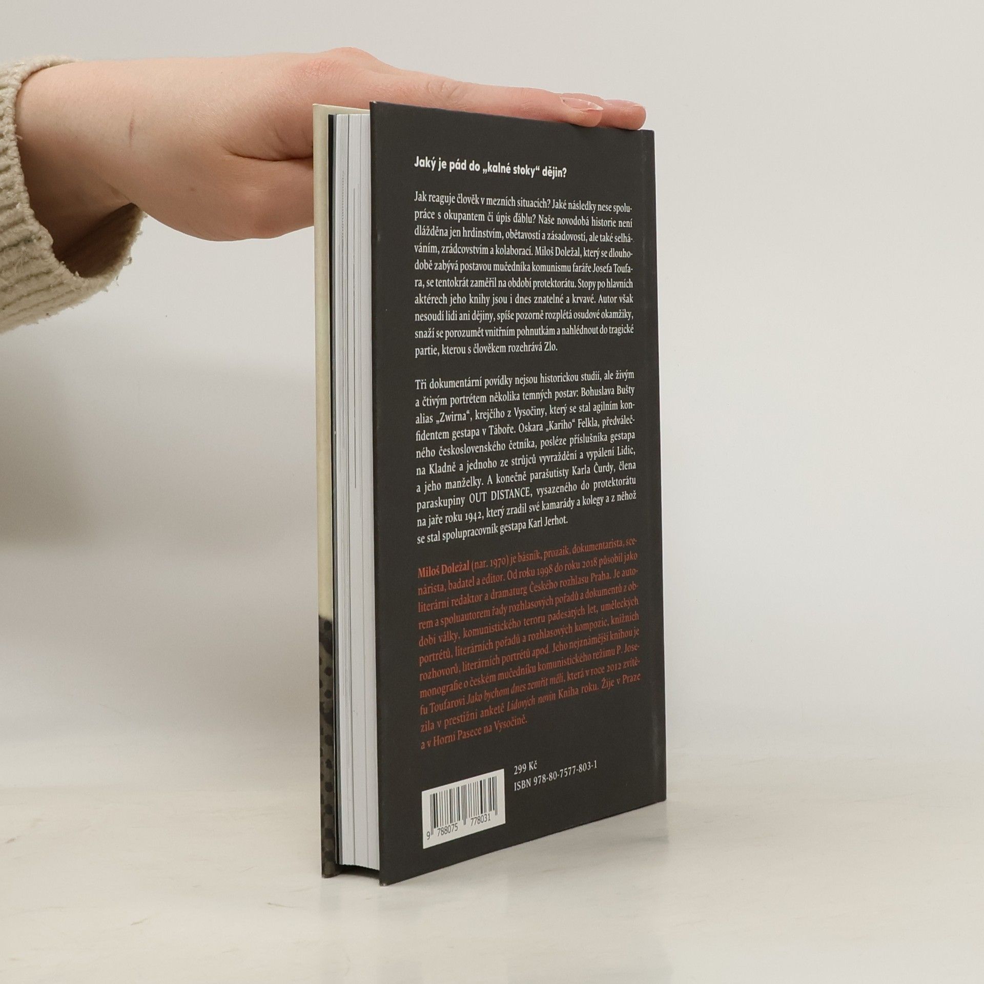 Jaký je pád do „kalné stoky“ dějin? Jak reaguje člověk v mezních situacích? Jaké následky nese spolupráce s okupantem či úpis ďáblu? Naše novodobá historie není dlážděna jen hrdinstvím, obětavostí a zásadovostí, ale také selháváním, zrádcovstvím a kolaborací. Miloš Doležal, který se dlouhodobě zabývá postavou mučedníka komunismu faráře Josefa Toufara, se tentokrát zaměřil na období protektorátu. Stopy po hlavních aktérech jeho knihy jsou i dnes znatelné a krvavé. Autor však nesoudí lidi ani dějiny, spíše pozorně rozplétá osudové okamžiky, snaží se porozumět vnitřním pohnutkám a nahlédnout do tragické partie, kterou s člověkem rozehrává Zlo. Tři dokupovídky nejsou historickou studií, ale živým a čtivým portrétem několika temných postav: Bohuslava Bušty alias „Zwirna“, krejčího z Vysočiny, který se stal agilním konfidentem gestapa v Táboře. Oskara „Kariho“ Felkla, předválečného československého četníka, posléze příslušníka gestapa na Kladně a jednoho ze strůjců vyvraždění a vypálení Lidic, a jeho manželky. A konečně parašutisty Karla Čurdy, člena paraskupiny OUT DISTANCE, vysazeného do protektorátu na jaře 1942, který zradil své kamarády a spolupracovníky a z kterého se stal spolupracovník gestapa Karl Jerhot.