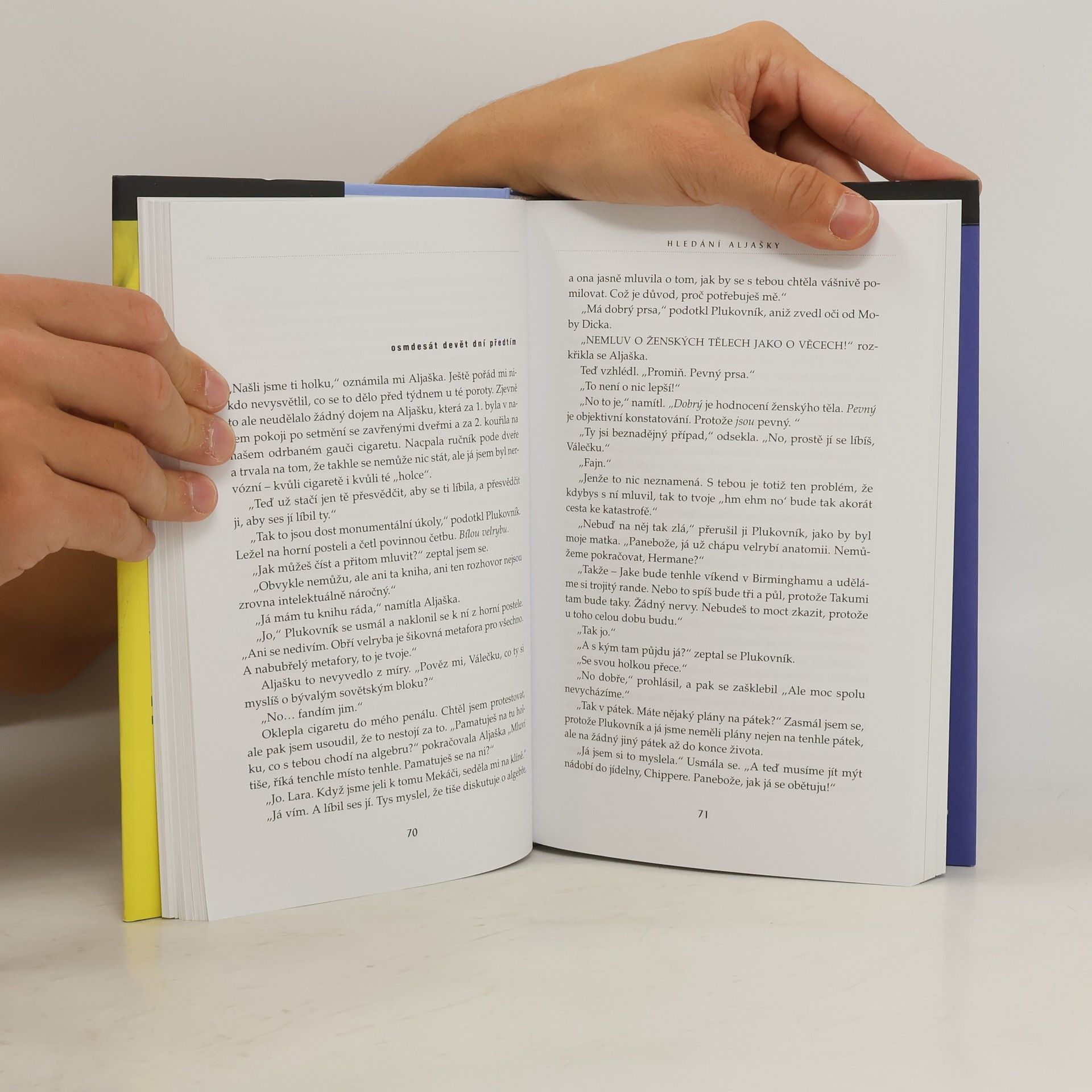 Románový debut dnes už známého Johna Greena je strhujícím vyprávěním o dospívání a hledání sama sebe. Šestnáctiletý Miles, posedlý sbíráním posledních slov významných osobností a touhou hledat „velké Možná“, je spíše outsiderem mezi svými vrstevníky. Jeho život získá zcela novou podobu, když přejde na internátní školu Culver Creek. Zde se rychle spřátelí se svérázným spolubydlícím a okouzlující, naprosto nepředvídatelnou Aljaškou Youngovou. Okamžitě je vtažen do světa, kde se porušují školní pravidla, pořádají různé večírky i provokace. Miles ožívá v dennodenním kontaktu s novými kamarády a stále víc miluje fascinující Aljašku. A tak vývoj směřuje k okamžiku, kdy se všechno nečekaně navždy změní... Živý, naléhavý a nekonečně dojemný příběh. Americkou knihovnickou asociací byl zařazen mezi deset nejlepších knih pro dospívající.