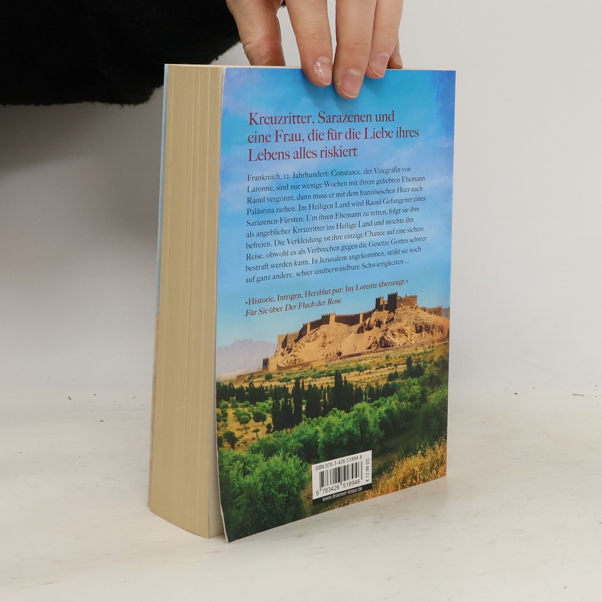 Im Mittelalter-Roman „Ritter Constance“ von Iny Lorentz verkleidet sich Gräfin Constance als Kreuzritter, um ihren gefangenen Ehemann Raoul im Heiligen Land zu retten. Ihre gefährliche Reise führt sie ins Jerusalem des 12. Jahrhunderts, wo sie sich Herausforderungen der Kirche und des Kaisers stellen muss.