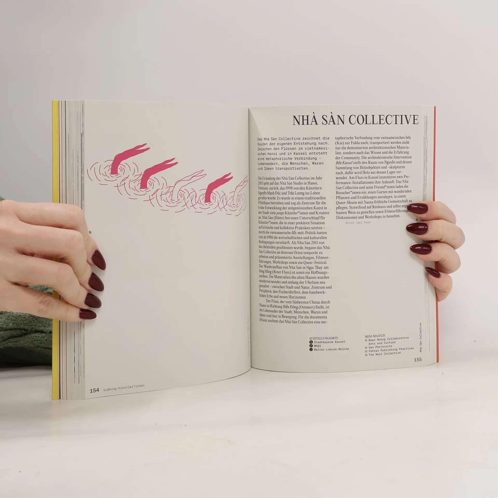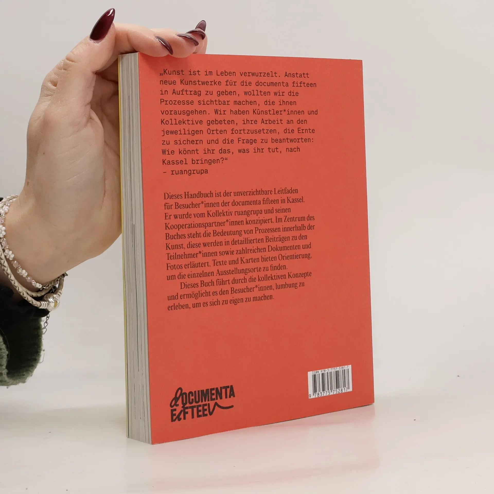 Unter dem Leitgedanken des lumbung geht es dem indonesischen Kollektiv ruangrupa weniger um Einzelwerke als um Formen gemeinschaftlichen Arbeitens. Das Handbuch bietet als Nachschlagewerk, Begleiter und innovativer Kunstführer Orientierung für diese umfassenden Prozesse; es richtet sich ebenso an Besucher*innen der Ausstellung in Kassel wie an Menschen, die sich für kollektive Praxis interessieren. Alle Akteur*innen der documenta fifteen werden mit ihrer Arbeit von internationalen Autor*innen vorgestellt, die mit der jeweiligen künstlerischen Praxis und dem kulturellen Kontext vertraut sind. Unter dem Titel „lumbung“ führt das Buch in die Denkweise und die kulturellen Hintergründe der documenta fifteen ein und verdeutlicht mit zahlreichen Zeichnungen die künstlerischen Arbeitsprozesse. Ein Kapitel über Kassel zeigt und erläutert alle Standorte der Schau, inklusive der hier vertretenen Künstler*innen und Kollektive.