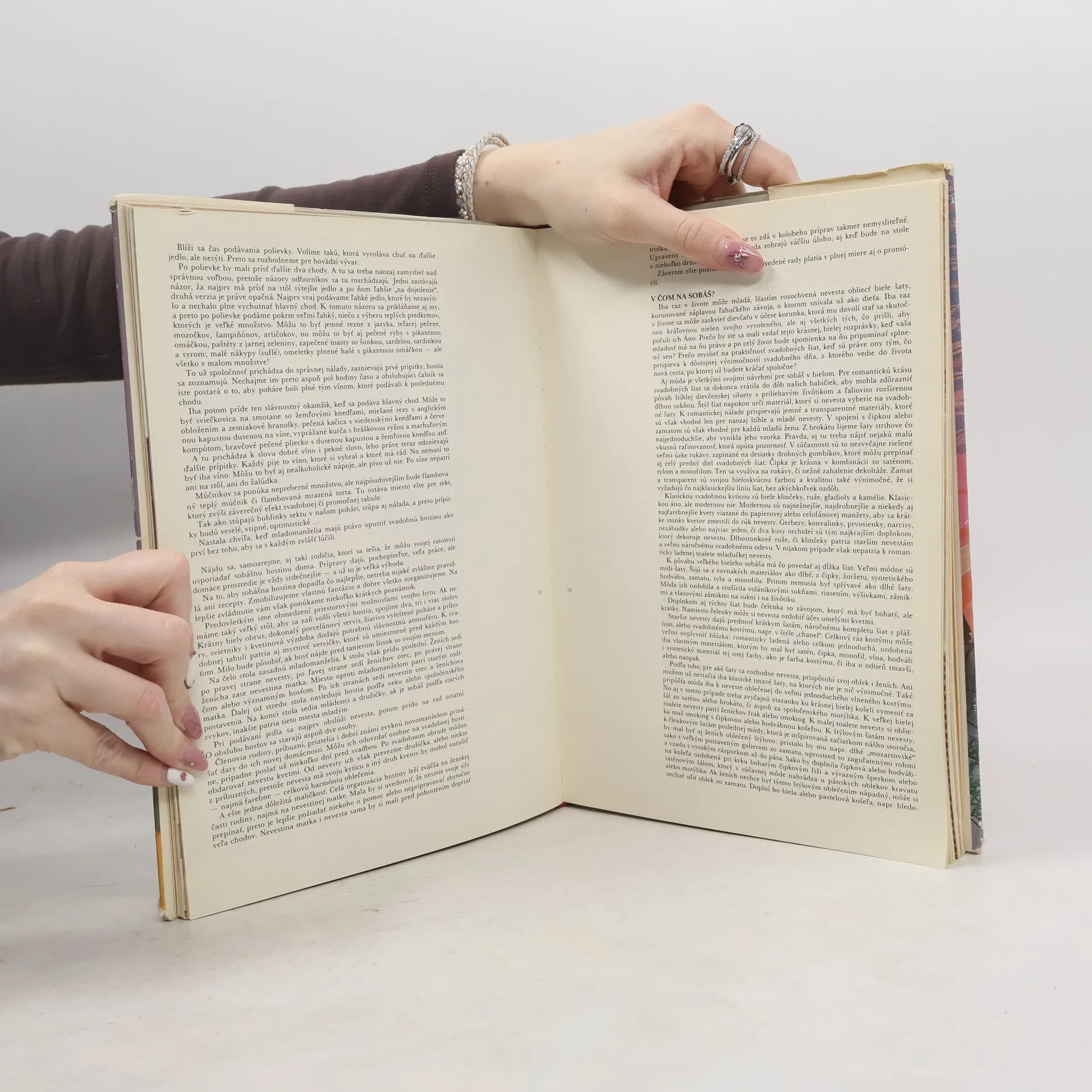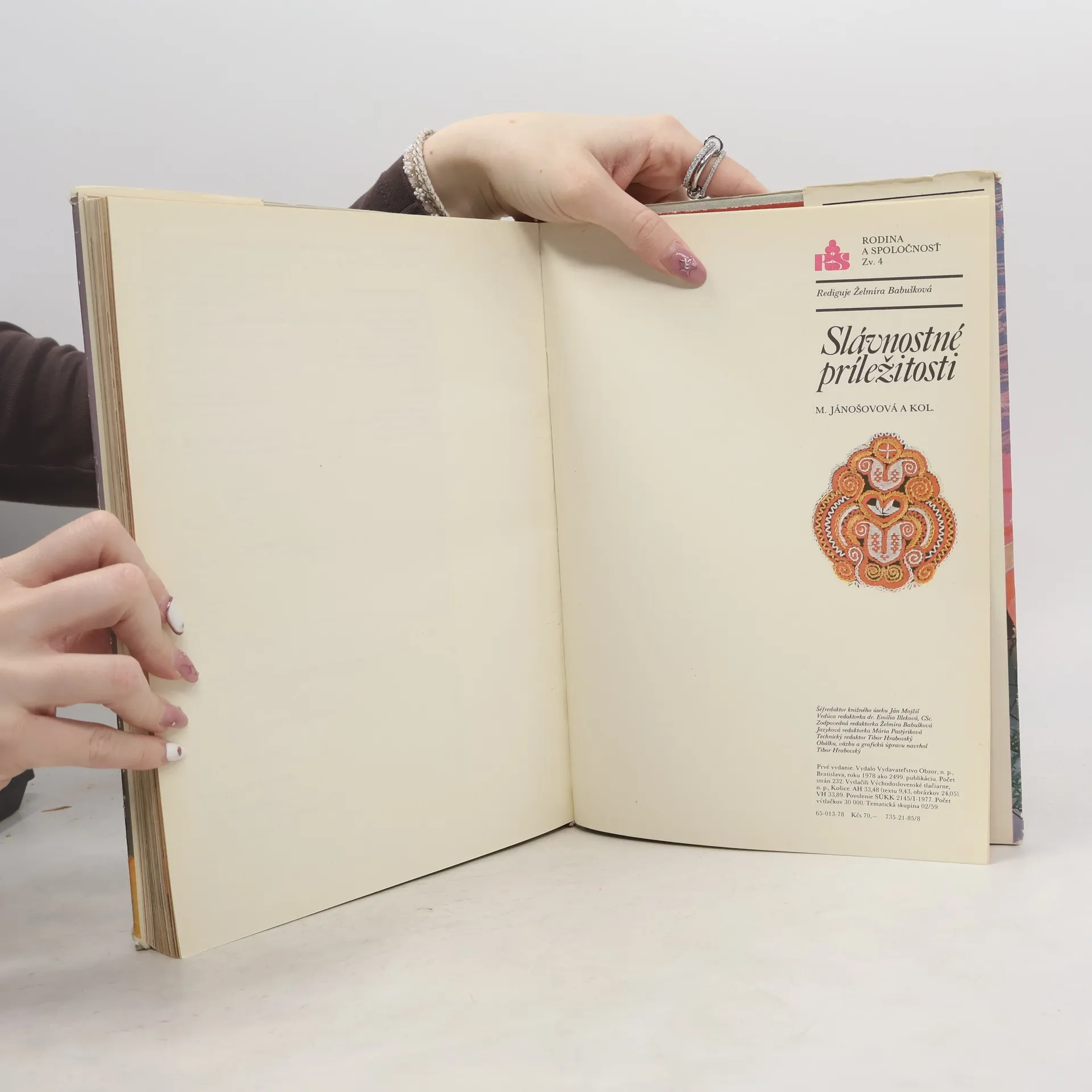 Kapitoly: Malý lexikon spoločenského správania sa, Etiketa stolovania, Malé rodinné slávnosti, Veľké rodinné slávnosti, Detské slávnosti, Pohostenie na chate, Sviatky jari, Vianoce a Silvester, Darčeky. 1. vydanie
