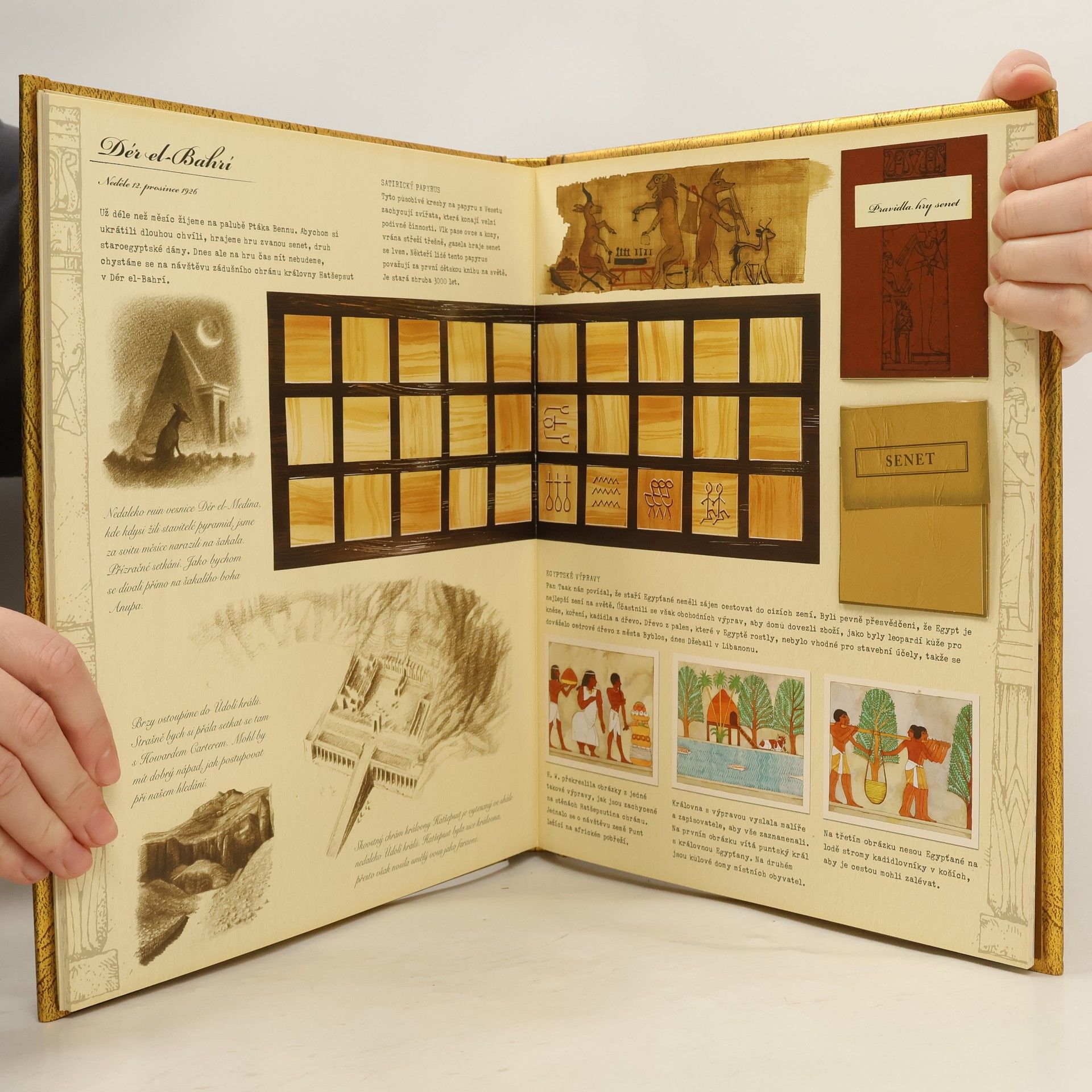 Výpravná publikace o starověkém Egyptě je faksimile deníku Britky Emily Sandsové, která se v r. 1926 vydala hledat hrobku boha Usira. Emily začíná putování v Káhiře za doprovodu pětice, v níž jsou i výtvarníci, pořizující dokumentaci. Expedice navštíví všechna významná místa, kde by mohla získat Usirovu stopu, a připomene historii, faraony, bohy, hieroglyfy aj. Na ostrově Biga skupinka něco objeví. Ale deník Emily Sandsové nečekaně končí… Co se stalo s expedicí?