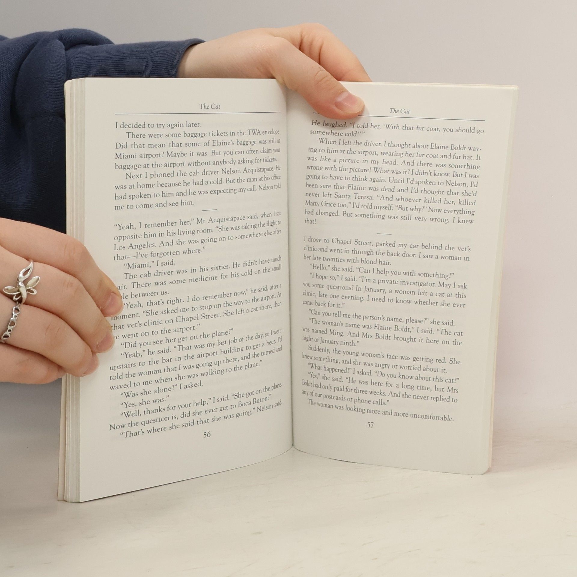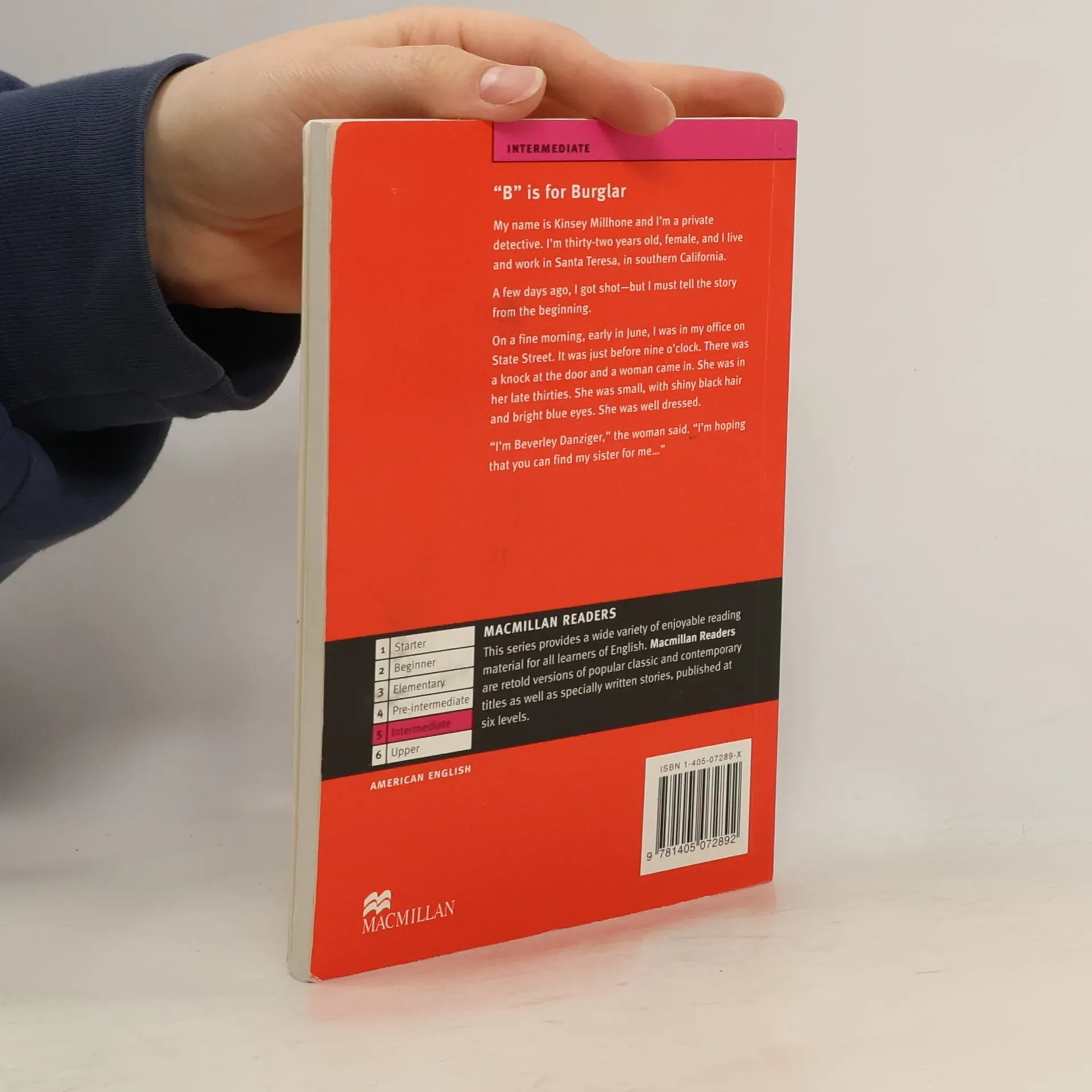 "My name is Kinsey Millhone and I'm a private detective. I'm thirty-two years old, and I live and work in Santa Terersa, in Southern California. A few days ago, I got shot - but I must tell the story from the beginning. On a fine morning early in June, I was in my office on State Street. It was just before nine o'clock. There was a knock at the door and a woman came in. She was in her late thirties. She was small, with shiny black hair and bright blue eyes. She was well dressed. "I'm Beverley Danziger," the woman said. "I'm hoping that you can find my sister for me." -- Cover.