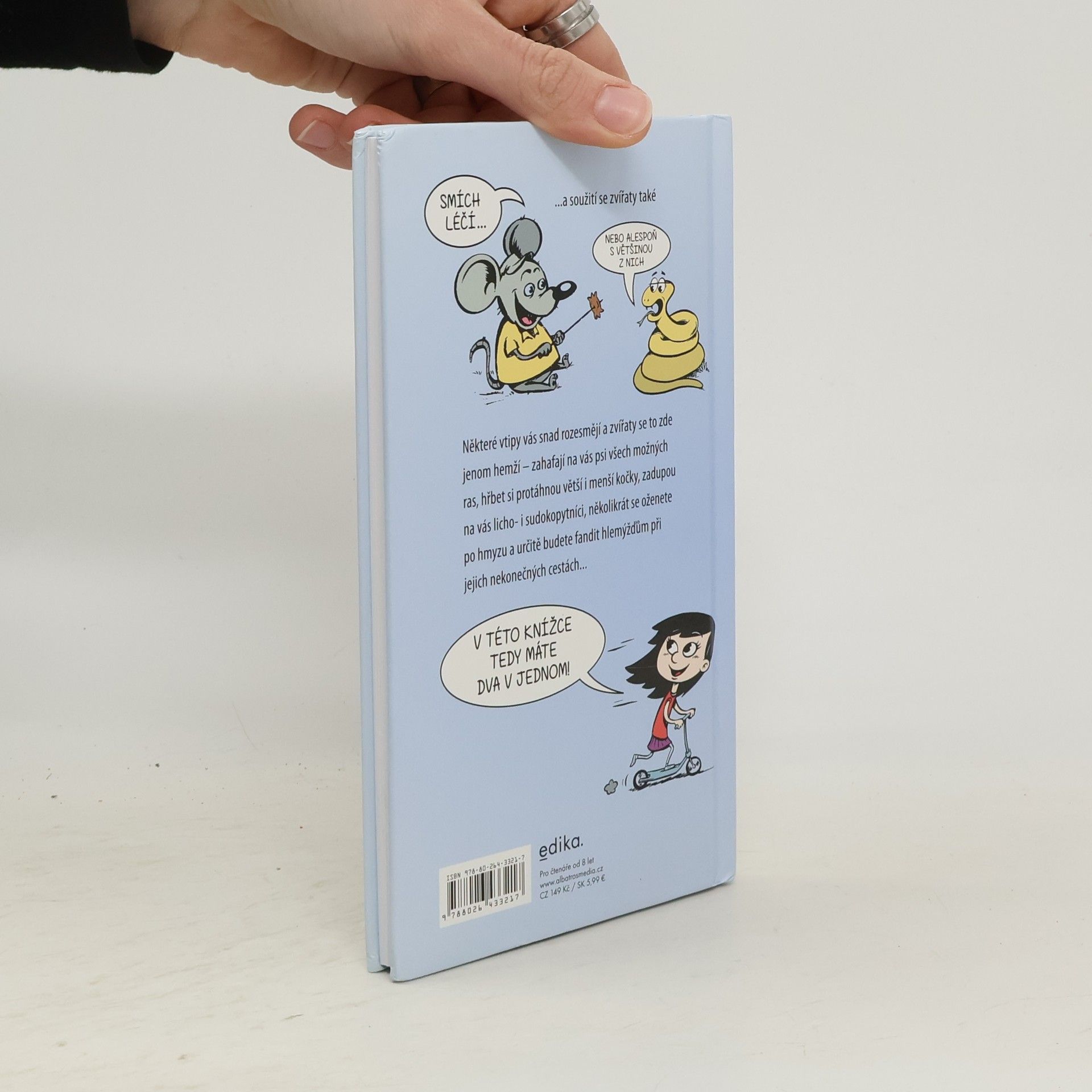 Smích léčí… a soužití se zvířaty také. Nebo alespoň s většinou z nich. Některé vtipy vás snad rozesmějí a zvířaty se to zde jenom hemží – zahafají na vás psi všech možných ras, hřbet si protáhnou větší i menší kočky, zadupou na vás licho- i sudokopytníci, několikrát se oženete po hmyzu a určitě budete fandit hlemýžďům při jejich nekonečných cestách... V této knížce tedy máte dva v jednom!