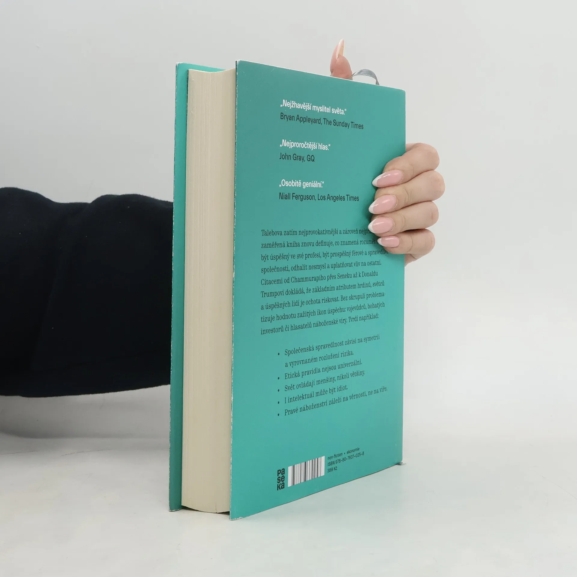 Talebova zatím nejprovokativnější a zároveň nejpraktičtěji zaměřená kniha znovu definuje, co znamená rozumět světu, být úspěšný ve své profesi, být prospěšný férové a spravedlivé společnosti, odhalit nesmysl a uplatňovat vliv na ostatní. Citacemi od Chamurappiho přes Seneku až k Donaldu Trumpovi dokládá, že základním atributem hrdinů, světců a úspěšných lidí je ochota riskovat. Bez skrupulí problematizuje hodnotu zažitých ikon úspěchu: vojevůdců, bohatých investorů či hlasatelů náboženské víry. Tvrdí například: - Společenská spravedlnost závisí na symetrii a vyrovnaném rozložení rizika. Není risku - není zisku platí i naopak. Ostatní nemohou nést rizika vašeho podnikání. - Etická pravidla nejsou univerzální. Vaše vlastní bublina je pořád menší než lidstvo samo. Svět ovládají menšiny, nikoli většiny, ne konsensus, ale vkus a etika, kterou vnutí tvrdohlavé menšiny ostatním. - Pozor na složitá (zpoplatněná) řešení. Nač posilovat na drahém stroji - stačí činka. - Pravé náboženství záleží na věrnosti, ne na víře. Sílu víry dokládá jedině ochota riskovat pro ni vlastní kůži.