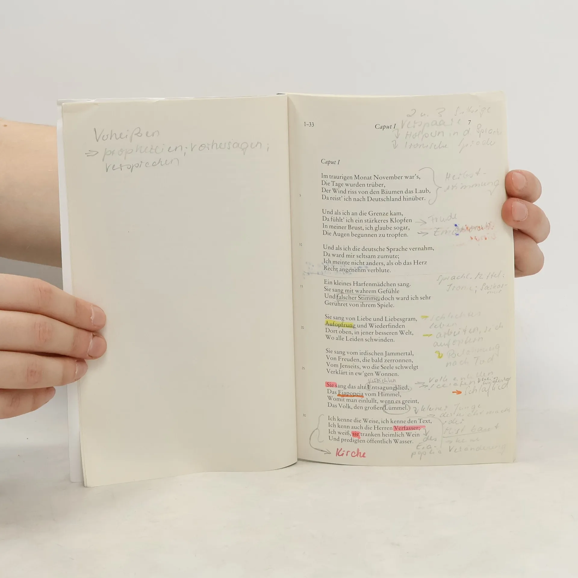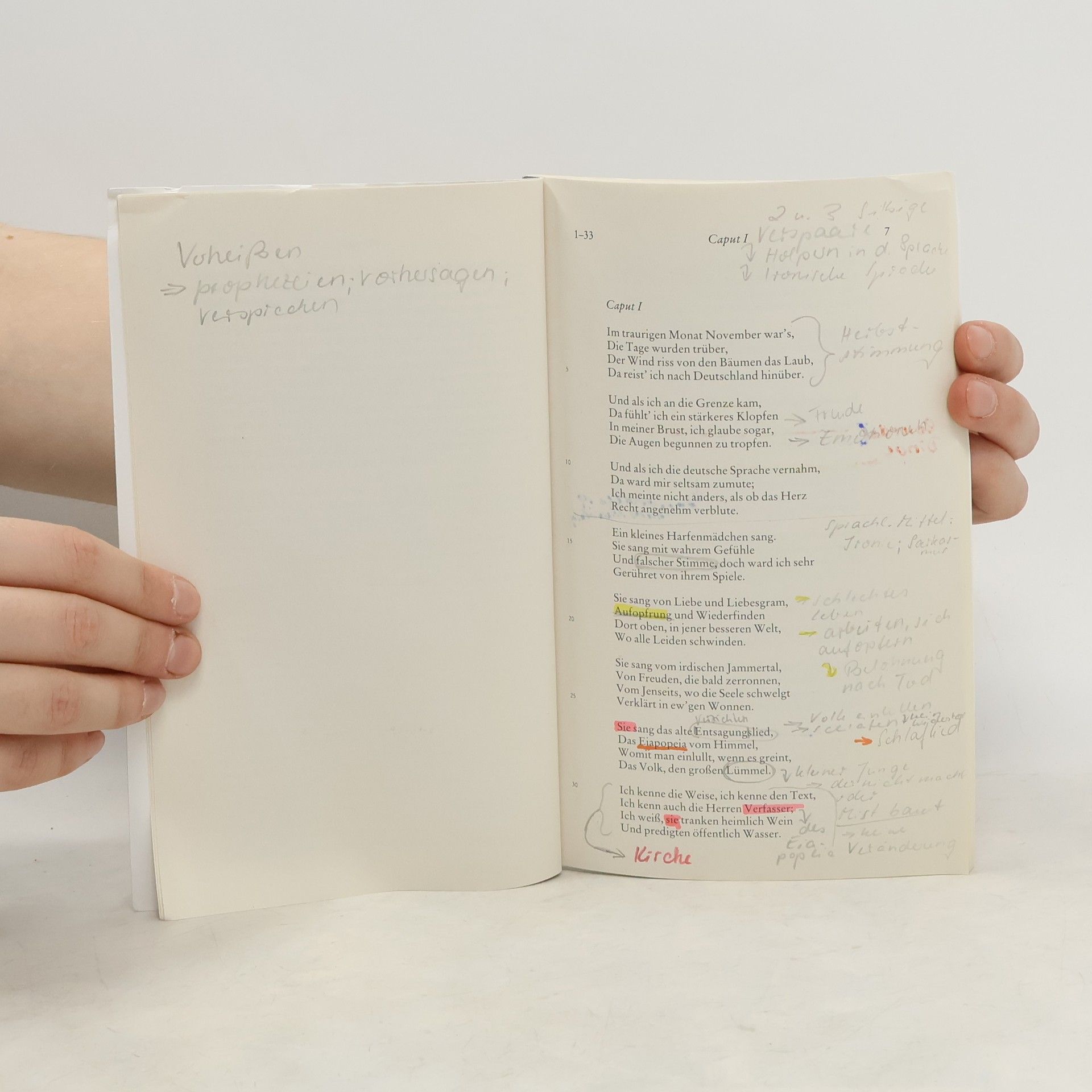 „Deutschland. Ein Wintermärchen“ ist das literarische Ergebnis einer Deutschlandreise Heinrich Heines im Jahre 1843. Als „Fremder“, der Deutschland bereits 1931 verlassen hatte, da die Heimat ihm als Schriftsteller und promoviertem Juristen keine beruflichen Entfaltungsmöglich-keiten bot, kehrt er für einige Wochen zurück, um seine Mutter und seinen Hamburger Verleger Campe zu treffen. Aus der Distanz betrachtet er das erstarrte Deutschland der Restaurationszeit und übt harsche Kritik an den gesellschaftlichen, politischen und kulturellen Verhältnissen. Heines „Reisebild“, wie er es selbst nannte, ist nur auf den ersten Blick eine reine Reisebeschreibung mit den Stationen Aachen, Köln, Teutoburger Wald, Minden, Hannover und Hamburg – es ist Satire, entstanden unmittelbar nach der Rückkehr ins französische Exil. Als das Werk 1844 erschien, sah Heine sich massiv den Angriffen der Presse ausgesetzt, es wurde verboten und zensiert. Noch im selben Jahr wurde es aber ungekürzt in der von Karl Marx herausgegebenen Pariser sozialrevolutionären Schrift „Vorwärts“ abgedruckt. „Deutschland. Ein Wintermärchen“ zeigt die Sicht des Emigranten Heine, der, obwohl er am Deutschland der damaligen Zeit radikale politische Kritik übt, sich gleichwohl diesem noch verbunden fühlt und eine Umkehr herbeiwünscht: „Pflanzt die schwarzrotgoldne Fahne auf die Höhe des deutschen Gedankens, macht sie zur Standarte des freien Menschtums, und ich will mein bestes Herzblut für sie hingeben. Beruhigt euch, ich liebe das Vaterland ebenso sehr wie ihr“ (aus Heines Vorwort). Heines satirisches Versepos bildet den Höhepunkt seines Werks und nimmt in der Dichtung des 19. Jahrhunderts eine besondere Stellung ein.