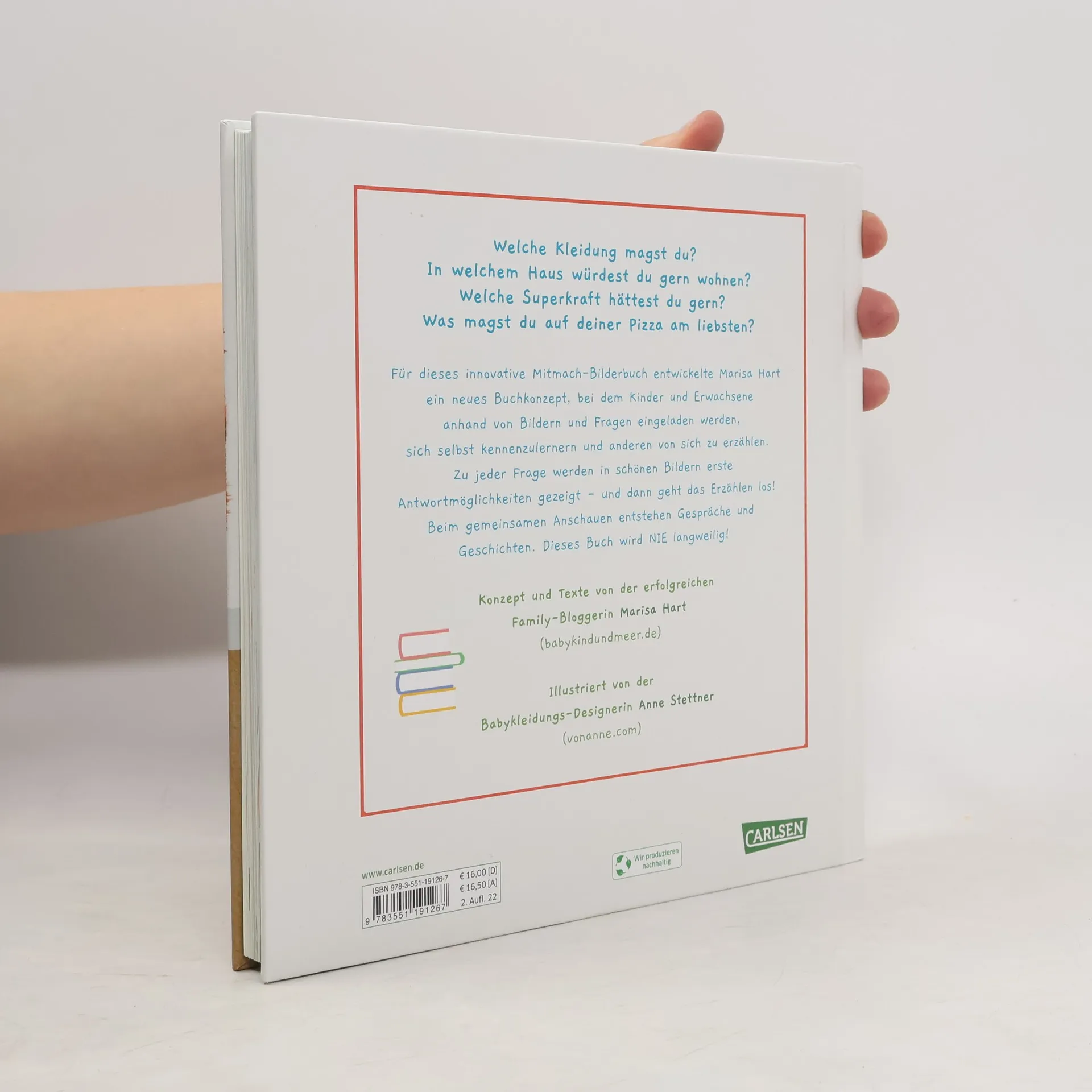 "Welche Kleidung magst du? In welchem Haus würdest du gerne wohnen? Welche Superkraft hättest du gern? Was magst du auf deiner Pizza am liebsten? Für dieses innovative Mitmach-Bilderbuch entwickelte Marisa Hart ein neues Buchkonzept, bei dem Kinder und Erwachsene anhand von Bildern und Fragen eingeladen werden, sich selbst kennenzulernern und anderen von sich zu erzählen. Zu jeder Frage werden in schönen Bildern erste Antwortmöglichkeiten gezeigt - und dann geht das Erzählen los! Beim gemeinsamen Anschauen entstehen Gespräche und Geschichten. Dieses Buch wird NIE langweilig!" --
