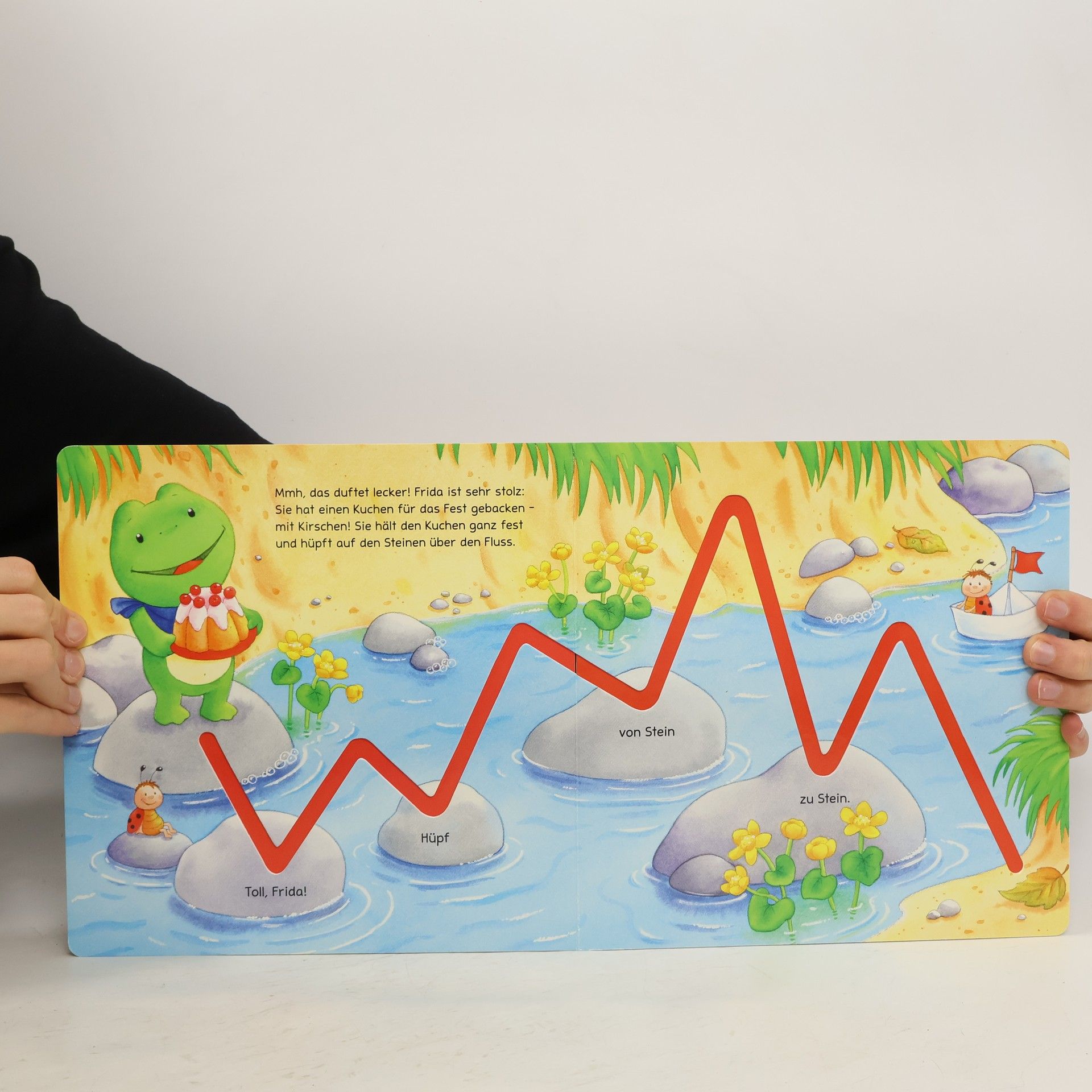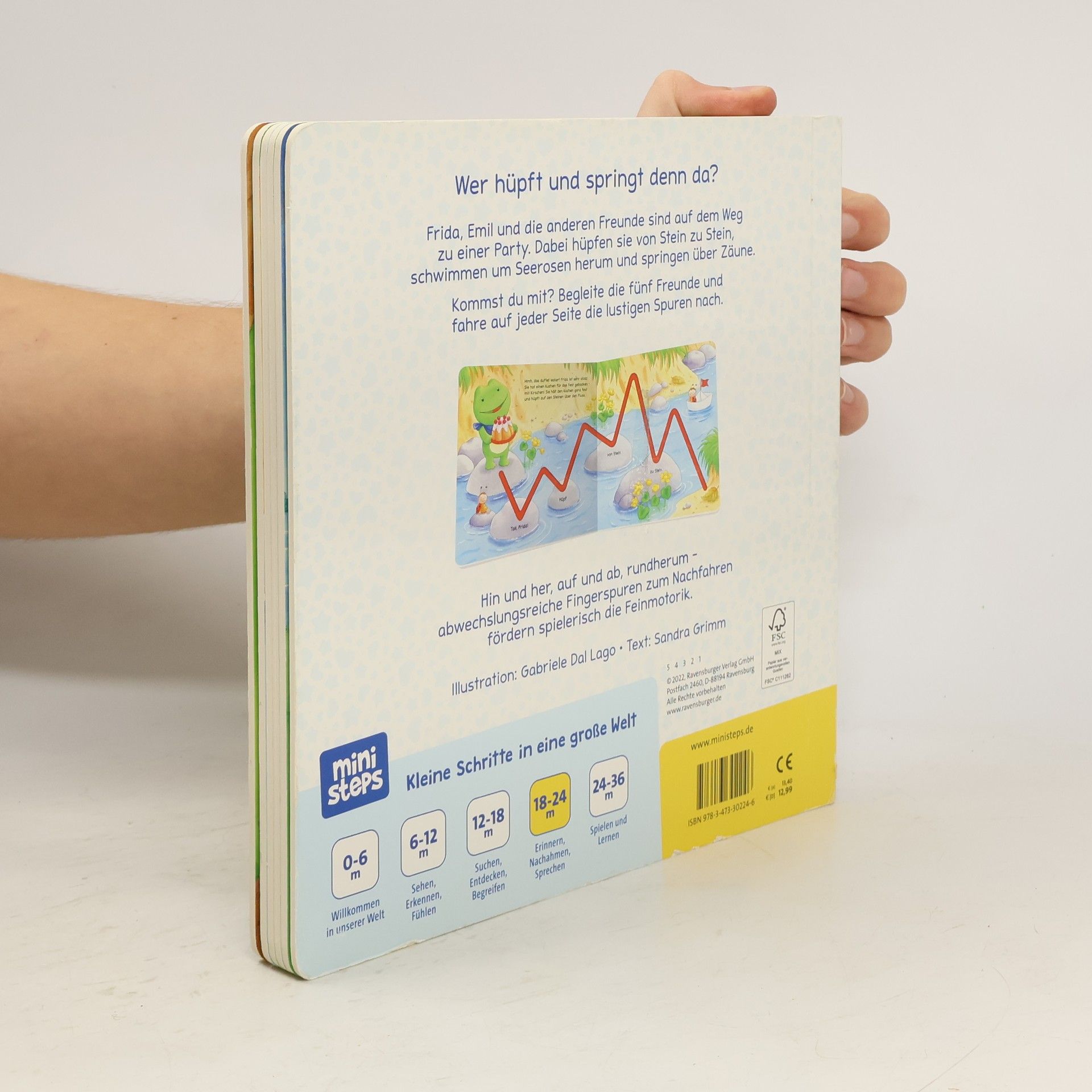 Alle sind unterwegs Bär Butz feiert ein Fest und alle Freunde machen sich auf den Weg. Um zur Party zu gelangen, stapft Hase Pelle zwischen Sonnenblumen hindurch, hüpft Frosch Frida von Stein zu Stein und Ente Emil schwimmt geschickt um Seerosen herum. Dank der Fingerspuren können die Kinder den Weg der fünf ministeps Freunde nachverfolgen und die verschiedenen Spuren mit dem Finger nachfahren: mal hoch und runter, mal in lustigen Bögen und mal im Kreis – das macht Spaß und schult spielerisch die Feinmotorik. ministeps Produkte begleiten Kleinkinder Schritt für Schritt bei ihrer geistigen und körperlichen Entwicklung. Sie sind in Form und Konzept genau auf den jeweiligen Entwicklungsschritt der Kleinen abgestimmt und wurden mit Pädagogen entwickelt. So fördern sie Kinder altersgerecht und mit viel Spaß! Alle ministeps Spielzeuge und Bücher bestehen aus unbedenklichen Materialien.
