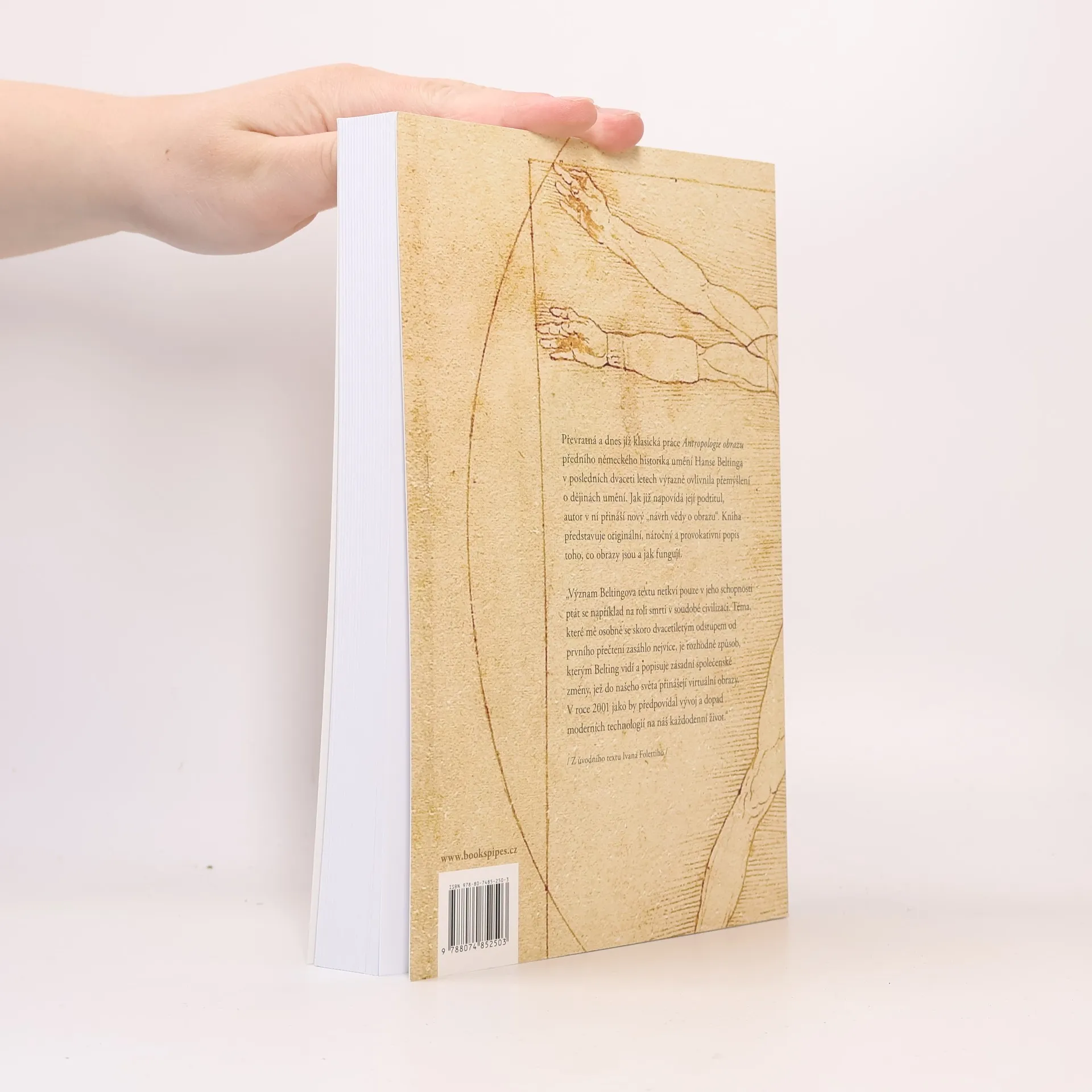 Převratná a dnes již klasická práce Antropologie obrazu předního německého historika umění Hanse Beltinga v posledních dvaceti letech výrazně ovlivnila přemýšlení o dějinách umění. Jak již napovídá její podtitul, autor v ní přináší nový „návrh vědy o obrazu“. Kniha představuje originální, náročný a provokativní popis toho, co obrazy jsou a jak fungují. „Význam Beltingova textu netkví pouze v jeho schopnosti ptát se například na roli smrti v soudobé civilizaci. Téma, které mě osobně se skoro dvacetiletým odstupem od prvního přečtení zasáhlo nejvíce, je rozhodně způsob, kterým Belting vidí a popisuje zásadní společenské změny, jež do našeho světa přinášejí virtuální obrazy. V roce 2001 jako by předpovídal vývoj a dopad moderních technologií na náš každodenní život.“ / Z úvodního textu Ivana Folettiho /