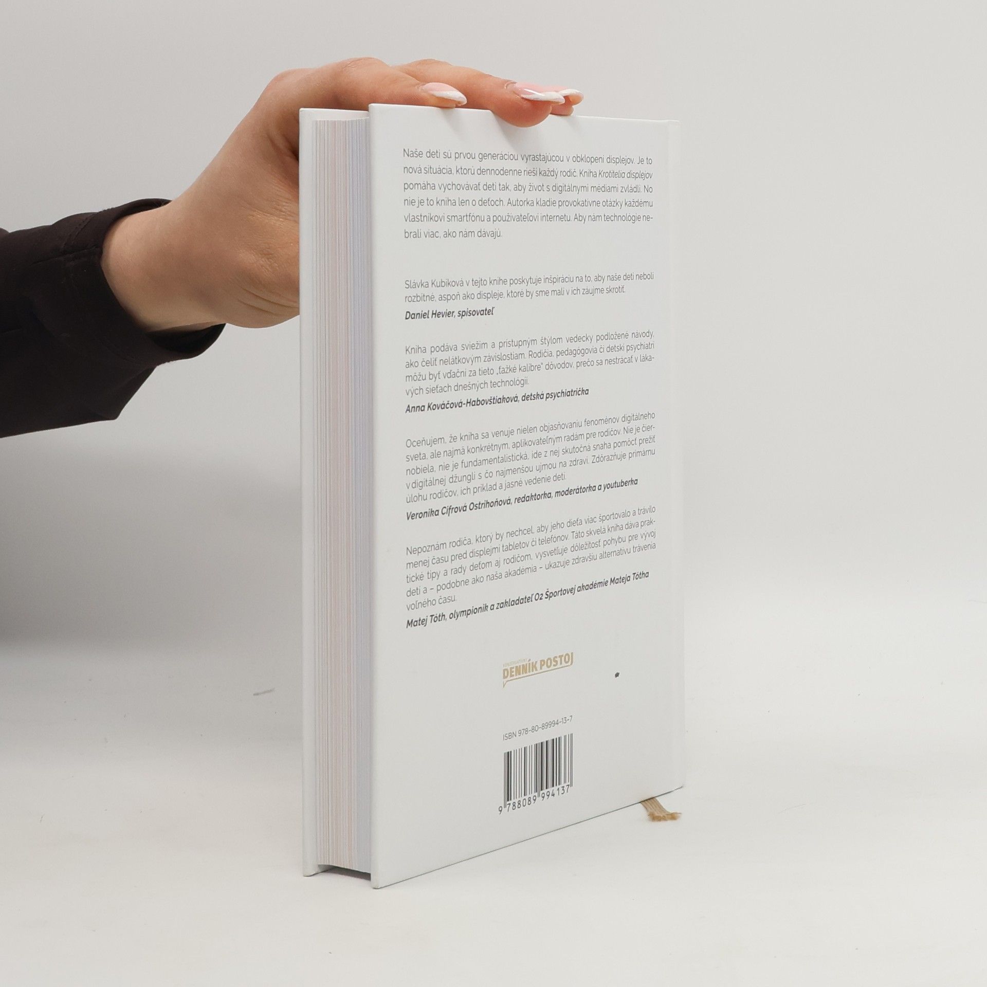 Naše deti sú prvou generáciou vyrastajúcou v obklopení displejov. Je to nová situácia, ktorú dennodenne rieši každý rodič. Kniha Krotitelia displejov pomáha vychovávať deti tak, aby život s digitálnymi médiami zvládli. No nie je to kniha len o deťoch. Autorka kladie provokatívne otázky každému vlastníkovi smartfónu a používateľovi internetu. Aby nám technológie nebrali viac, ako nám dávajú.