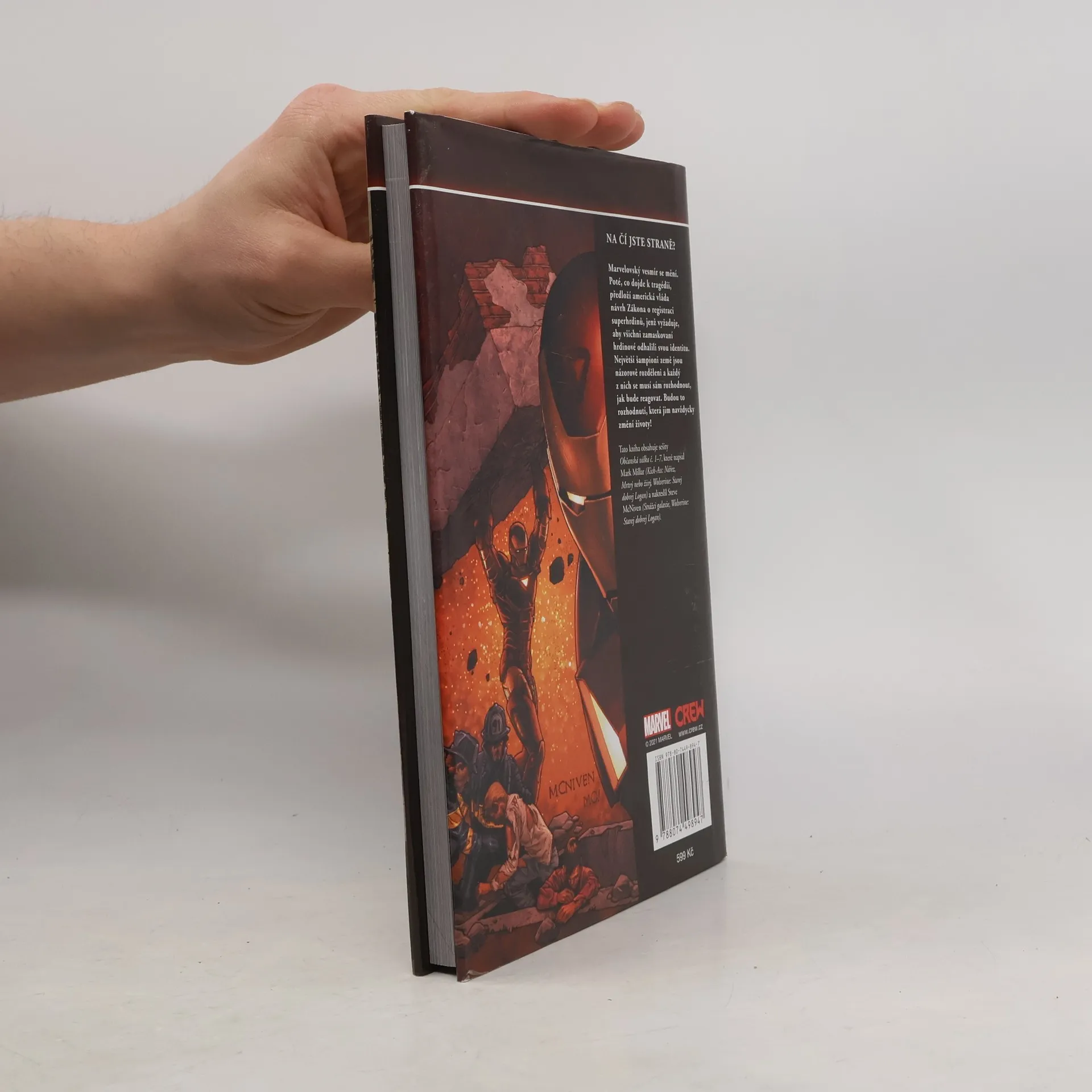 NA ČÍ JSTE STRANĚ? Marvelovský vesmír se mění. Poté, co dojde k tragédii, předloží americká vláda návrh Zákona o registraci superhrdinů, jenž vyžaduje, aby všichni zamaskovaní hrdinové odhalili svou identitu. Největší šampioni země jsou názorově rozděleni a každý z nich se musí sám rozhodnout, jak bude reagovat. Budou to rozhodnutí, která jim navždycky změní životy! Tato kniha obsahuje sešity Občanská válka č. 1–7, které napsal Mark Millar (Kick-Ass: Nářez, Mrtvý nebo živý, Wolverine: Starej dobrej Logan) a nakreslil Steve McNiven (Strážci galaxie, Wolverine: Starej dobrej Logan).