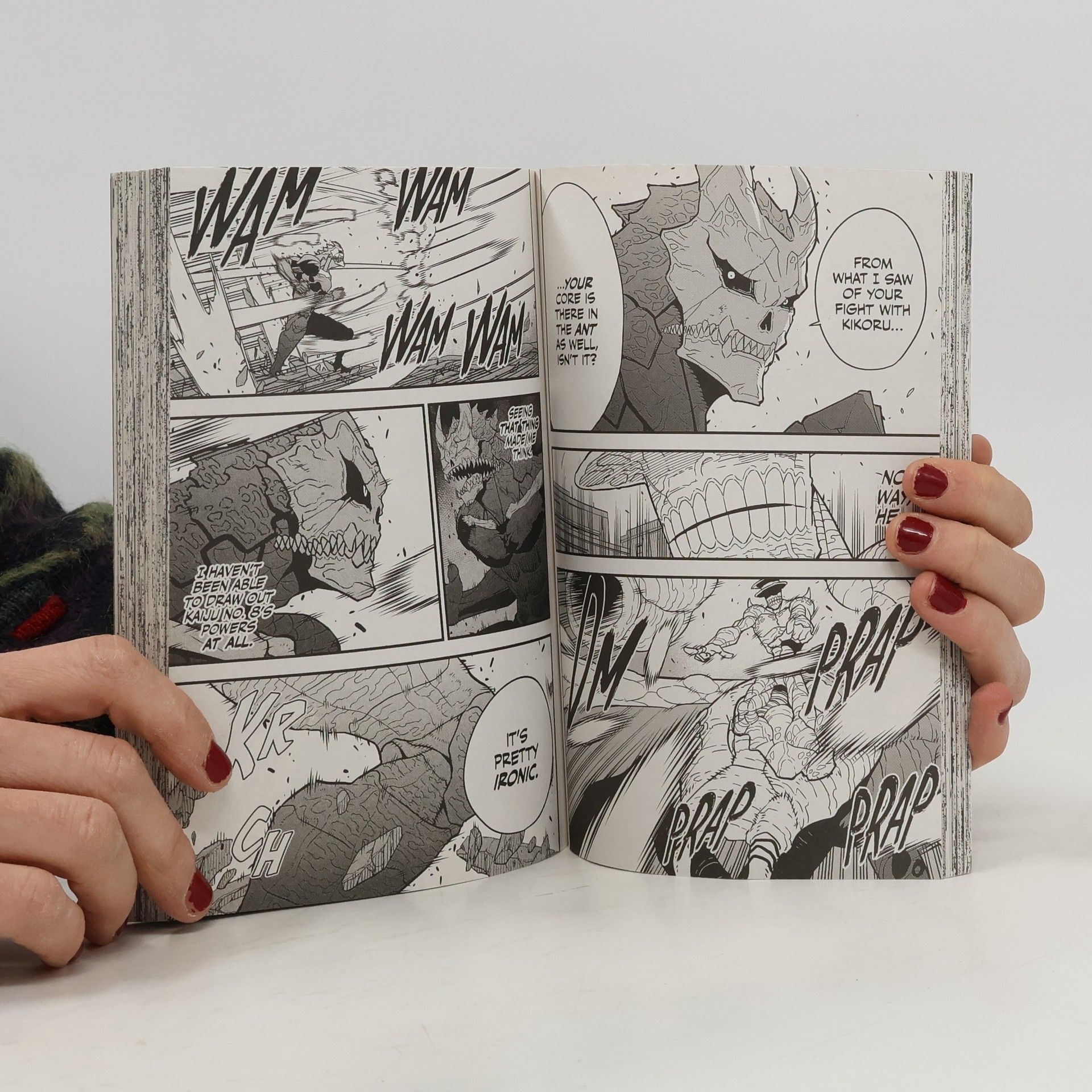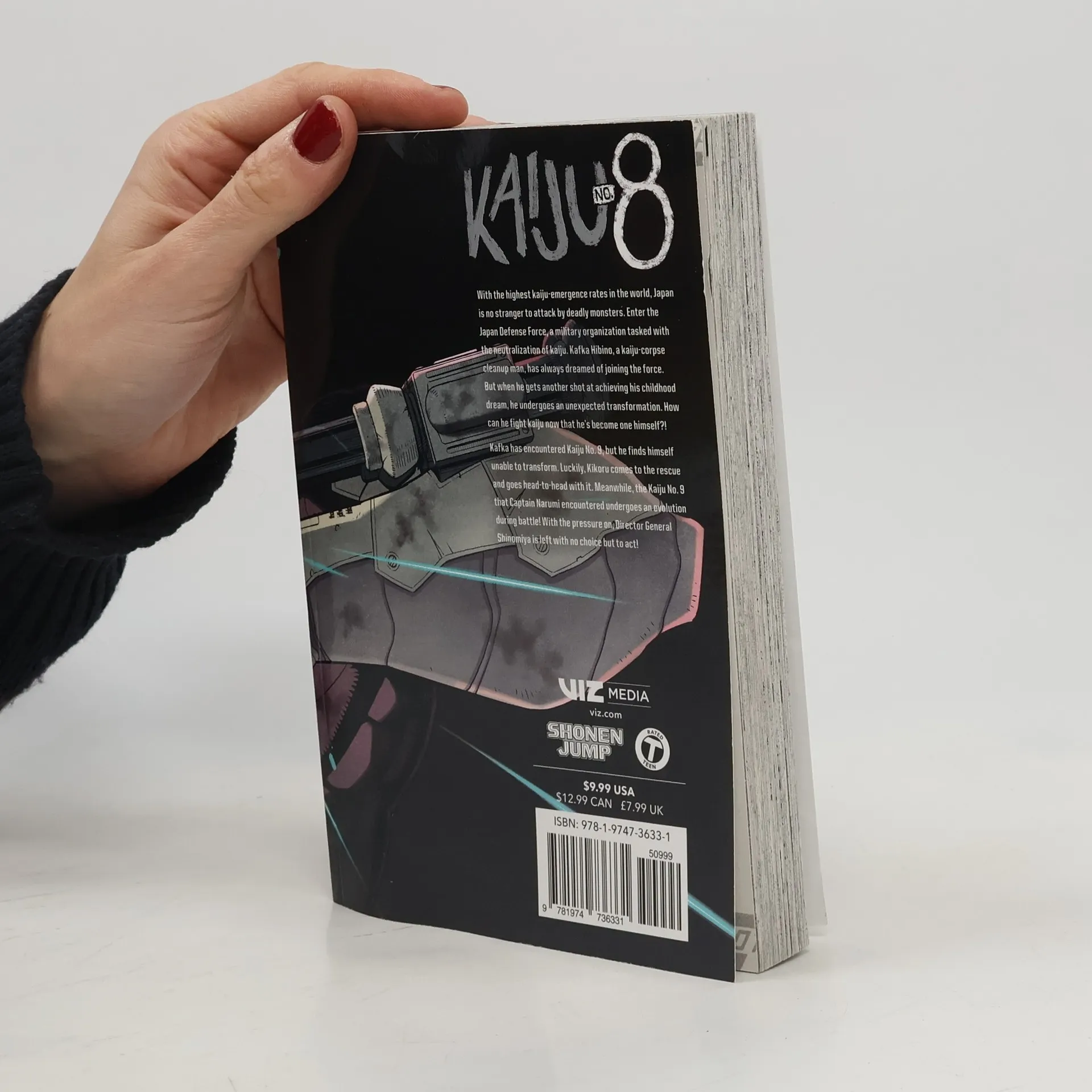 Kafka wants to clean up kaiju, but not literally! Will a sudden metamorphosis stand in the way of his dream? With the highest kaiju-emergence rates in the world, Japan is no stranger to attack by deadly monsters. Enter the Japan Defense Force, a military organisation tasked with the neutralisation of kaiju. Kafka Hibino, a kaiju-corpse cleanup man, has always dreamed of joining the force. But when he gets another shot at achieving his childhood dream, he undergoes an unexpected transformation. How can he fight kaiju now that he's become one himself?! Kafka has encountered Kaiju No. 9, but he finds himself unable to transform. Luckily, Kikoru comes to the rescue and goes head-to-head with it. Meanwhile, the Kaiju No. 9 that Captain Narumi encountered undergoes an evolution during battle! With the pressure on, Director General Shinomiya is left with no choice but to act!