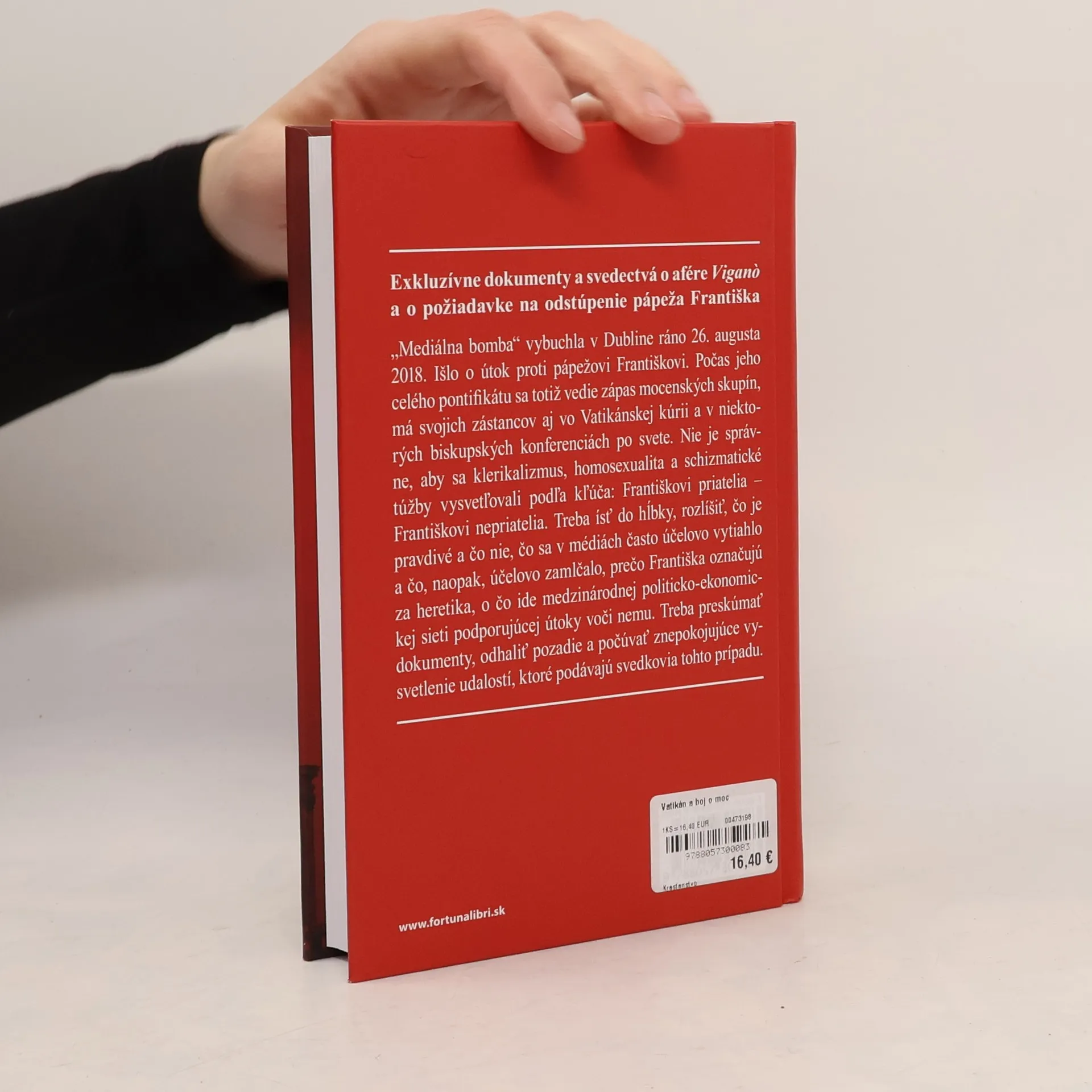 Konflikty, zneužívania a škandály. Čo sa skutočne deje v katolíckej cirkvi? Exkluzívne dokumenty a svedectvá o afére Vigano a o požiadavke na odstúpenie pápeža Františka. „Mediálna bomba“ vybuchla v Dubline ráno 26. augusta 2018. Išlo o pokus o „prevrat“ proti pápežovi Františkovi. Počas jeho celého pontifikátu sa totiž vedie zápas mocenských skupín, má svojich zástancov aj vo Vatikánskej kúrii a v niektorých biskupských konferenciách po svete. Nie je správne, aby sa klerikalizmus, loby gej a schizmatické túžby vysvetľovali podľa kľúča: Františkovi priatelia – Františkovi nepriatelia. Treba ísť do hĺbky, rozlíšiť, čo je pravdivé a čo nie, čo sa v médiách často účelovo vytiahlo a čo, naopak, účelovo zamlčalo, prečo Františka označujú za heretika, o čo ide medzinárodnej politicko-ekonomickej sieti podporujúcej útoky voči nemu. Treba preskúmať dokumenty, odhaliť pozadie a počúvať znepokojujúce vysvetlenie udalostí, ktoré podávajú svedkovia tohto prípadu.