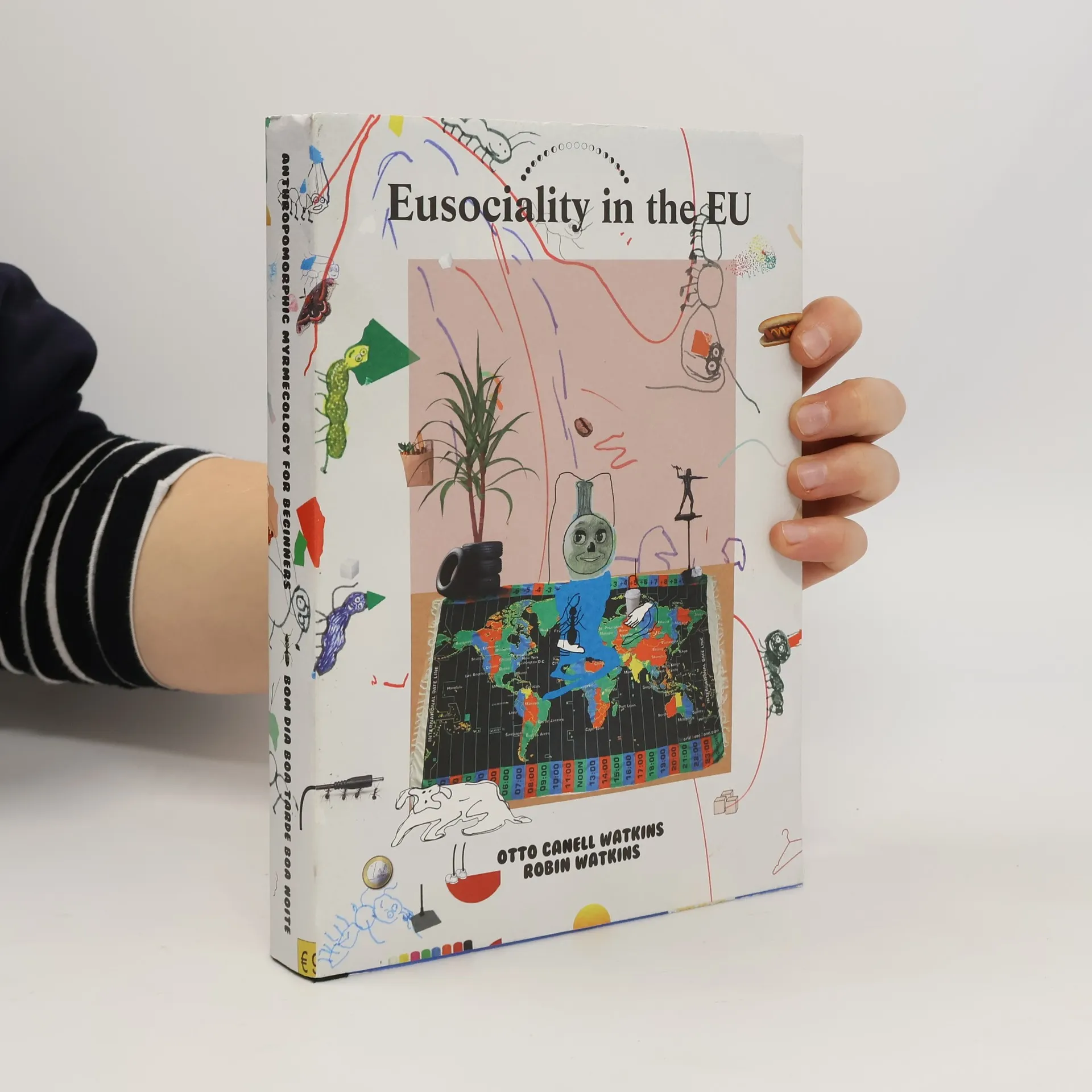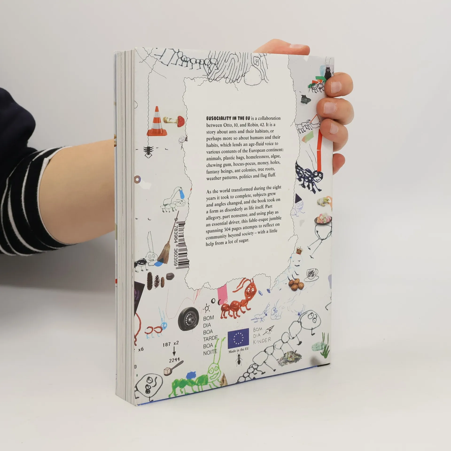 Eusociality in the EU is a collaboration between Otto (10) and Robin (42). It is a book about ants and their habitats, or perhaps more so about humans and their habits, which lends an age-fluid voice to various contents of the European continent: animals, plastic bags, homelessness, algae, chewing gum, hocus-pocus, money, holes, ant colonies, fantasy beings, tree roots, weather patterns, politics and flag-fluff. As the world transformed during the eight years it took to complete, subjects grew and angles changed, and the book took on a form as disorderly as life itself. Part allegory, part nonsense, and using play as an essential driver, this fable-esque jumble spanning 304 pages attempts to reflect on community beyond society - with a little help from a lot of sugar.