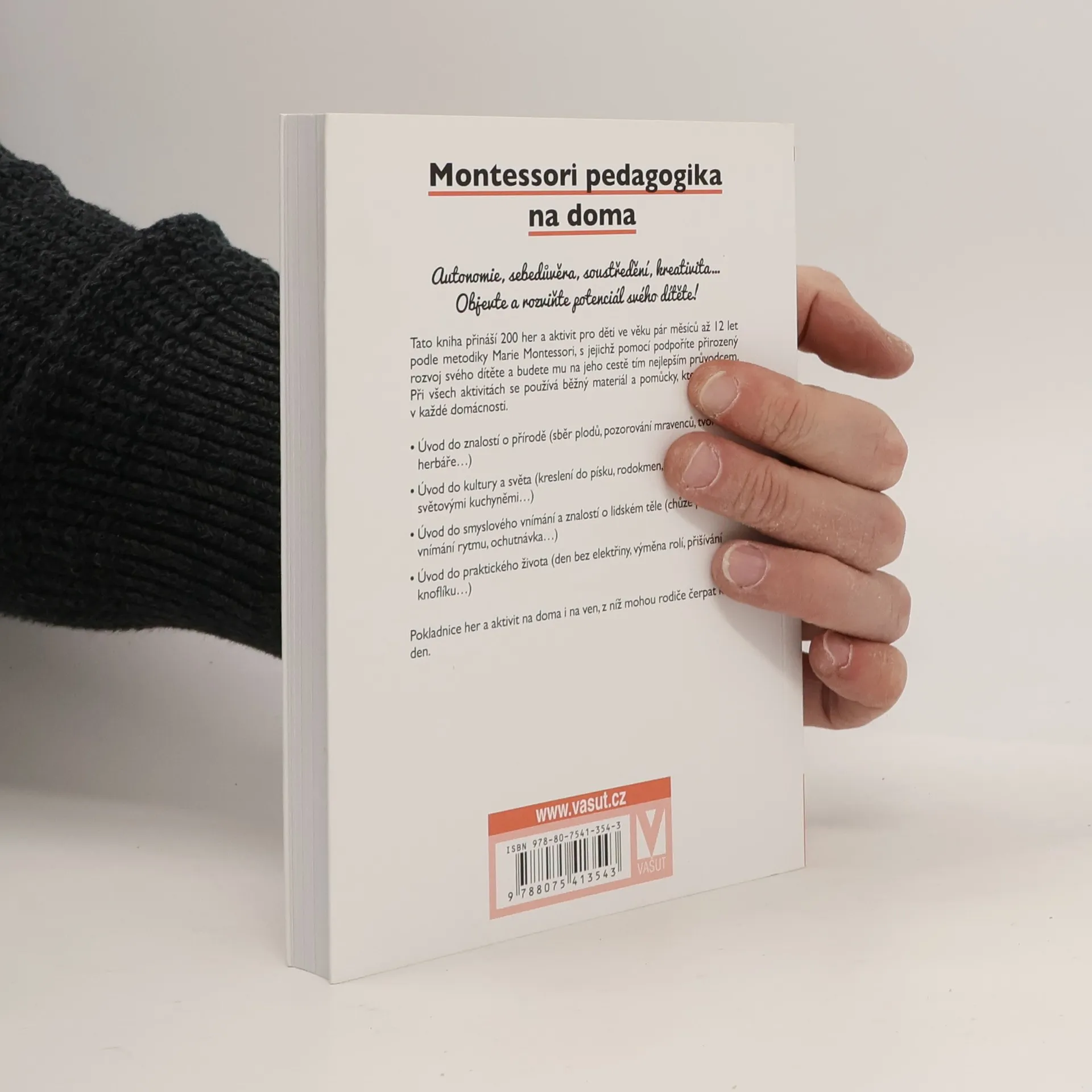 Tato kniha přináší 200 her a aktivit pro děti ve věku pár měsíců až 12 let podle metodiky Marie Montessori, s jejichž pomocí podpoříte přirozený rozvoj svého dítěte a budete mu na jeho cestě tím nejlepším průvodcem. Některé jsou určeny na ven, jiné na doma. Při všech se používá běžný materiál a pomůcky, které najdete v každé domácnosti. Aktivity tematicky rozvíjejí dítě ve znalostech o přírodě, kultuře a světě kolem nás, o lidském těle a smyslech a podporují osvojení praktických dovedností.