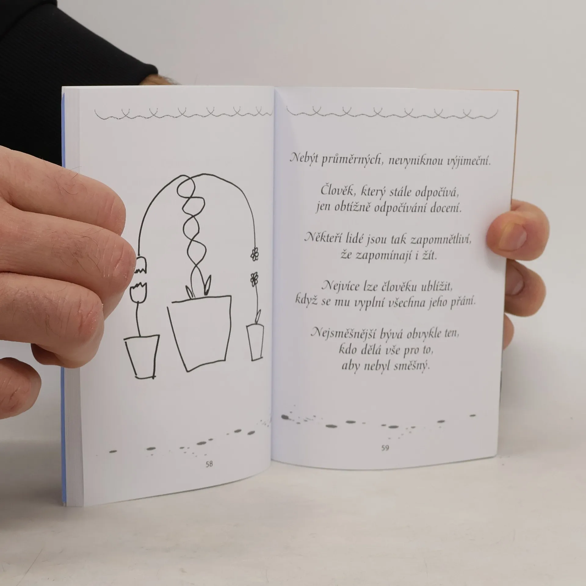 Nová knížka vážně i nevážně míněných aforismů autora, proslulého svými knihami dvojverší, jednoverší, půlverší a čtvrtverší, které už mají své místo v České knize rekordů. Rýmované i nerýmované aforismy jsou doplněné autorovými kresbami. Knížka, která pobaví, potěší i poučí!