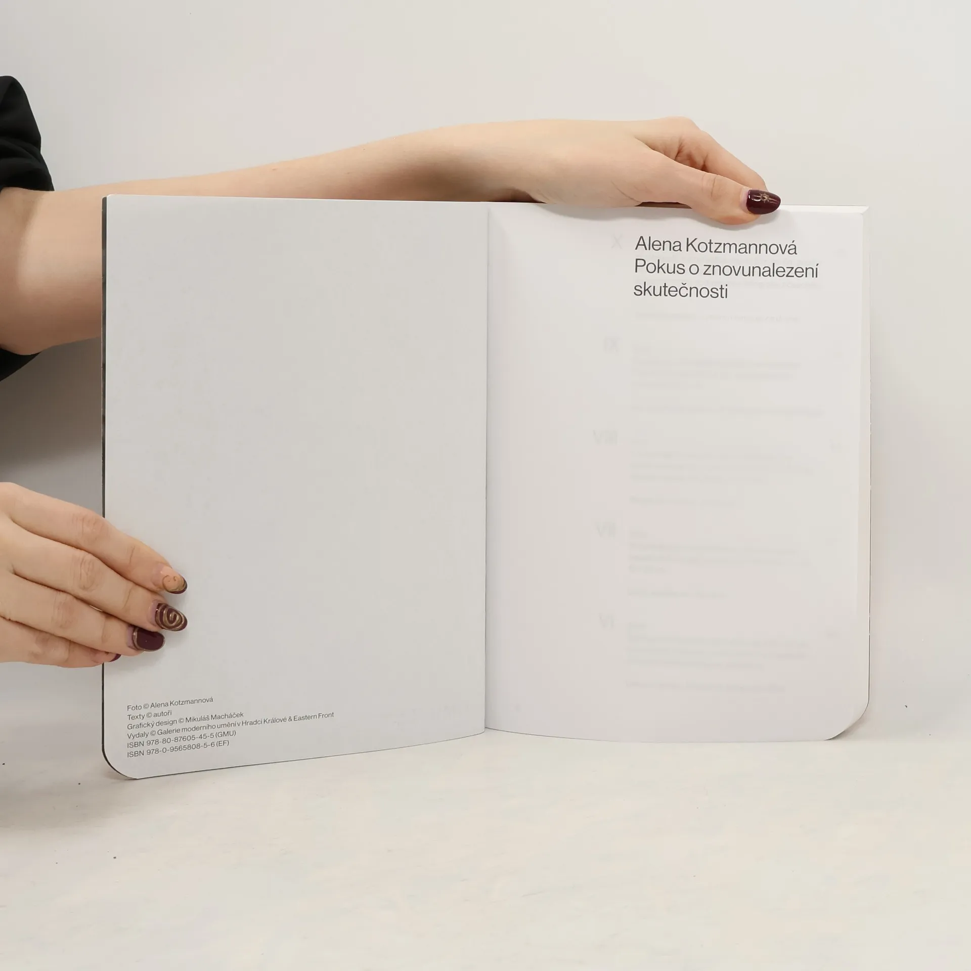 Alena Kotzmannová (*1974) vytvořila v letech 20092019 celkem 10 kapitol série Pokusů, které konfrontují fotografie, tisky a objekty uspořádané do významotvorných řad. Každá ze sérií vychází z jednoho nalezeného záběru či objektu, v němž se autorka snaží objevit můstek, jenž ho propojí s obrazy z jejího vlastního archivu, a zkoumá tak možnosti souvislostí. Nehledá, co se děje na konkrétních obrazech, ale spíše v prostoru mezi nimi. Nechává na divákovi, jakým způsobem propojí vnitřní vazby mezi jednotlivými vyobrazeními a ve výsledku je vztáhne k původnímu motivu. Rovněž každý z textů autorů a autorek, kteří přispívají do této knihy, přistupuje k vybrané kapitole zcela odlišně a svébytným způsobem nabízí rozšířené možnosti čtení dané vizuální zprávy. V knize se tak prolínají teoretické texty s beletristickou prózou a poezií.